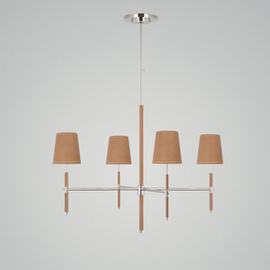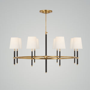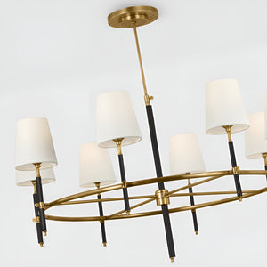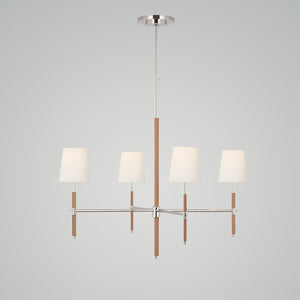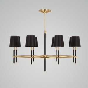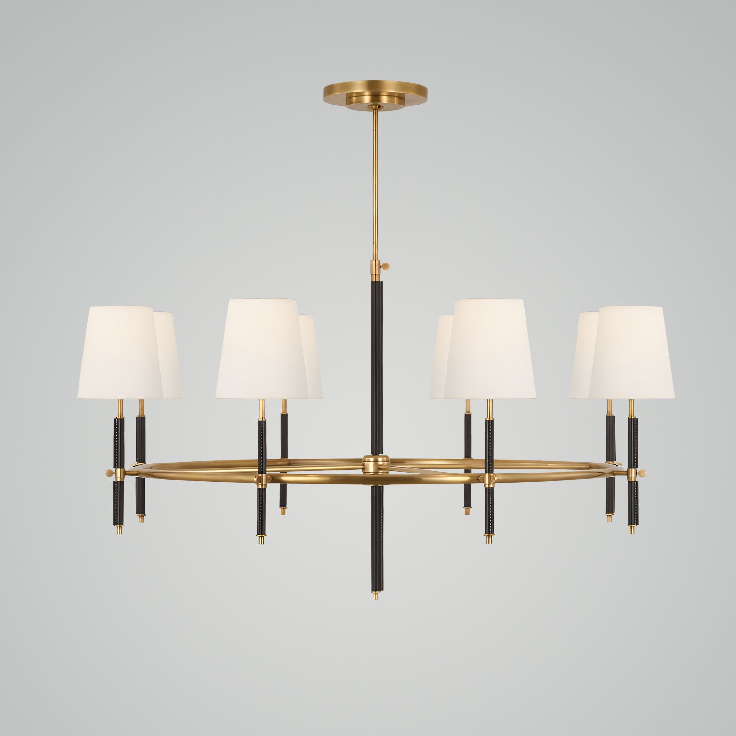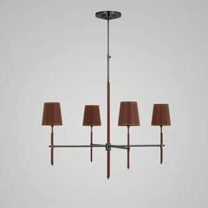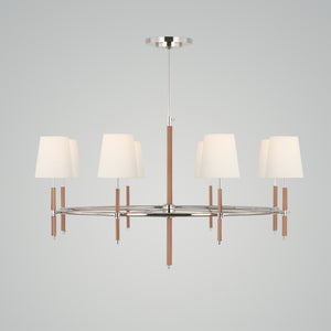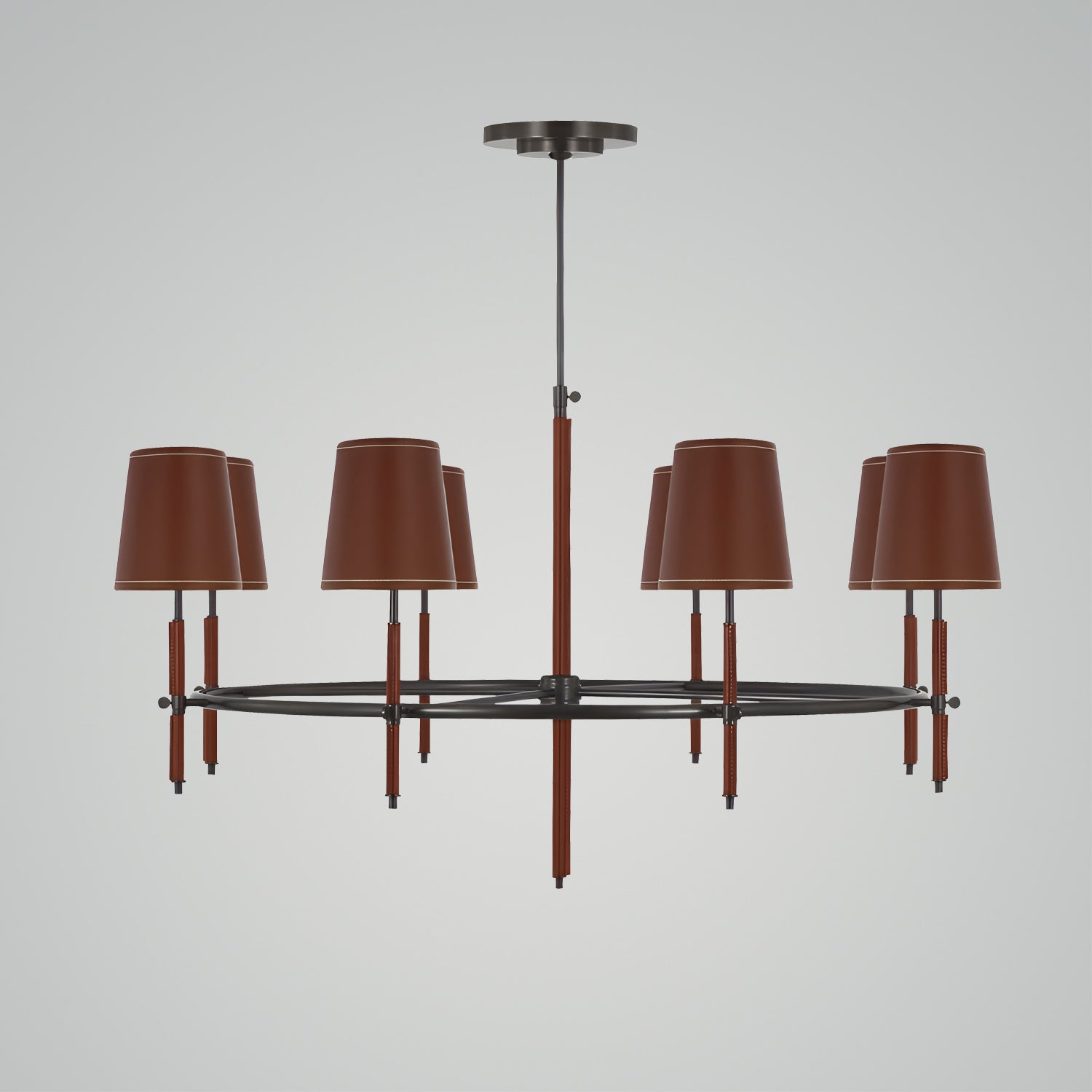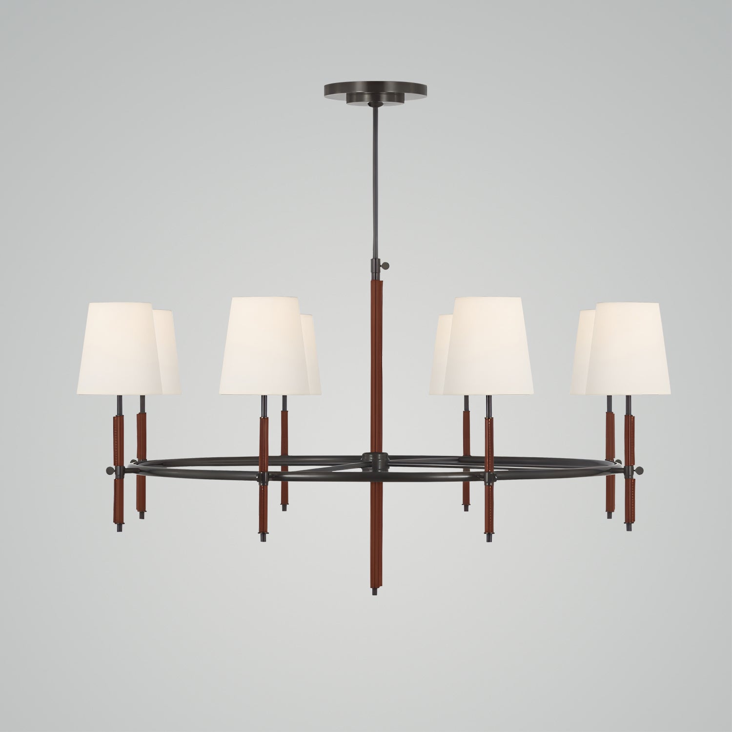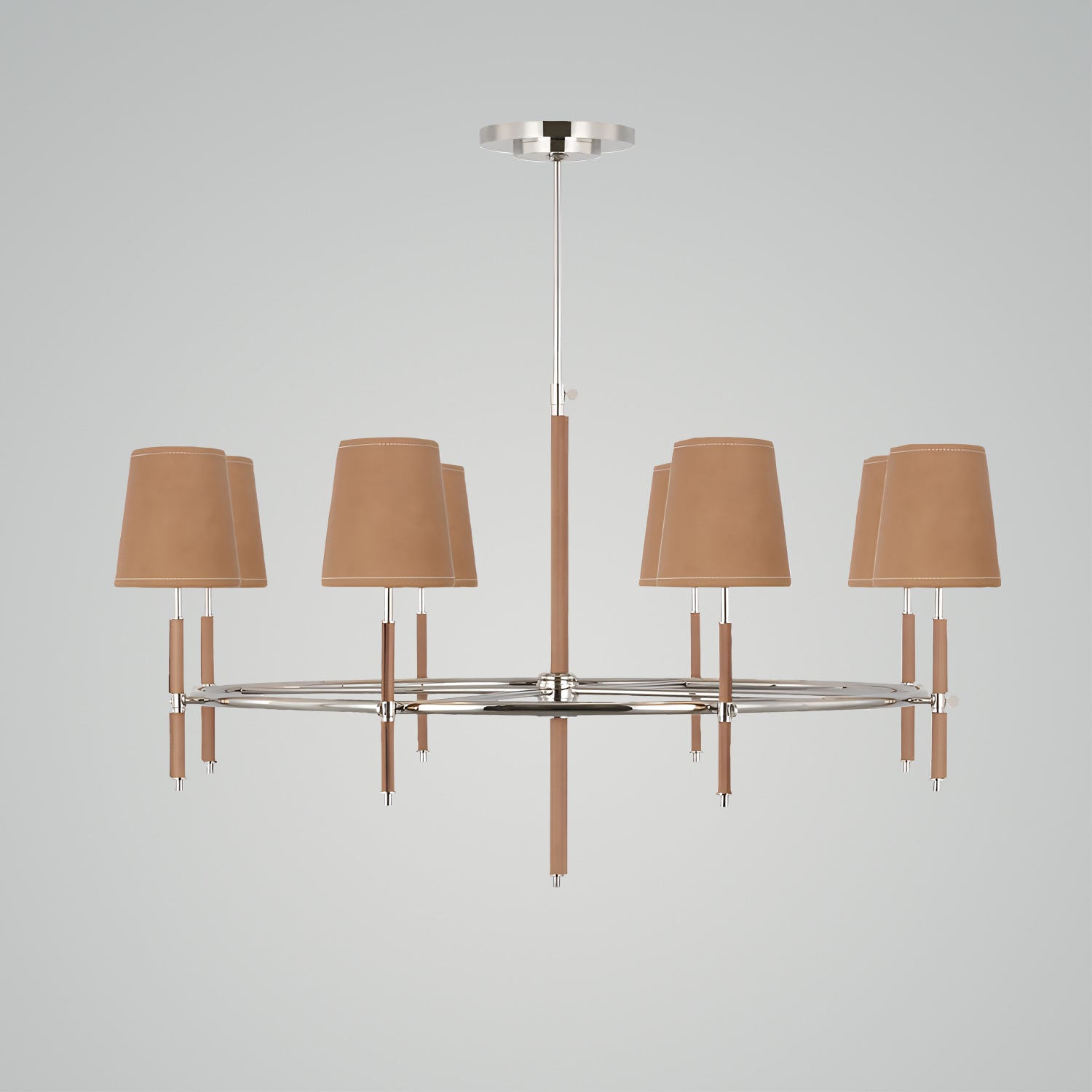 The wrapped ring chandelier features a design that perfectly blends refinement and modernity, creating a captivating centerpiece for your space. Its unique design showcases a circular silhouette, encasing a row of vertical rods meticulously wrapped in high-quality leather, forming a visually engaging composition. The tapered linen drum shade elegantly diffuses light, casting a soft, warm glow that enhances the room's ambiance.