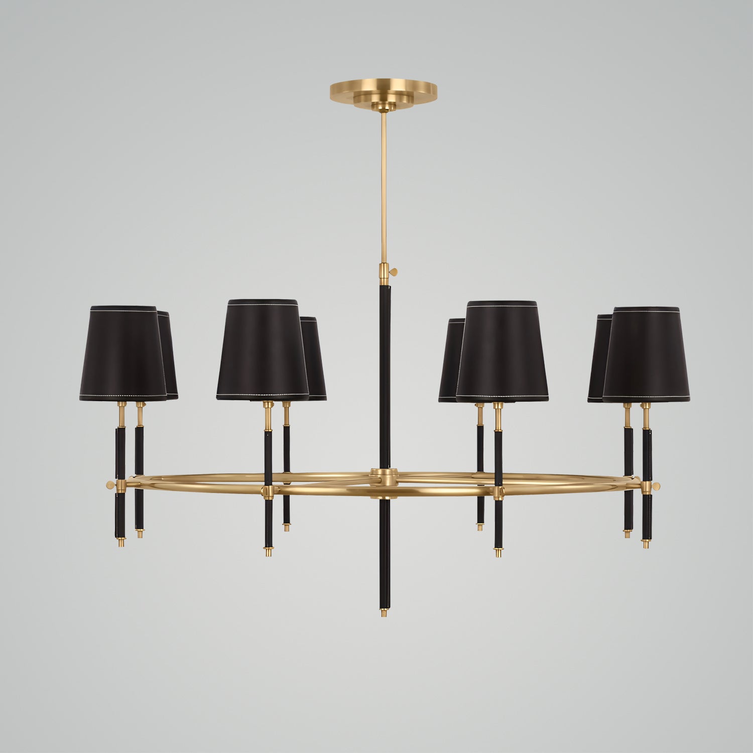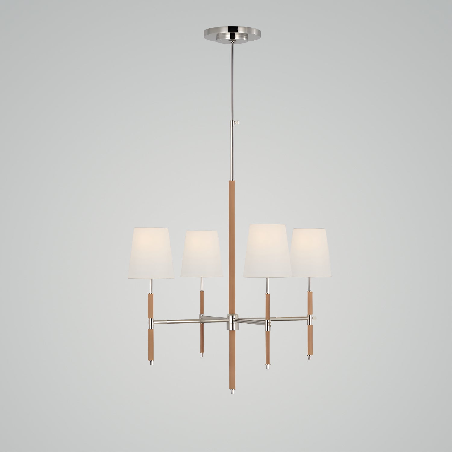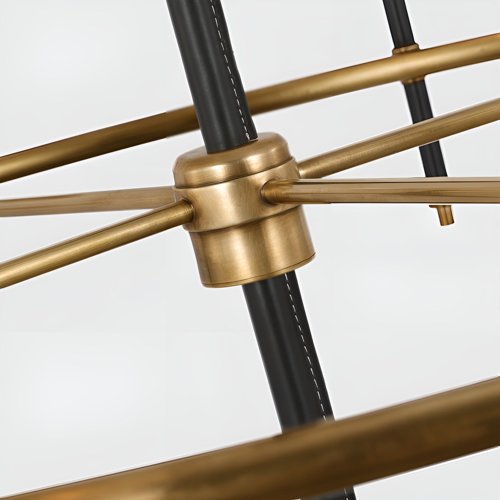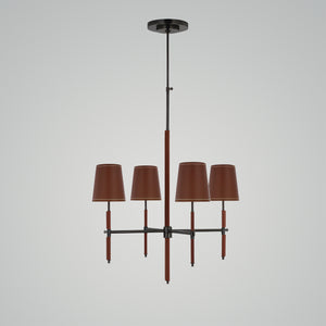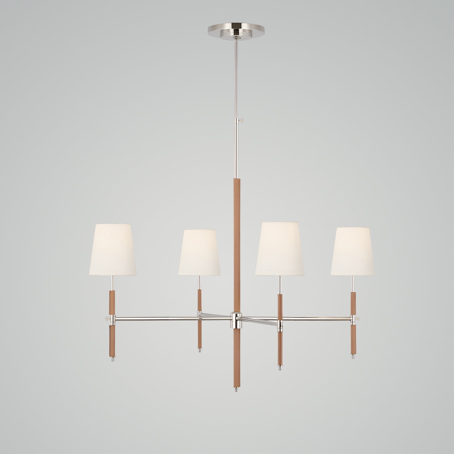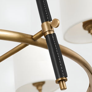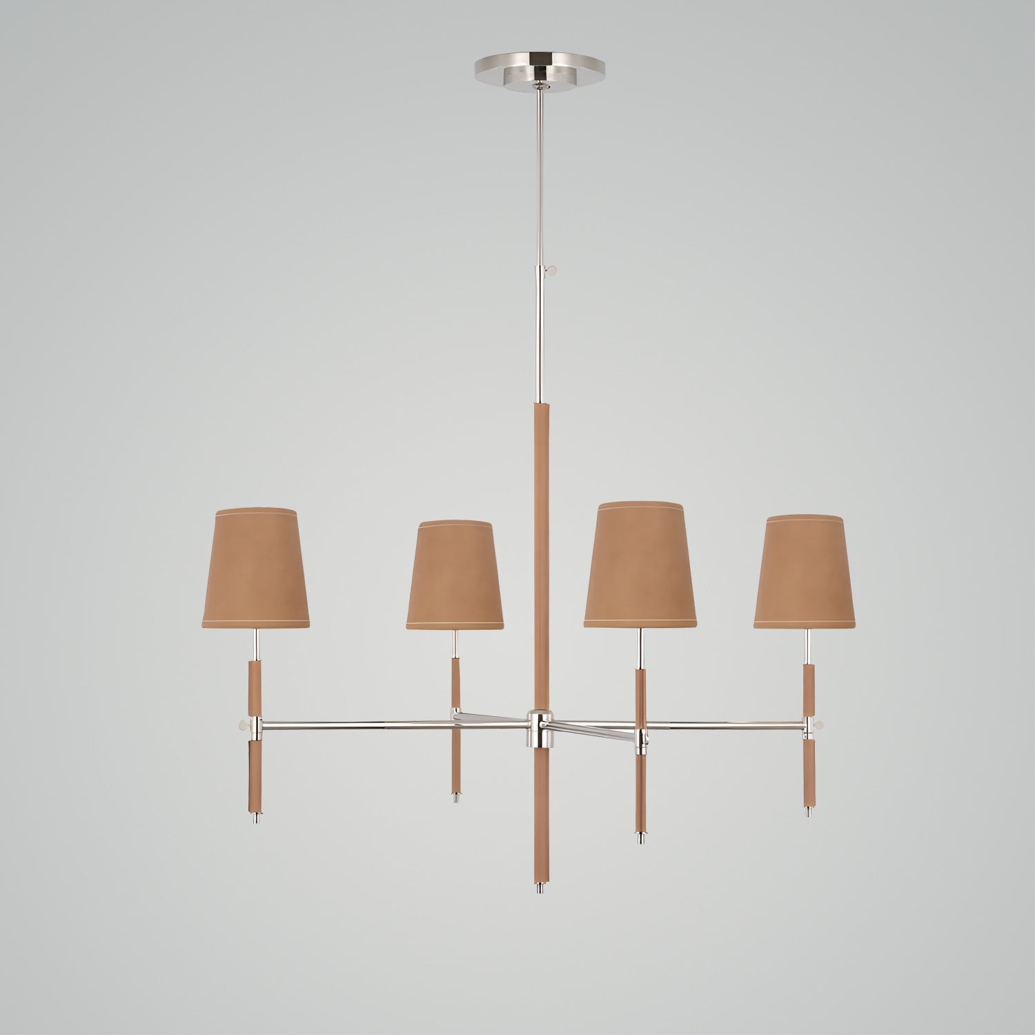 The wrapped ring chandelier features a design that perfectly blends refinement and modernity, creating a captivating centerpiece for your space. Its unique design showcases a circular silhouette, encasing a row of vertical rods meticulously wrapped in high-quality leather, forming a visually engaging composition. The tapered linen drum shade elegantly diffuses light, casting a soft, warm glow that enhances the room's ambiance.