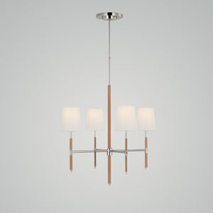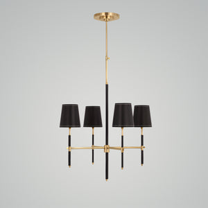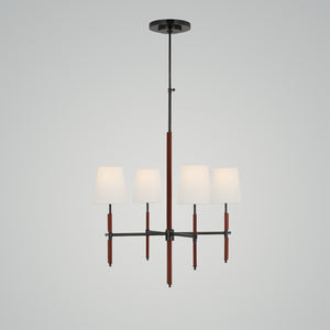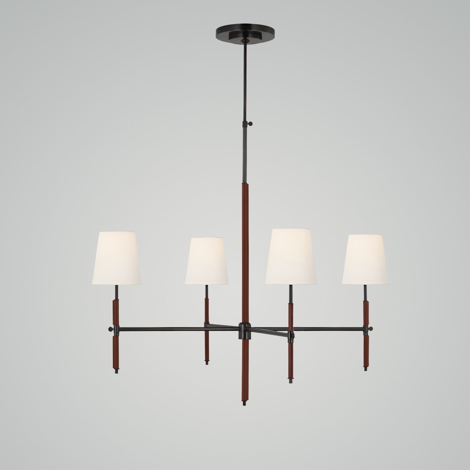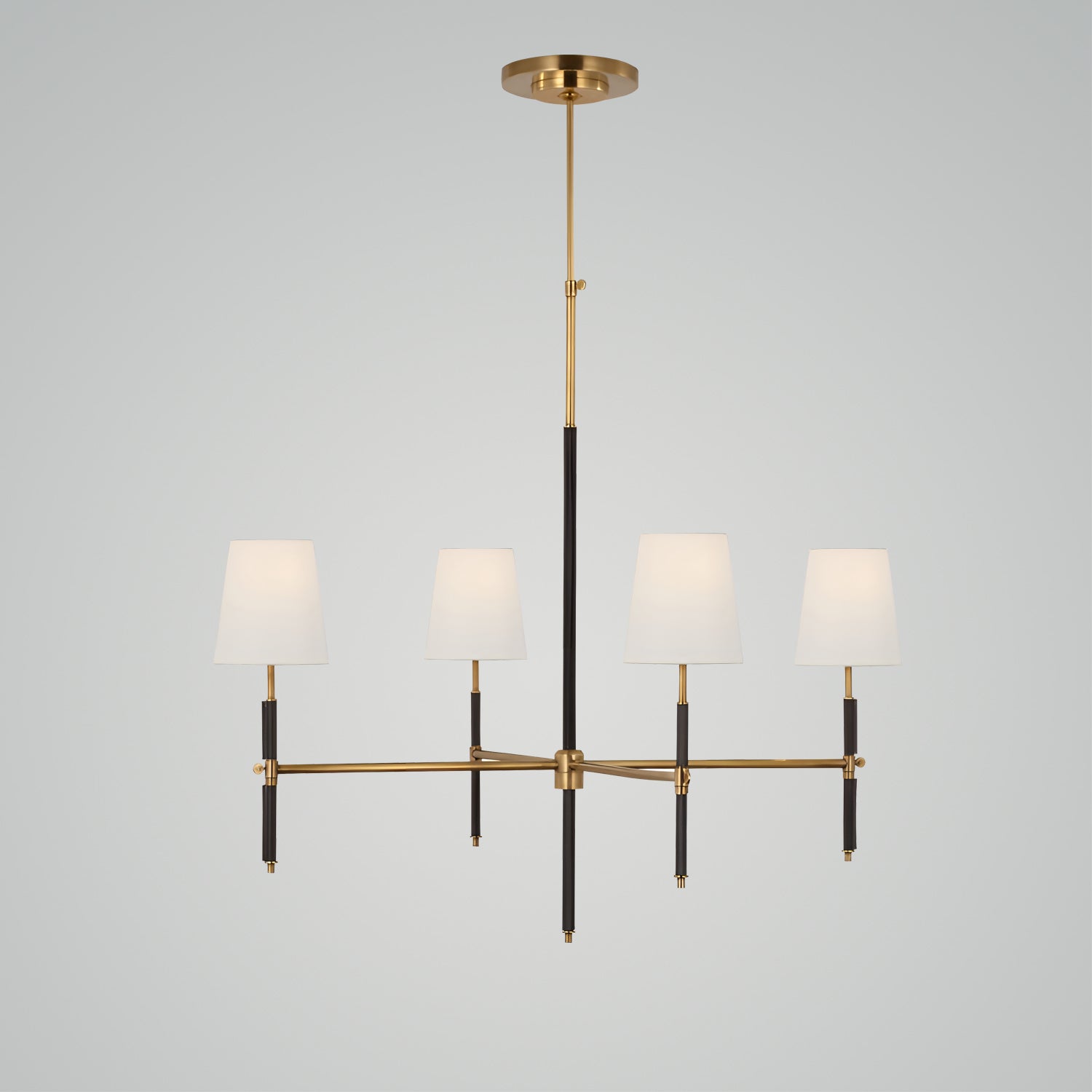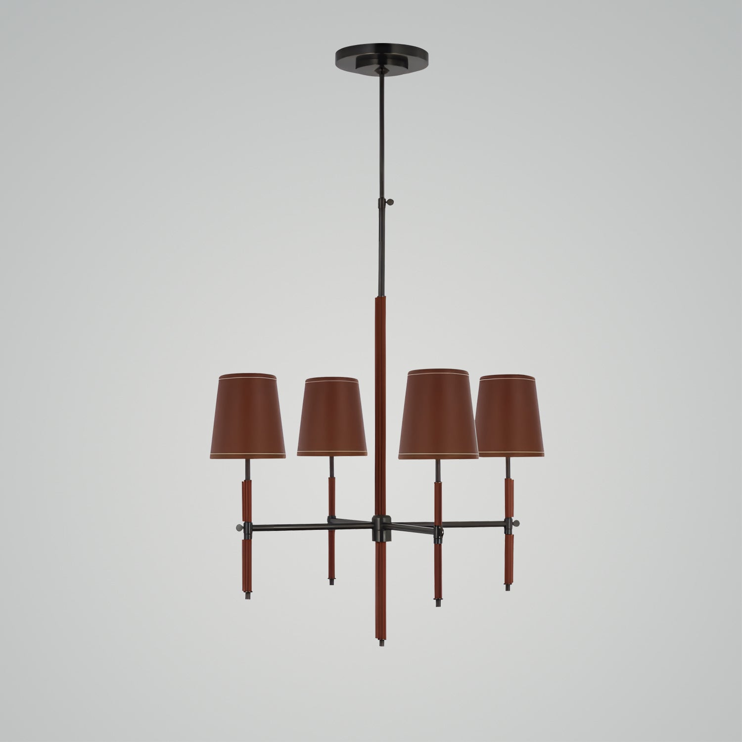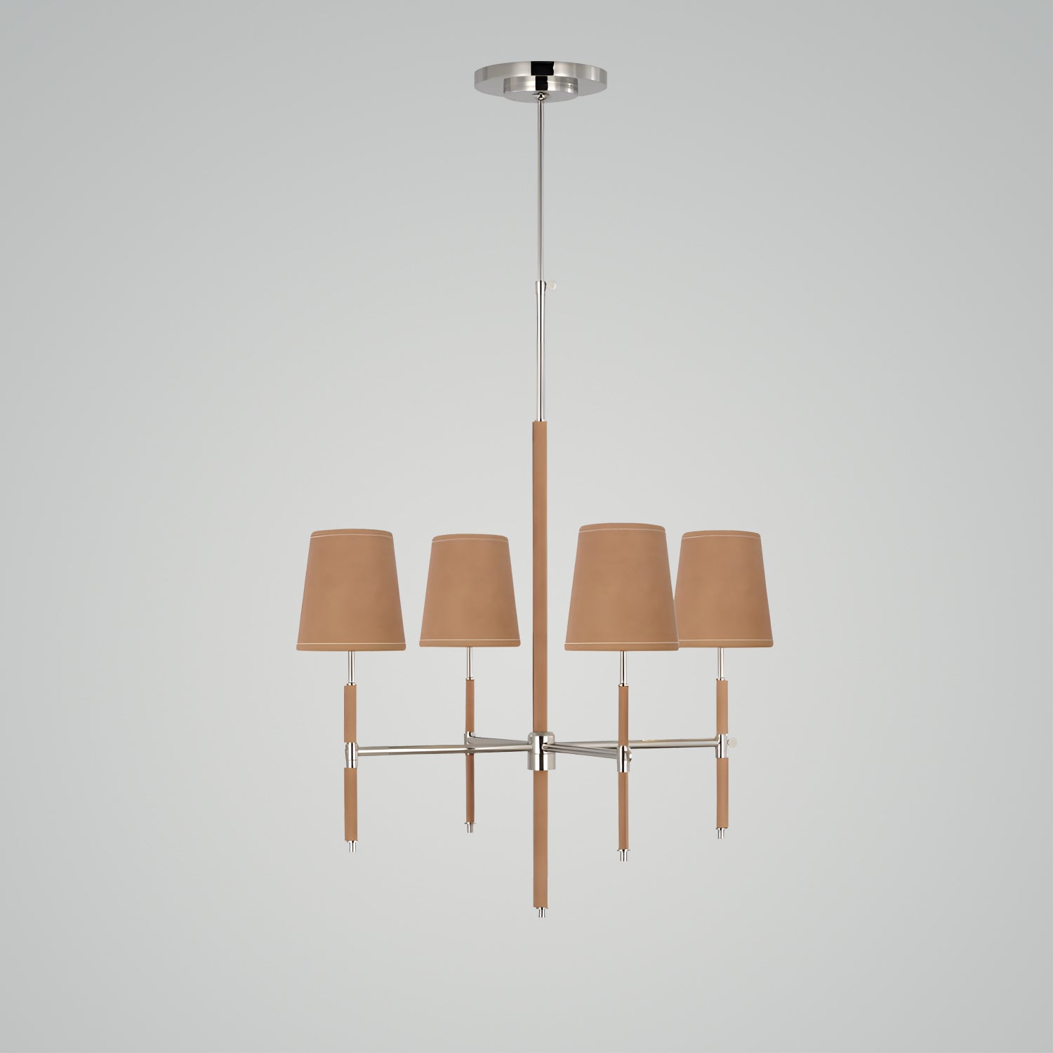 The wrapped ring chandelier features a design that perfectly blends refinement and modernity, creating a captivating centerpiece for your space. Its unique design showcases a circular silhouette, encasing a row of vertical rods meticulously wrapped in high-quality leather, forming a visually engaging composition. The tapered linen drum shade elegantly diffuses light, casting a soft, warm glow that enhances the room's ambiance.