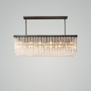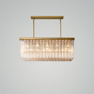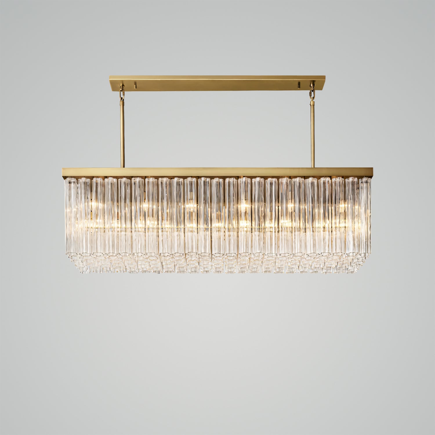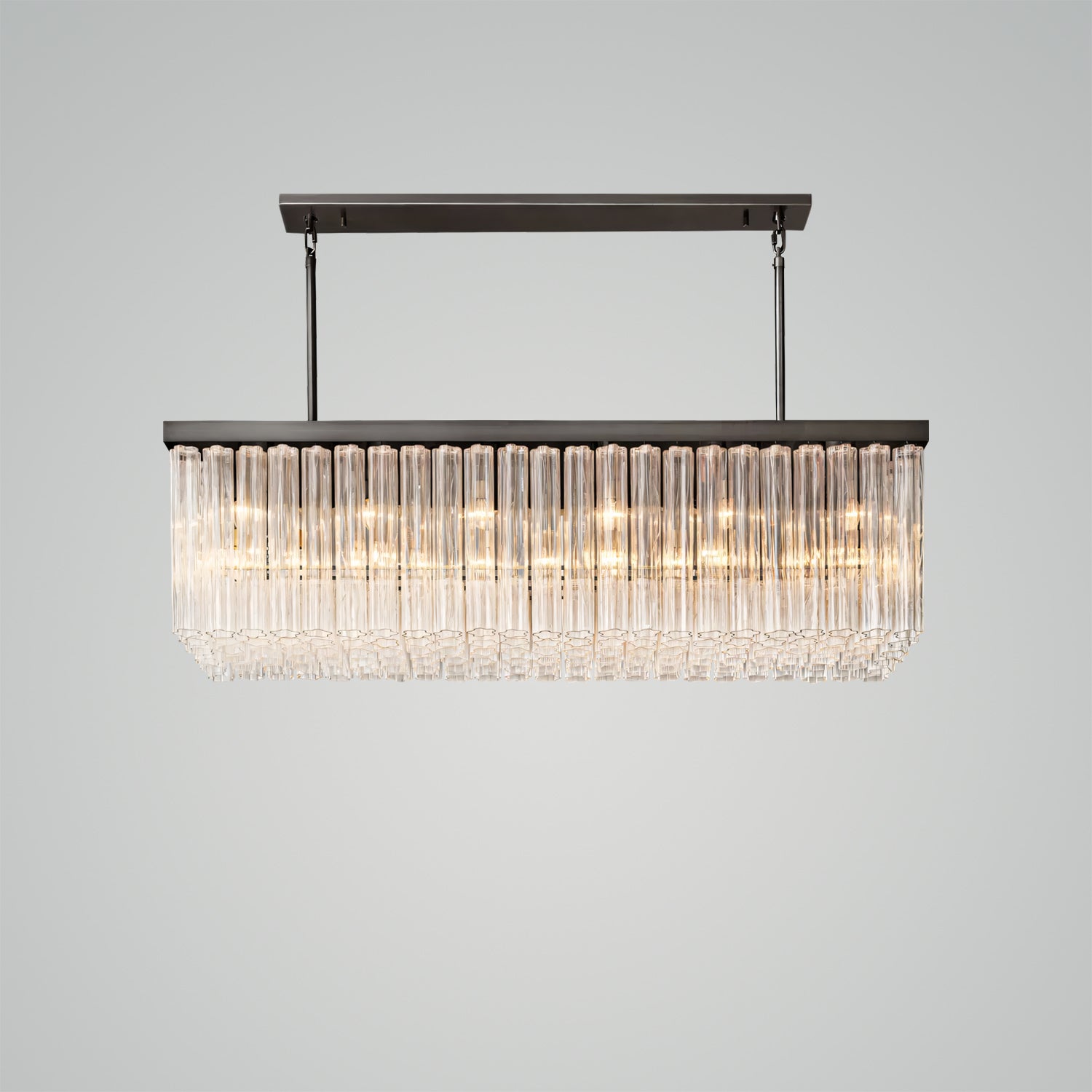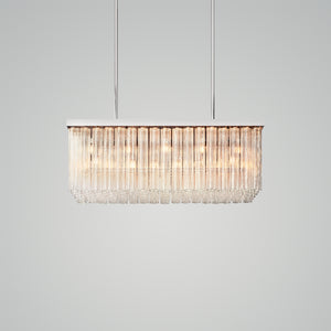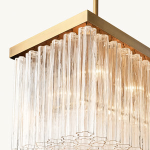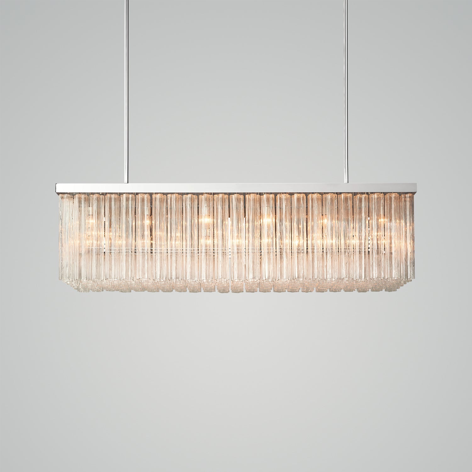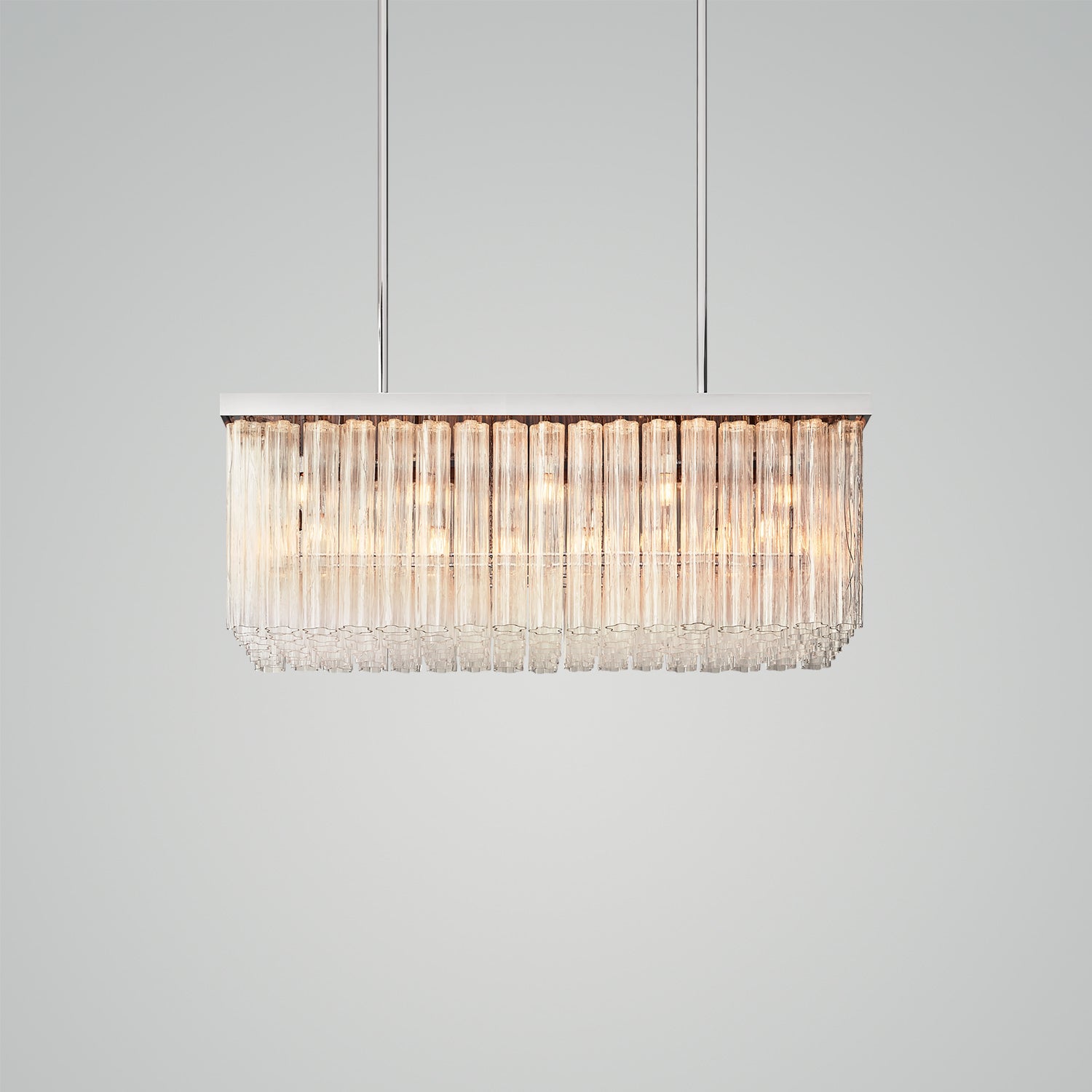 Inspired by 1960s Venetian glass chandeliers from Murano, this collection creates a stunning effect of liquid ice glistening with light. The multi-layered glass is composed of fluted cylindrical pendants, each mouth-blown with a fluid linear texture and a loosely drawn blossom shape. Viewed from below, the clusters of curving forms come together to create a sparkling pattern play.