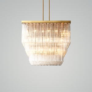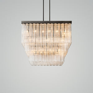 Inspired by 1960s Venetian glass chandeliers, this collection creates the stunning effect of liquid ice glistening with light. The cascading layers of glass are composed of fluted cylindrical pendants, each mouth-blown with a fluid linear texture and a loosely drawn blossom shape. Viewed from below, the clusters of curving forms come together to create a sparkling pattern play.