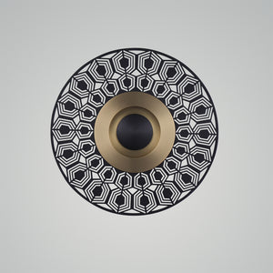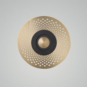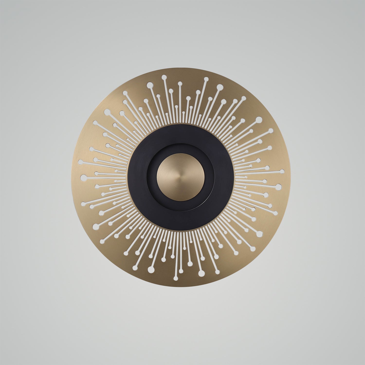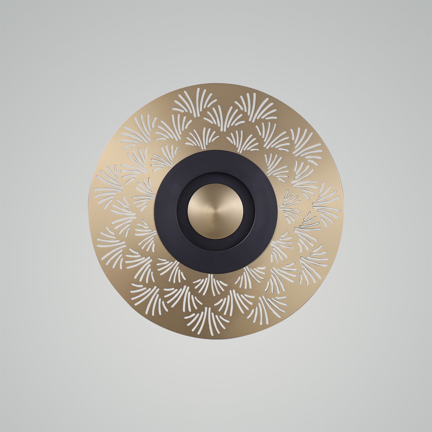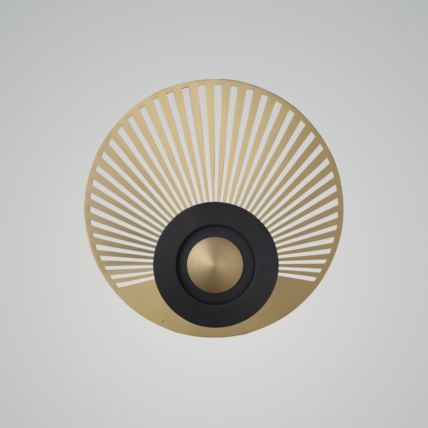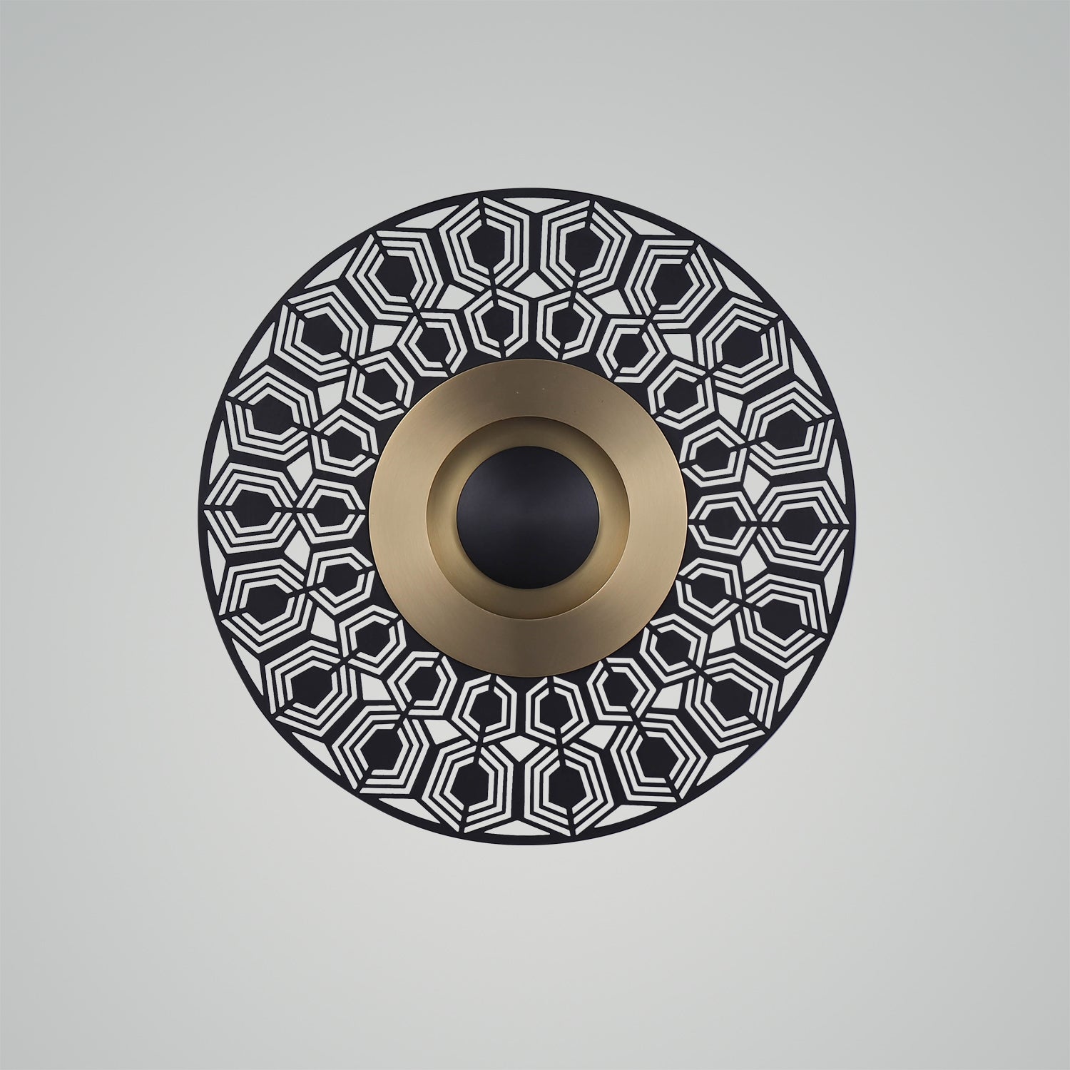 This wall light features an illuminated center and is crafted with either an intricate openwork design or a solid metal piece, giving the collection an Art Deco flair. It can create a range of effects, from semi-darkness to a patterned light source, allowing for versatile arrangements.