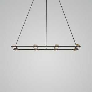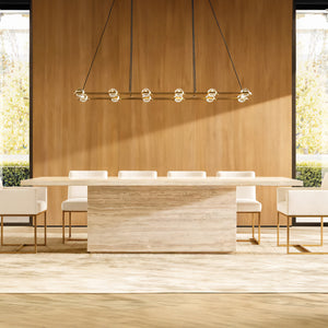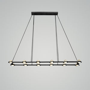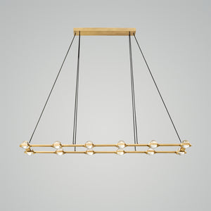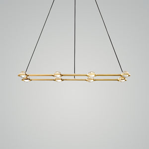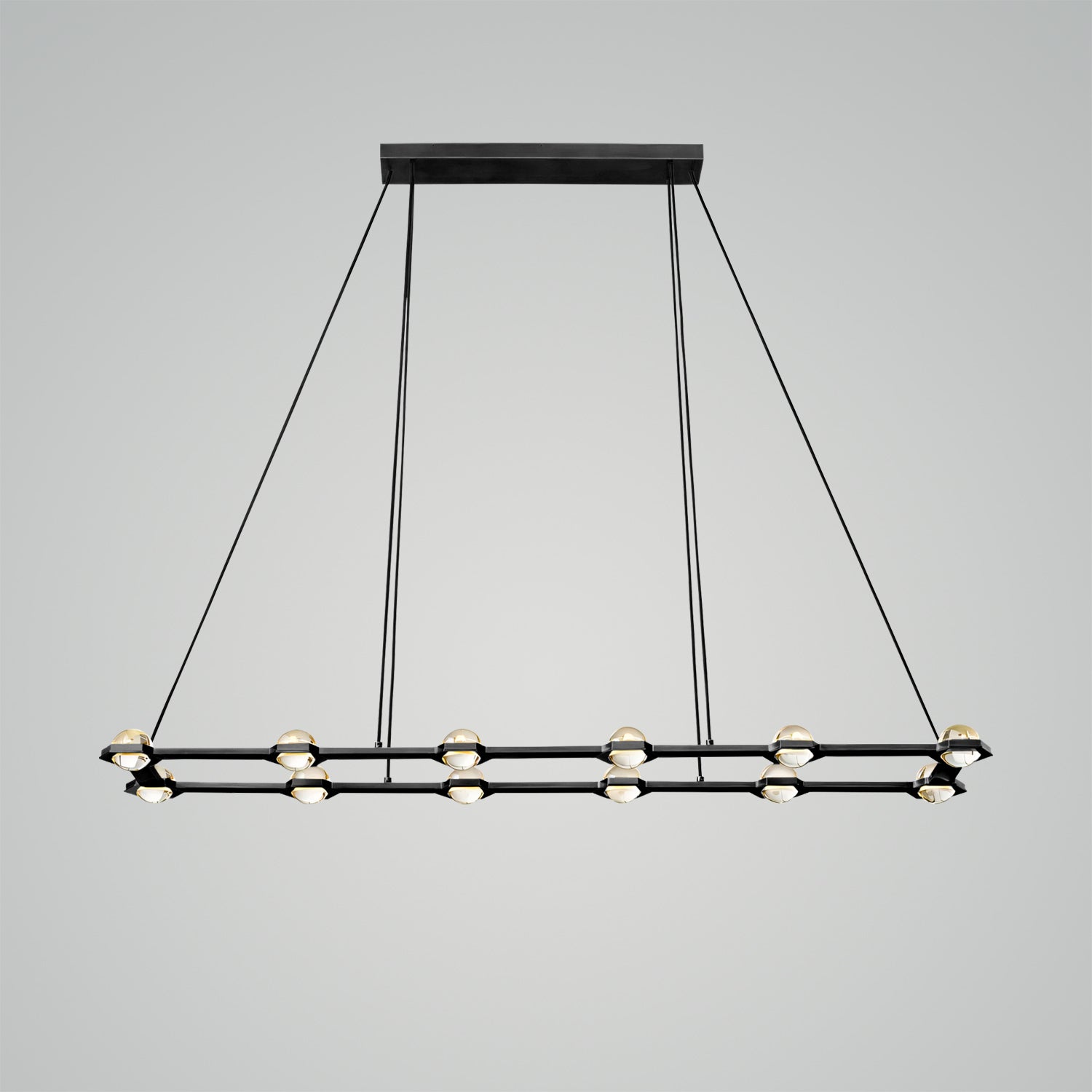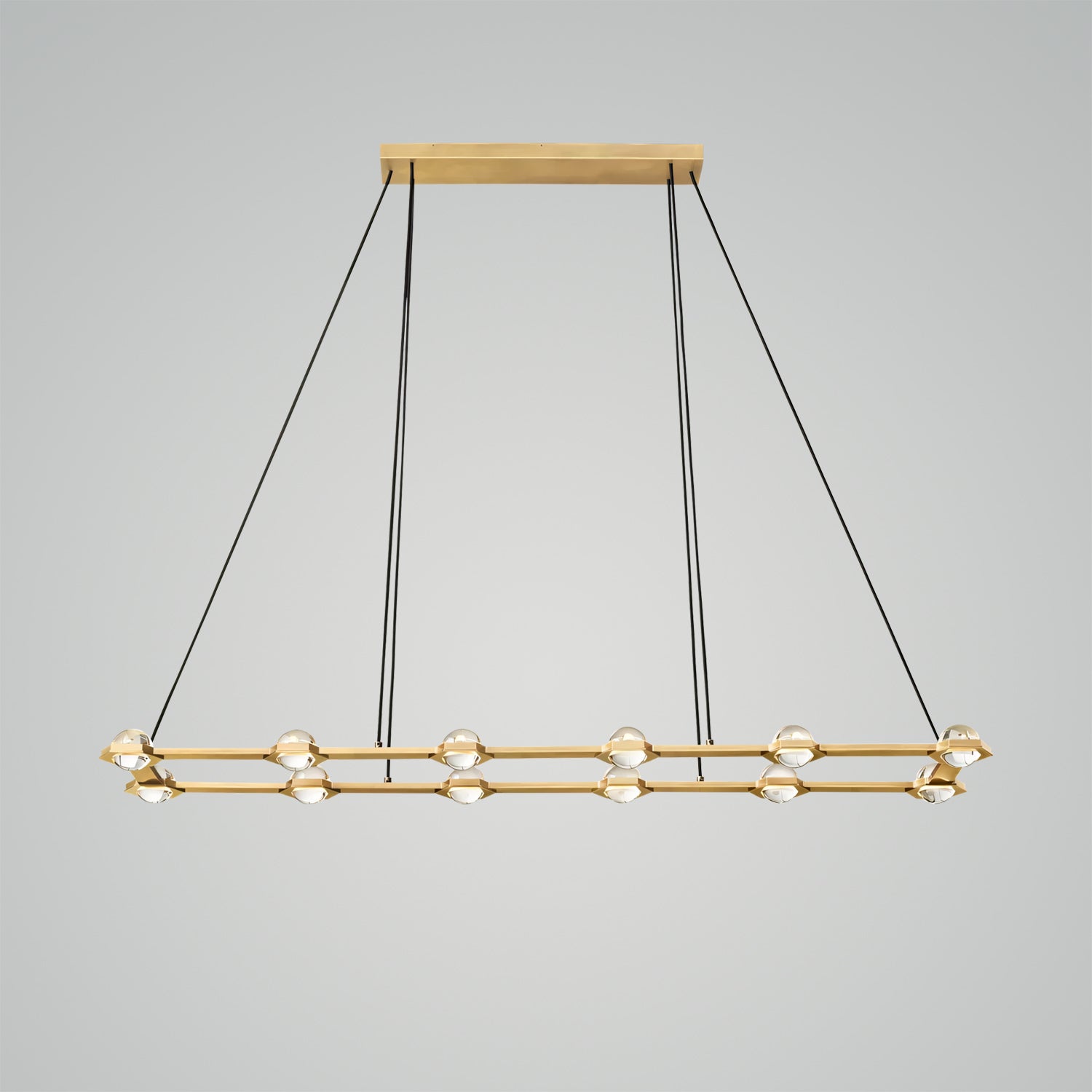 The minimalist and elemental collection features illuminated crystal orbs suspended in hexagonal fittings within a flat rectangular frame. The design is inspired by plans for a cenotaph drawn by an 18th-century architect, offering a visionary tribute to physics reinterpreted in a stunning contemporary form.