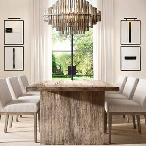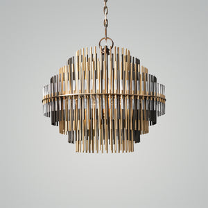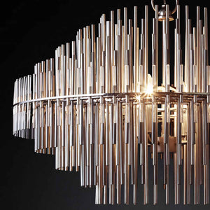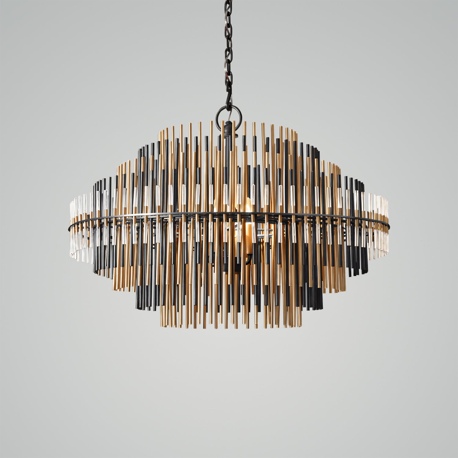 The profile of the chandelier is composed of ascending and descending concentric spires, inspired by a 1970s design. Multiple tiers of graduated metal and acrylic rods diffuse the soft glow of LEDs, giving the piece a sculptural presence.This Light is belong to Lightsunion Light.