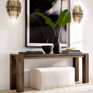 The profile of the sconce is composed of ascending and descending concentric spires, inspired by a 1970s design. Multiple tiers of graduated metal and acrylic rods filter the inner glow, lending the piece a sculptural presence.