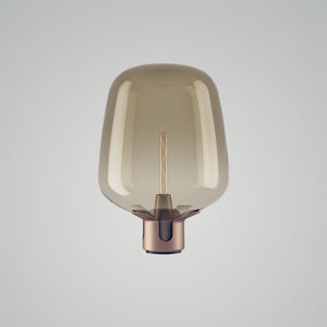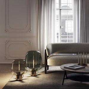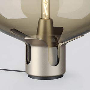 The design is inspired by traditional storm lanterns that use glass tubes to protect the flame. It features a billowing glass shade designed to surround an LED filament bulb, amplifying the light source and diffusing it through tinted glass, almost like a modern candle. The lamp consists of a steel base that opens like a flower, leading to a molded blown glass shade. The contrast between the precise 3D laser-cut base and the uniqueness of the blown glass bubble further enhances the lamp's character.