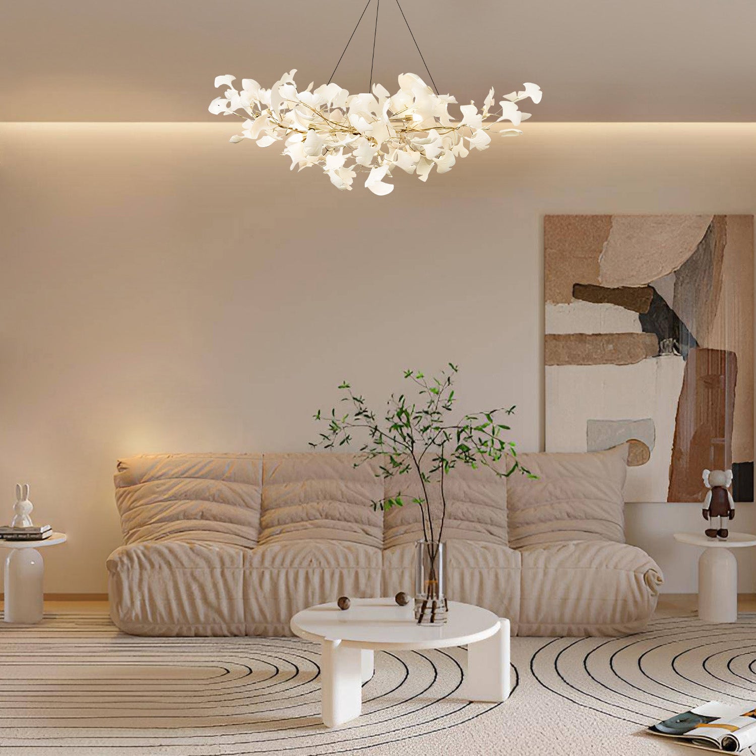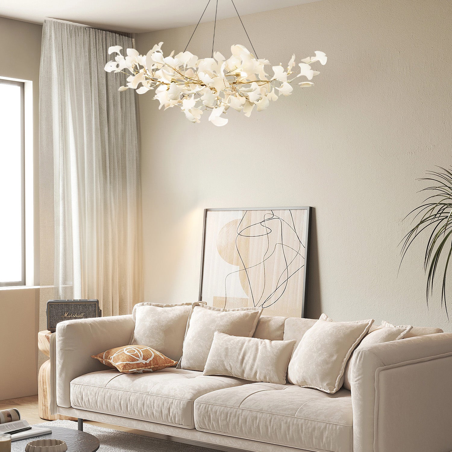Embrace the allure of nature with the "Light Sculpture GINGKO_1201 - Ethereal Ginkgo Canopy Chandelier," a poetic interpretation of the natural world's enduring beauty. This exquisite chandelier is adorned with delicate ceramic leaves crafted to resemble the timeless ginkgo, symbolizing longevity and profound grace. Each leaf is finished in a soft, luminescent glaze that reflects light enchantingly, creating a tranquil glow that gently illuminates any space. The chandelier's organic form and ethereal presence offer a breathtaking centerpiece that combines art with illumination. Designed for those who seek to infuse their surroundings with an element of organic elegance, this chandelier transforms any room into a serene retreat.
