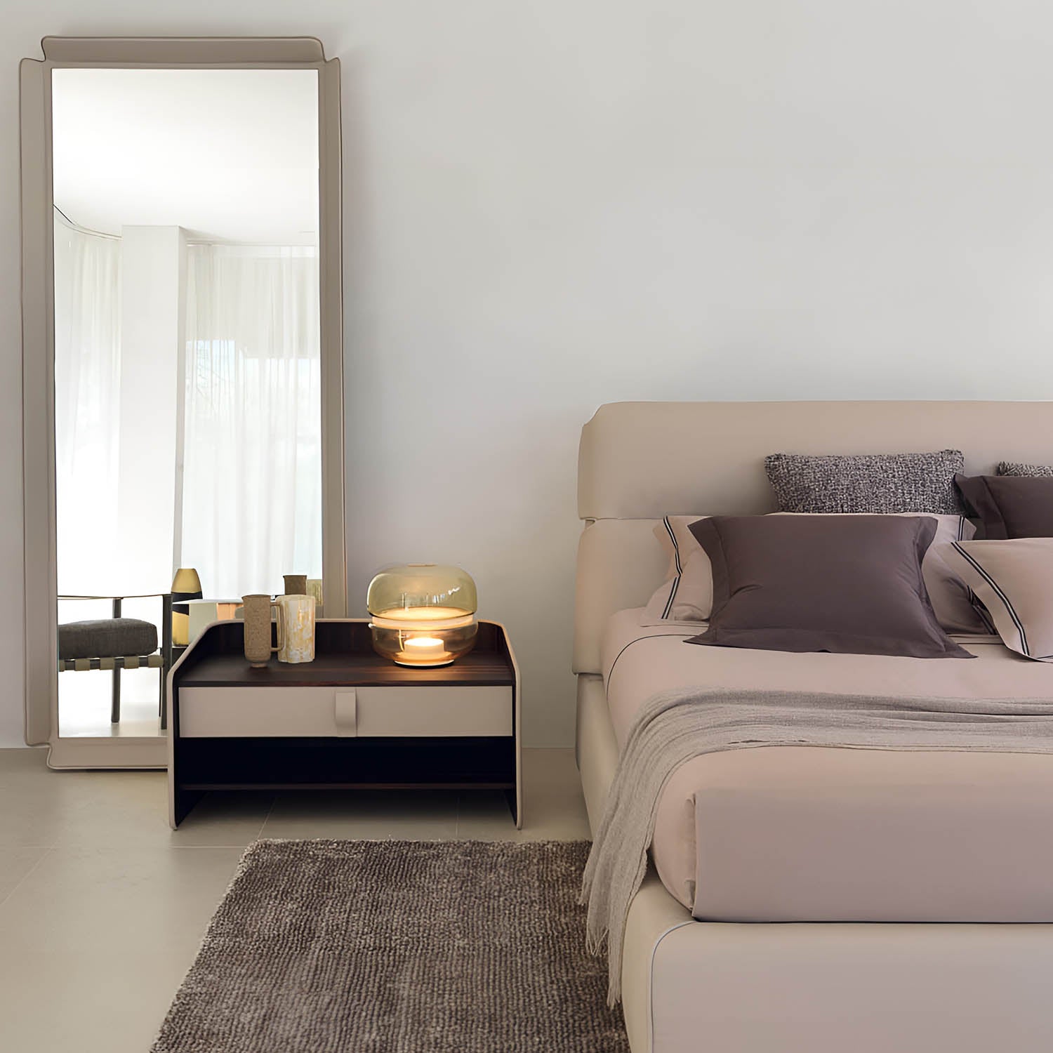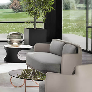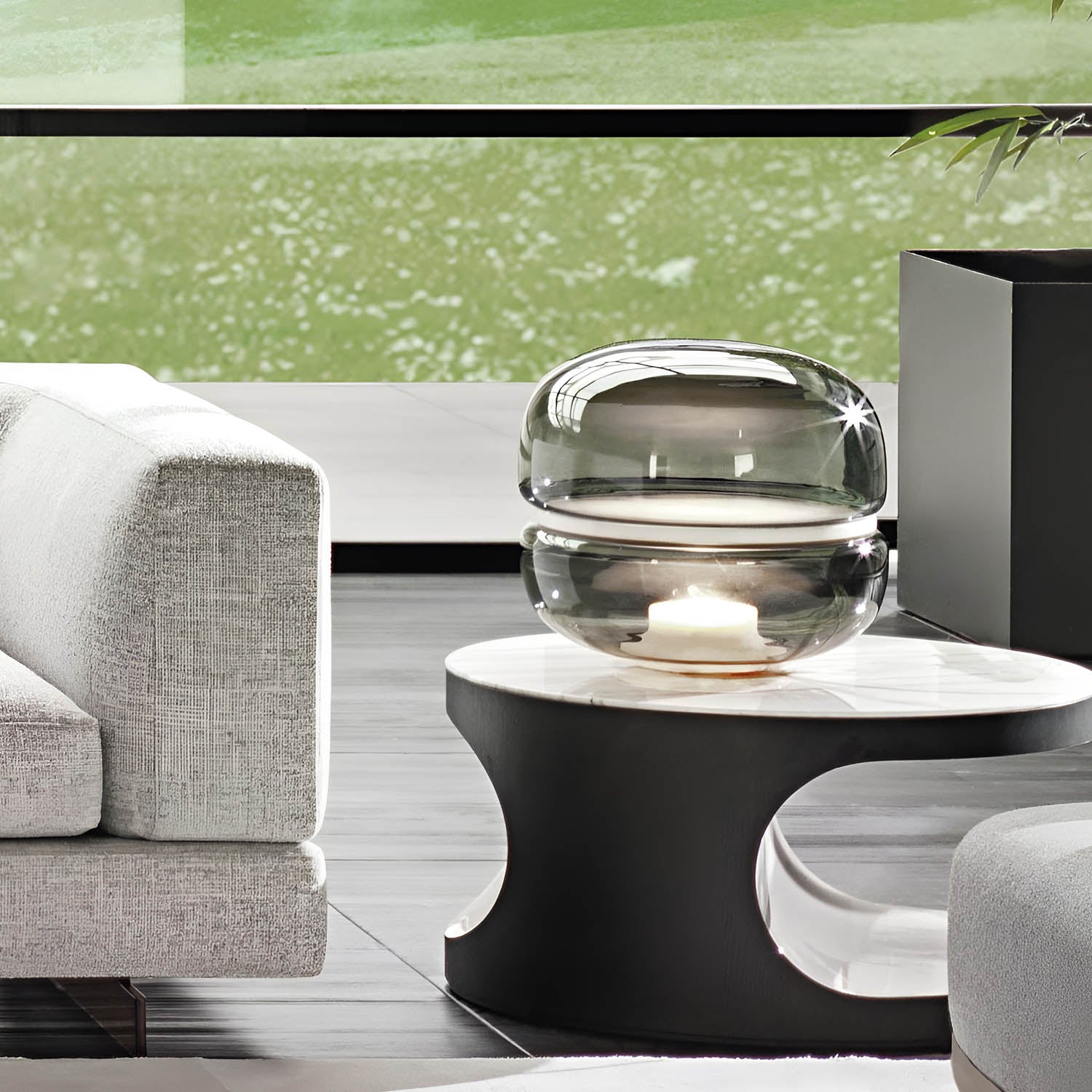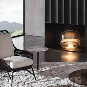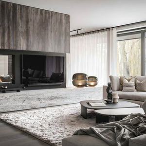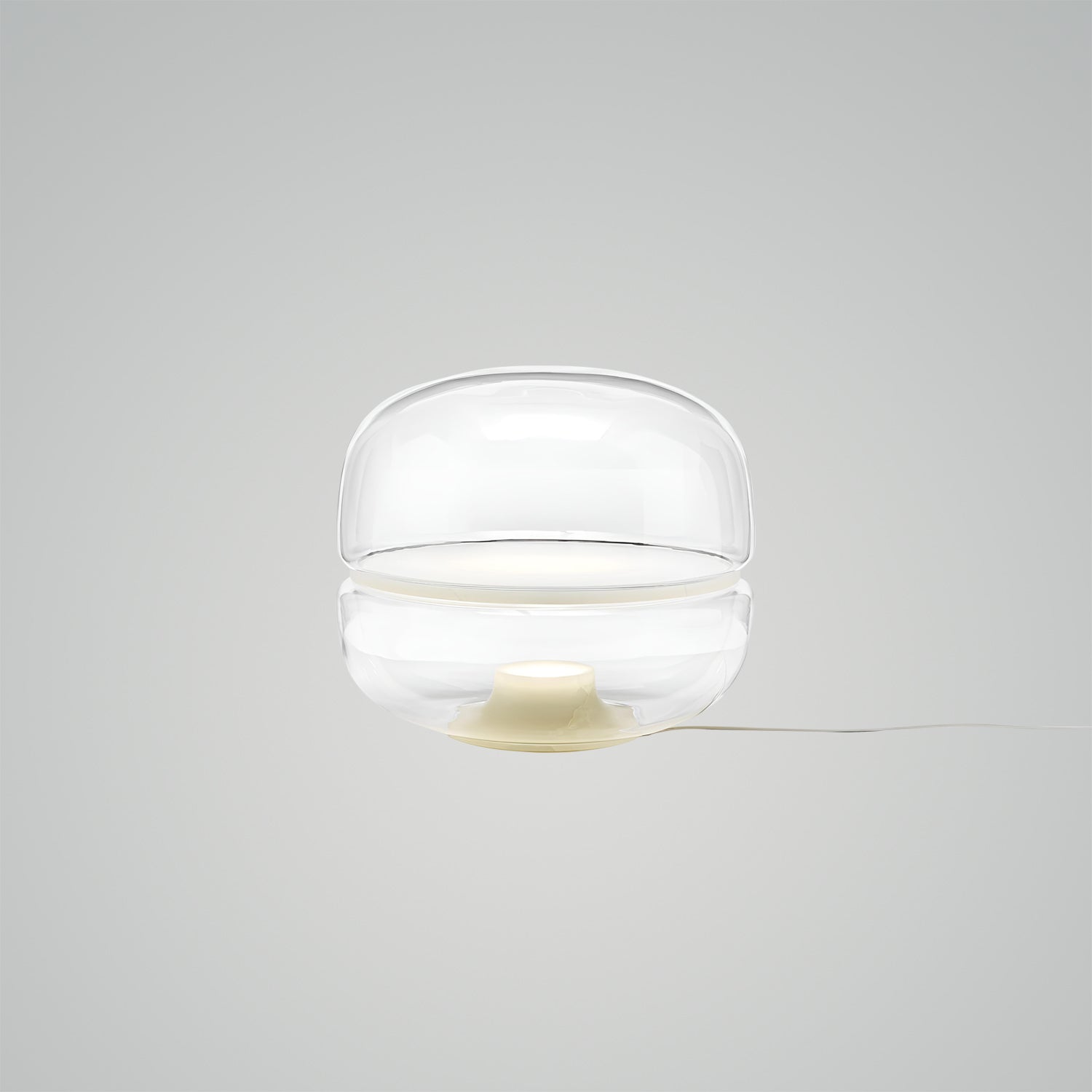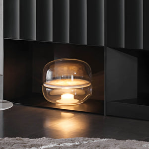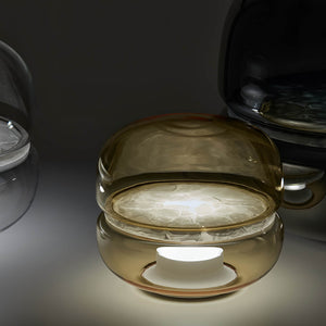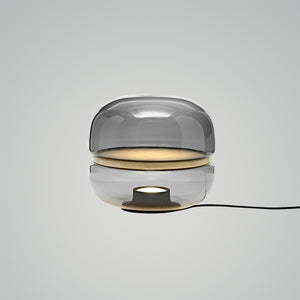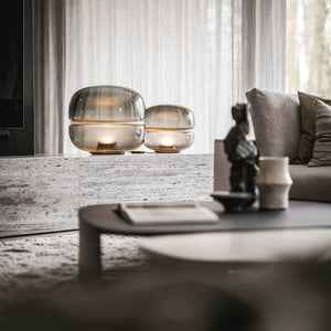 The Macaron table lamp pays homage to the beauty and complex structure of crystalline stone. The stone is enclosed within two symmetrical, hand-blown glass domes, resembling a moonscape floating in its own universe. The light source shines upward from the onyx base, enhancing the intricate chalcedony veins in the central onyx plate and creating a delicate and mesmerizing lighting effect. The design concept is based on the principle of illuminating stone, and the name comes from its resemblance in shape to the famous French meringue confection, the macaron. Natural imperfections in the glass and the diversity of stone structures make each lamp a unique original. The purity of natural materials, combined with exquisite craftsmanship, has resulted in a lamp with extraordinary ambiance. Produced using traditional techniques, the lamp embodies a distinctive and enduring aesthetic. It comes in three sizes, the largest of which also serves as an attractive floor lamp, and offers several glass color options with either white or honey onyx. Additionally, the collection includes an alternate version featuring a central plate made of special glass combined with a wooden base.