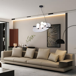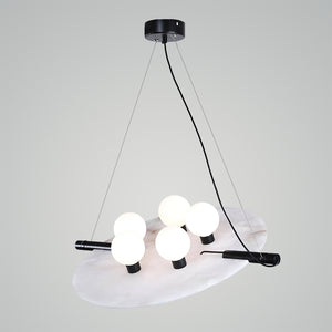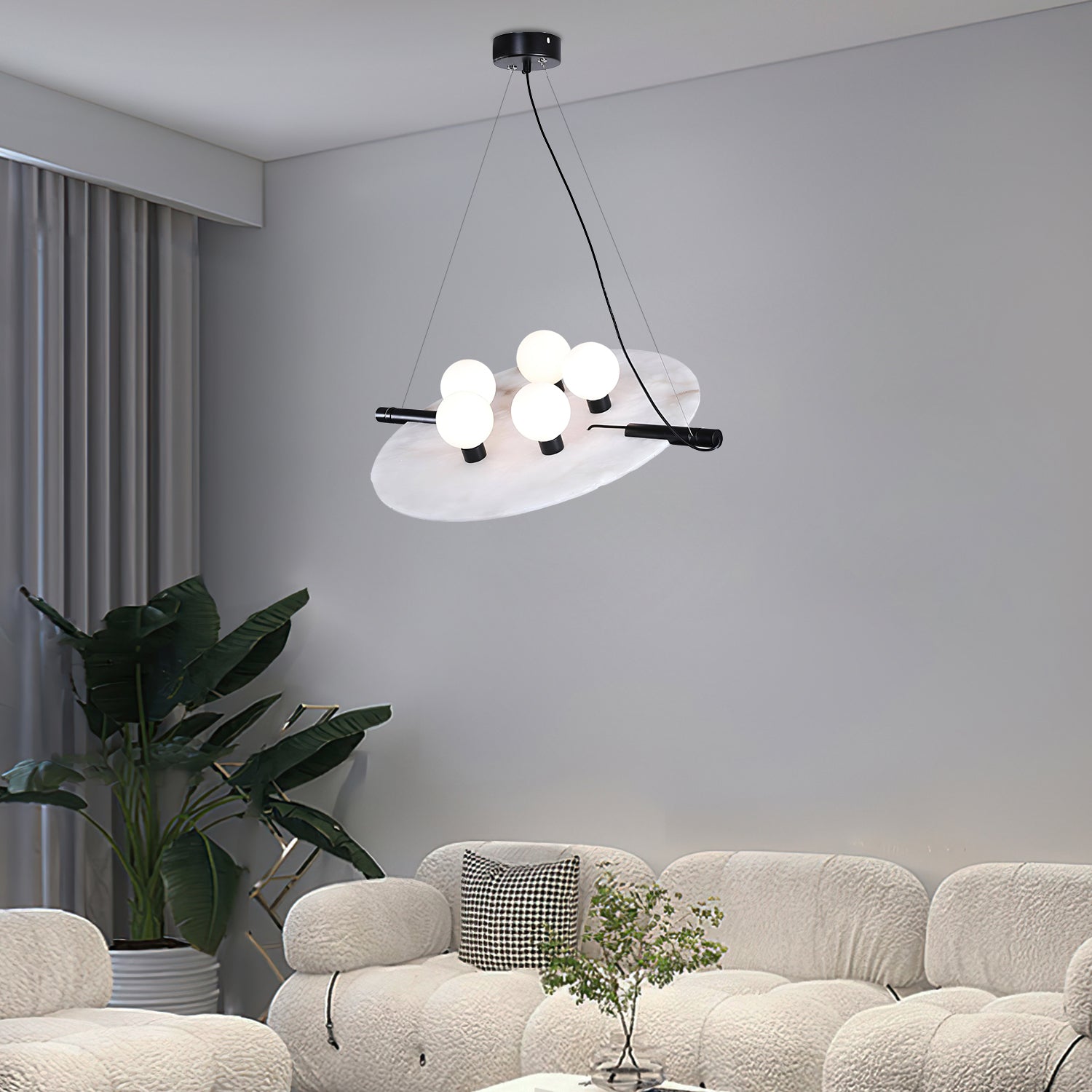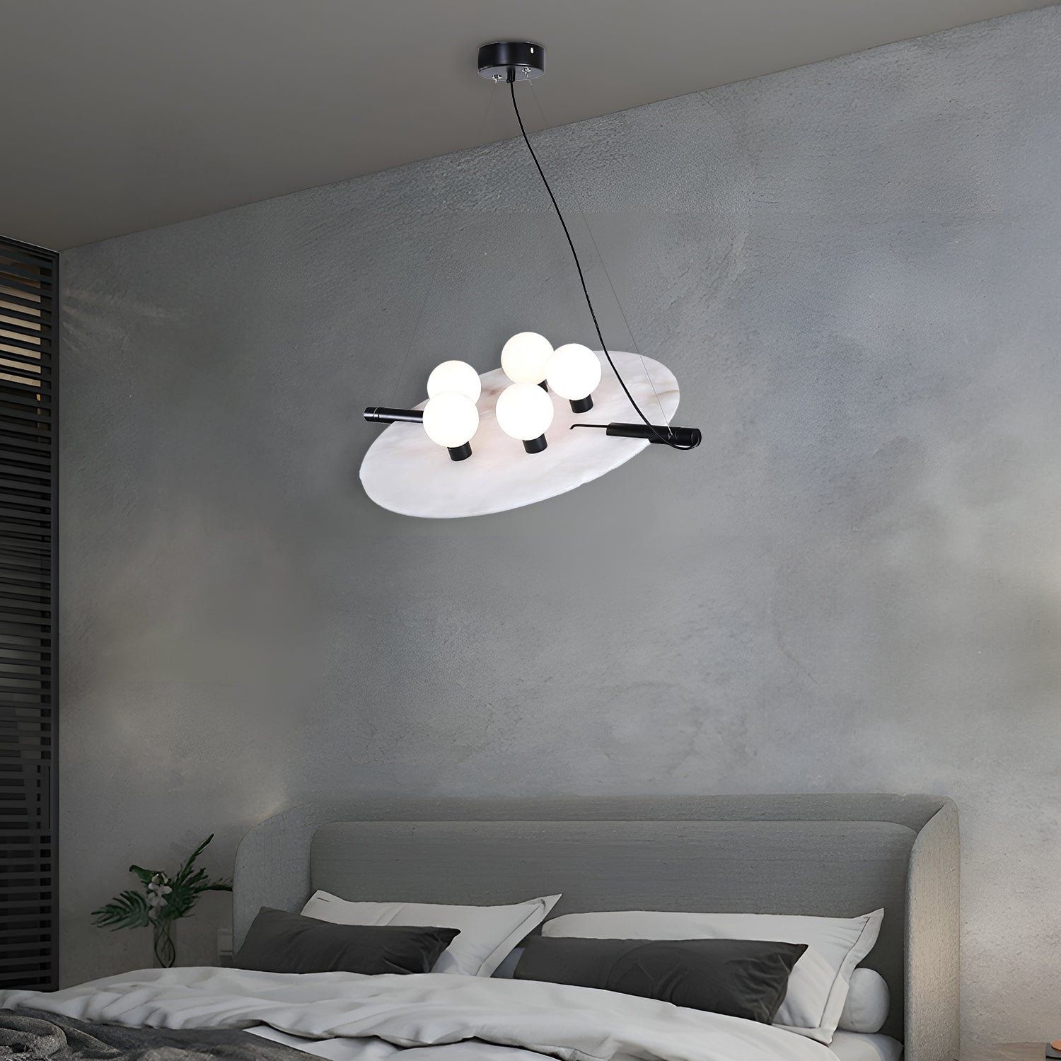 Step into a world of refined elegance with the Magma Pendant Lamp, a futuristic take on lighting design that melds natural beauty with contemporary aesthetics. The smooth, alabaster disc is the centerpiece, exuding a celestial glow, while the frosted orbs appear to float around it like moons in orbit. Each piece of alabaster is unique, with organic patterns that ensure no two fixtures are alike, casting a soft, diffused light that adds warmth and character to any space. Suspended with grace, this pendant light is a testament to sophisticated design, making it an ideal choice for those who wish to make a bold, yet understated statement in their home or office.