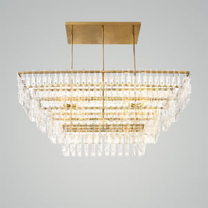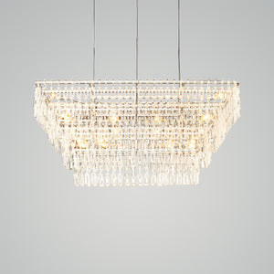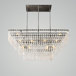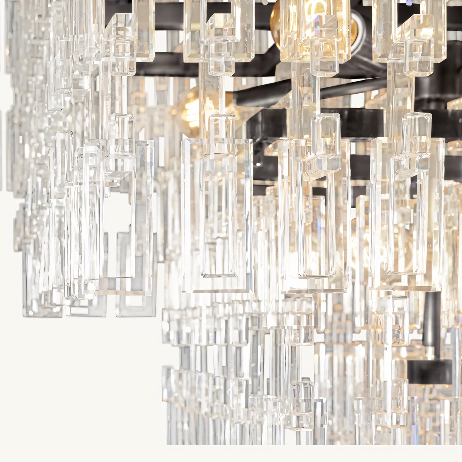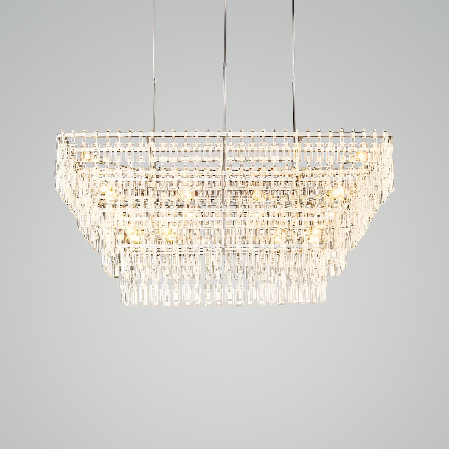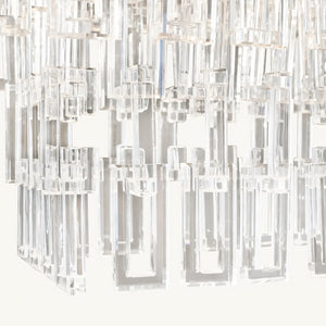 Inspired by industrially processed metal chains, the designers reimagined open and closed links in crystal-clear glass. Pure and simple, the stylized links are suspended among more than 600 crystals, wire-free, creating a brilliant waterfall of shimmering light.