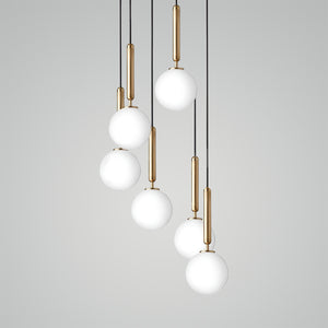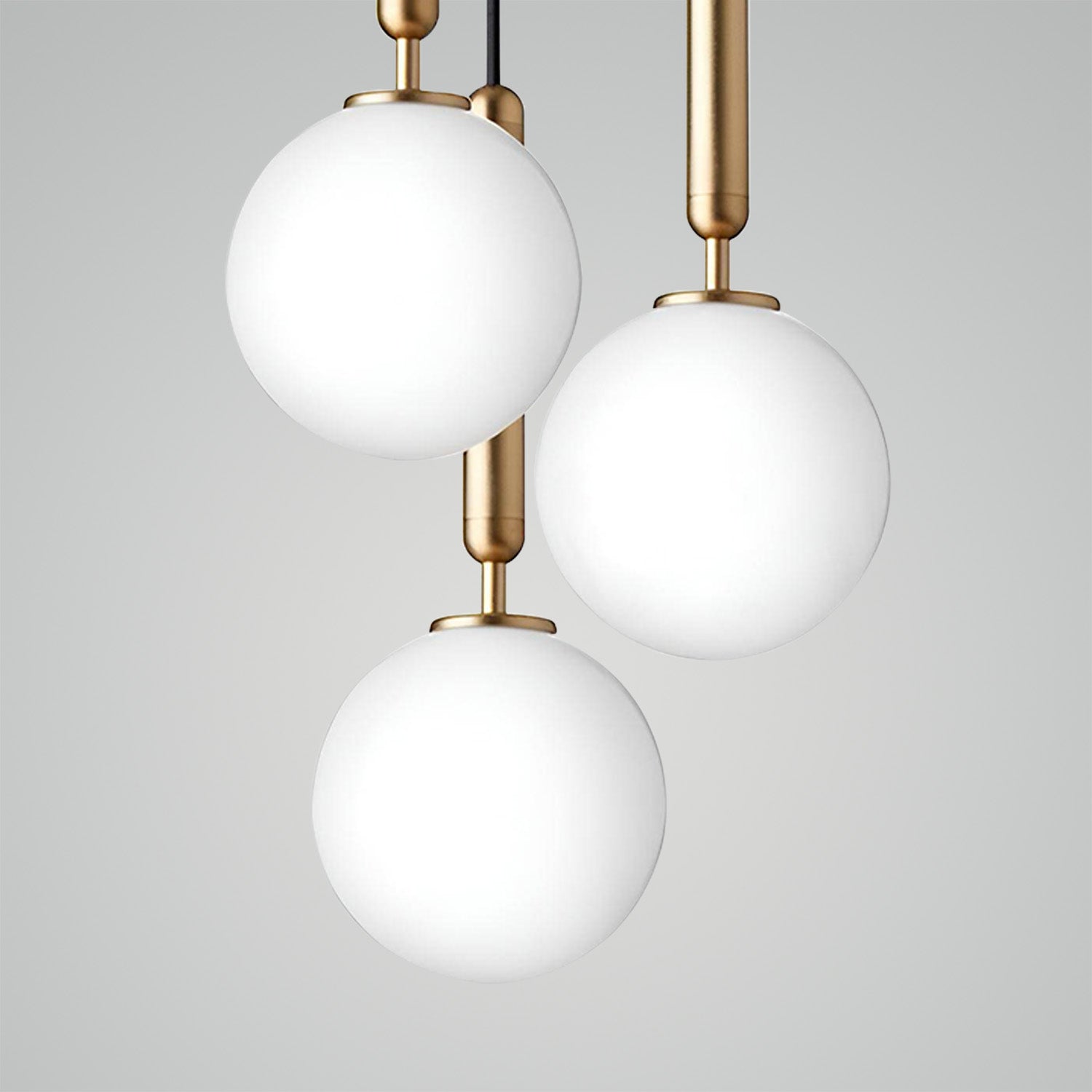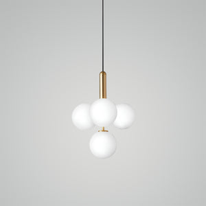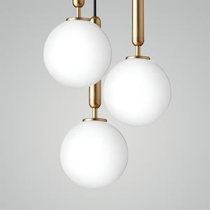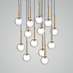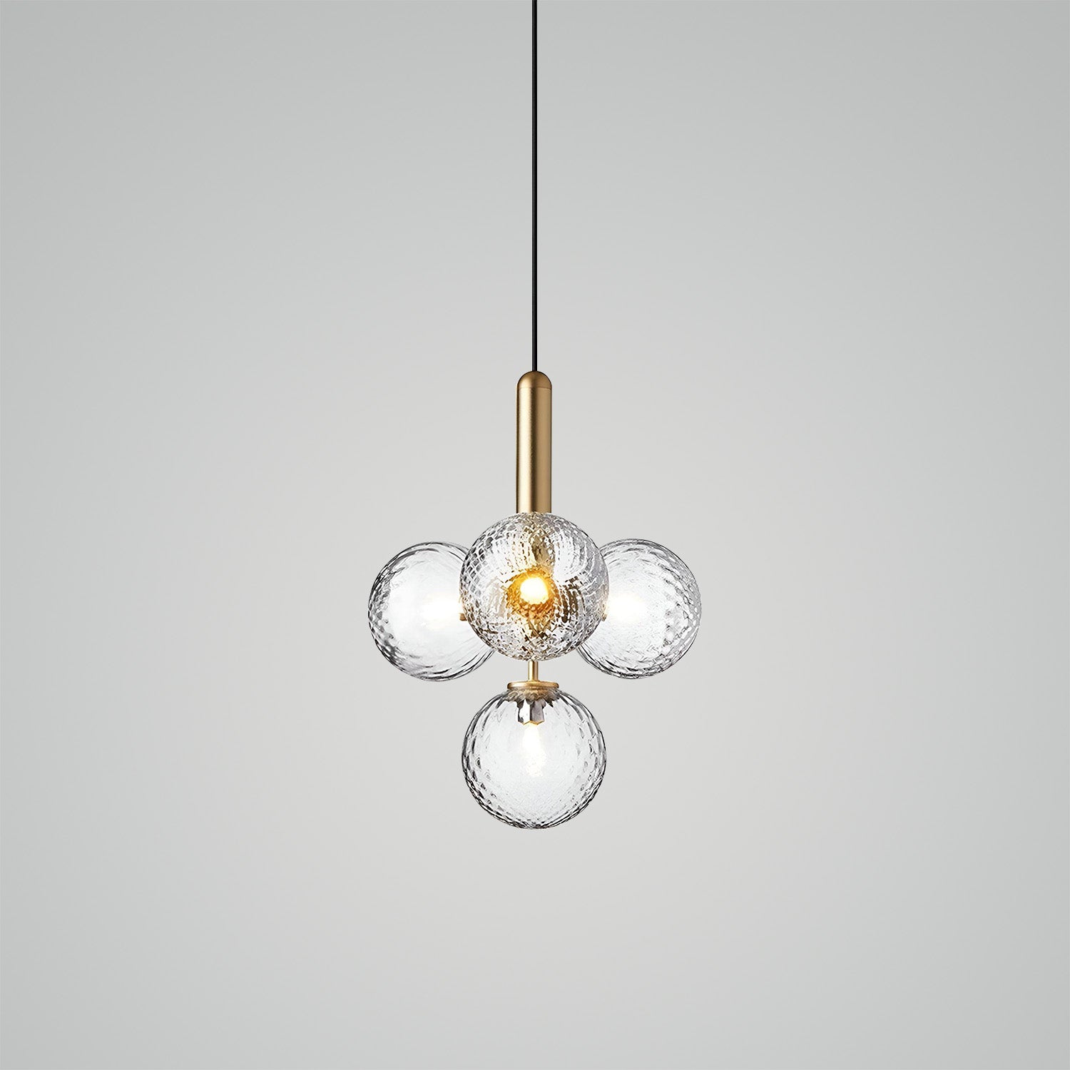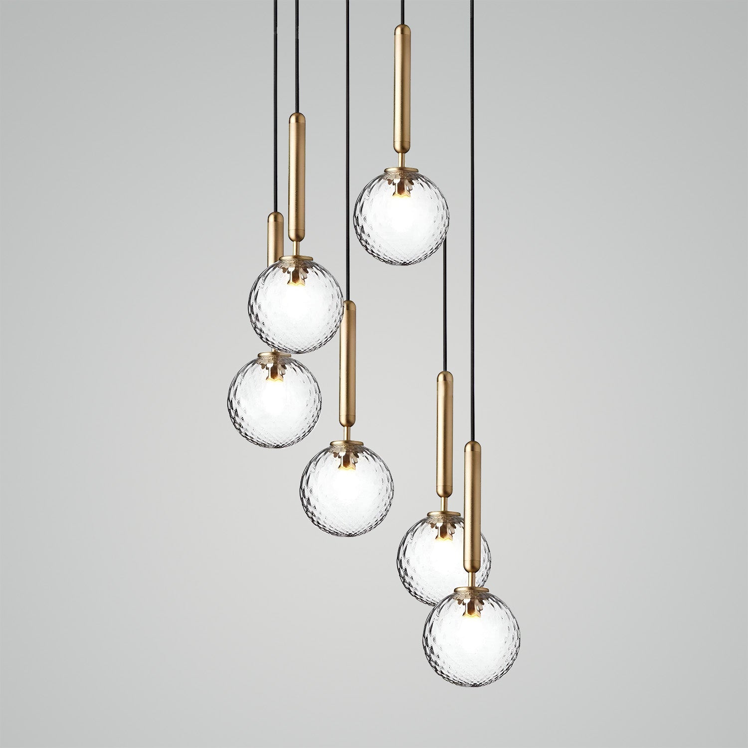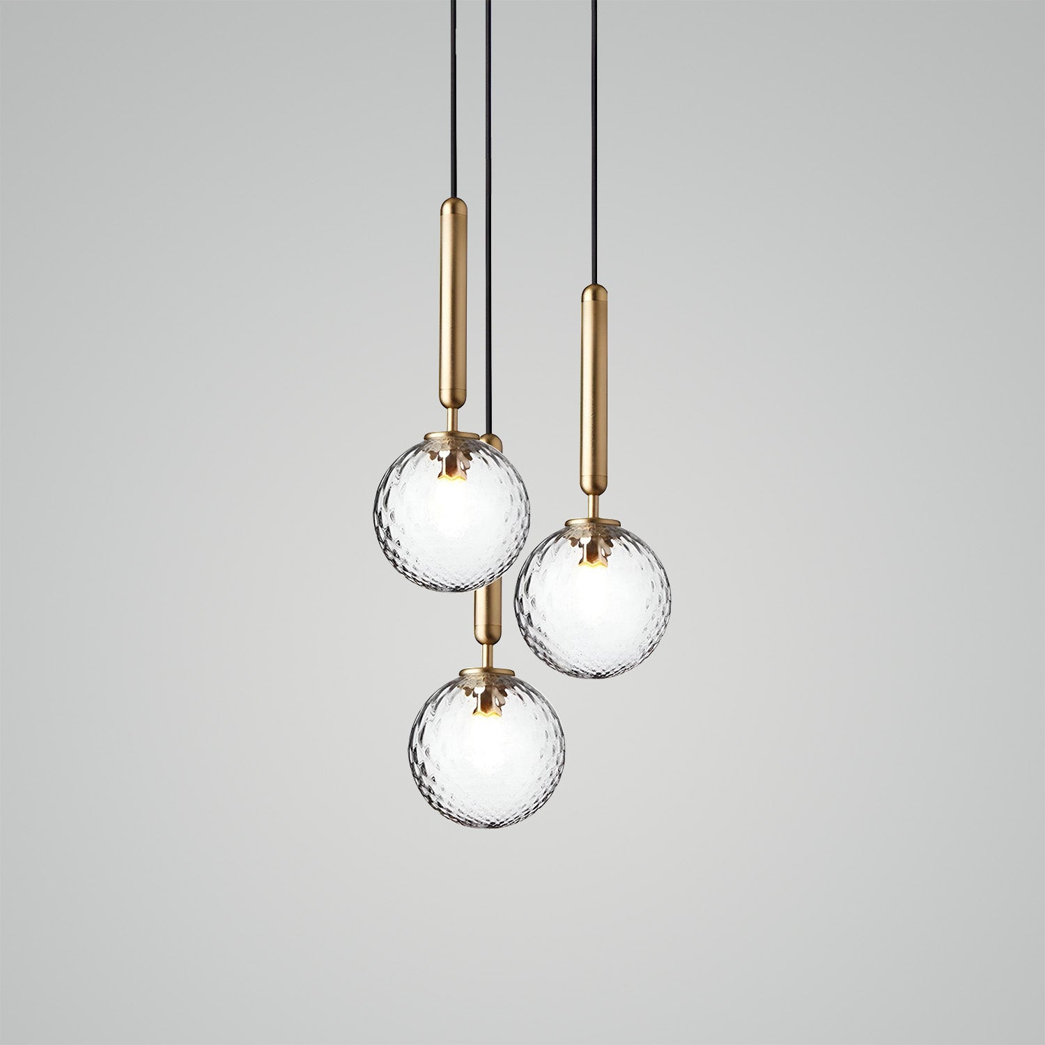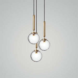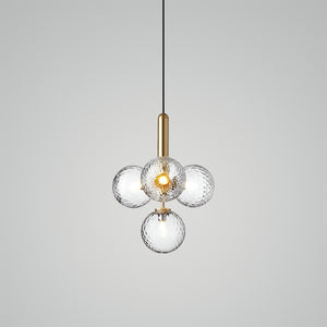 Introducing the "Miira Pendant Light," a celestial-inspired creation that brings the beauty of the night sky into your home. This pendant light features a constellation of textured glass spheres arranged in a harmonious cluster, each orb delicately diffusing light to create a soft, ambient glow. The elegant brass fittings add a touch of modern sophistication, ensuring this light fixture makes a bold statement in any setting. Ideal for illuminating a dining room with a warm, inviting atmosphere or adding a sculptural light source to a chic living area, the "Astral Orb Pendant" is a fusion of art and function. Illuminate your space with this stunning piece, designed for those who appreciate the allure of contemporary design with a whimsical twist.