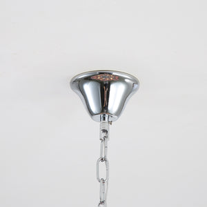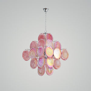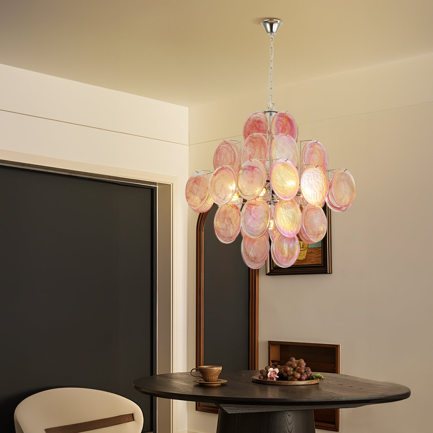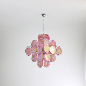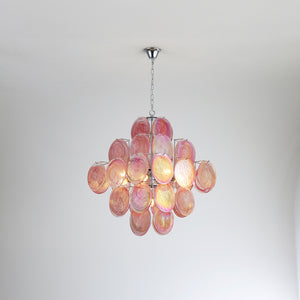 This chic Modernist chandelier features handblown Murano glass discs arranged in a diamond formation. Each disc is handmade and incorporates colorful glass at the center. The fittings are made of polished chrome, and the height of the chandelier can be adjusted to suit different needs. Additionally, this chandelier has been completely rewired and can use Edison bulbs with a maximum wattage of 40 watts per bulb.
