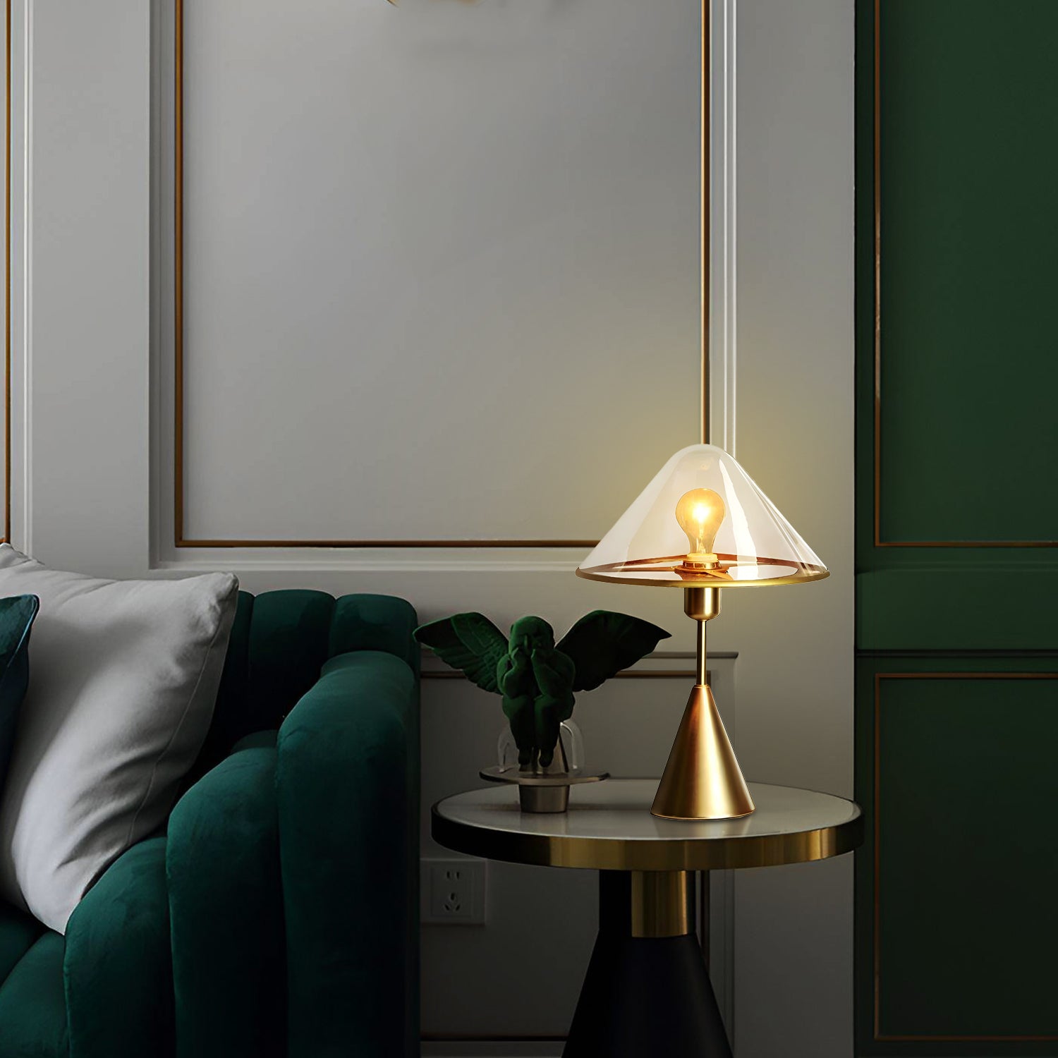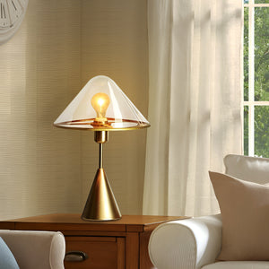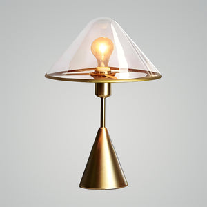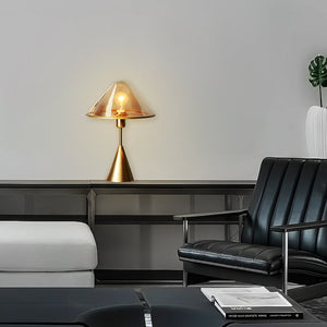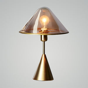 Introducing the Mushroom Table Lamp, a piece that captures the essence of modern sophistication with a touch of whimsy. Inspired by the natural shape of a mushroom, this lamp features a translucent glass shade that sits elegantly atop a sleek, conical metallic base. The warm hues of the lamp create a cozy, inviting atmosphere, perfect for setting a relaxed mood in any room. Its unique silhouette and the ambient light it casts make it an ideal companion for late-night reading or as a chic accent in a contemporary living space. Illuminate your home with the soft, golden radiance of the Aureate Glow Table Lamp, a true blend of function and style.