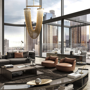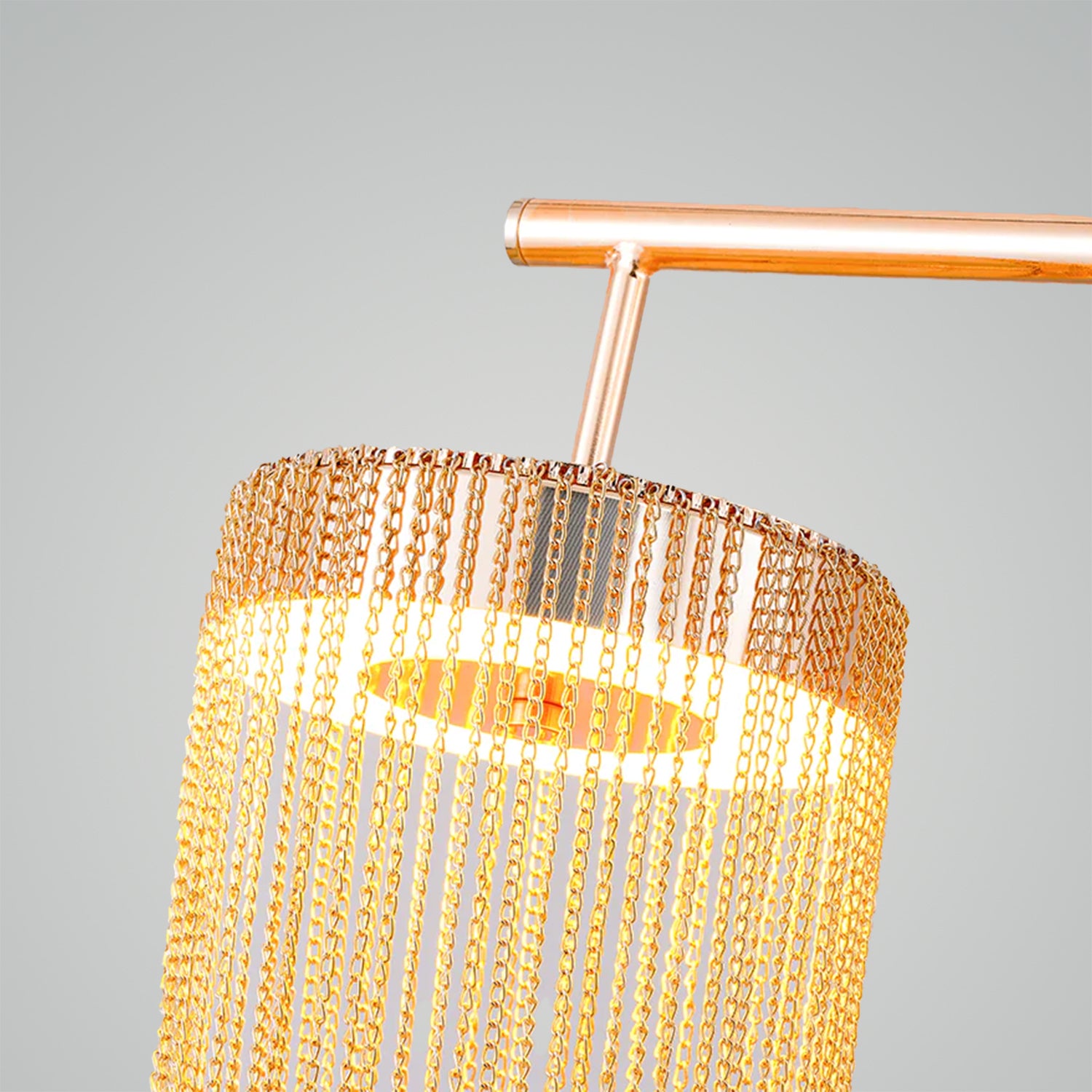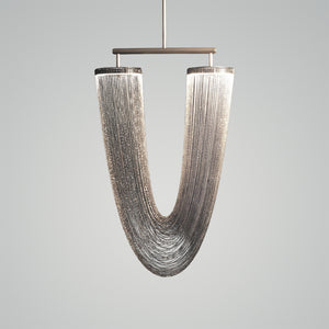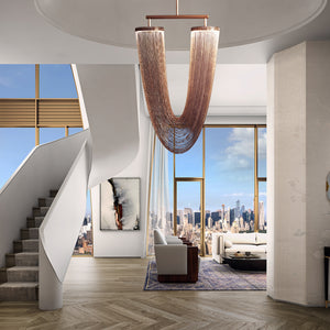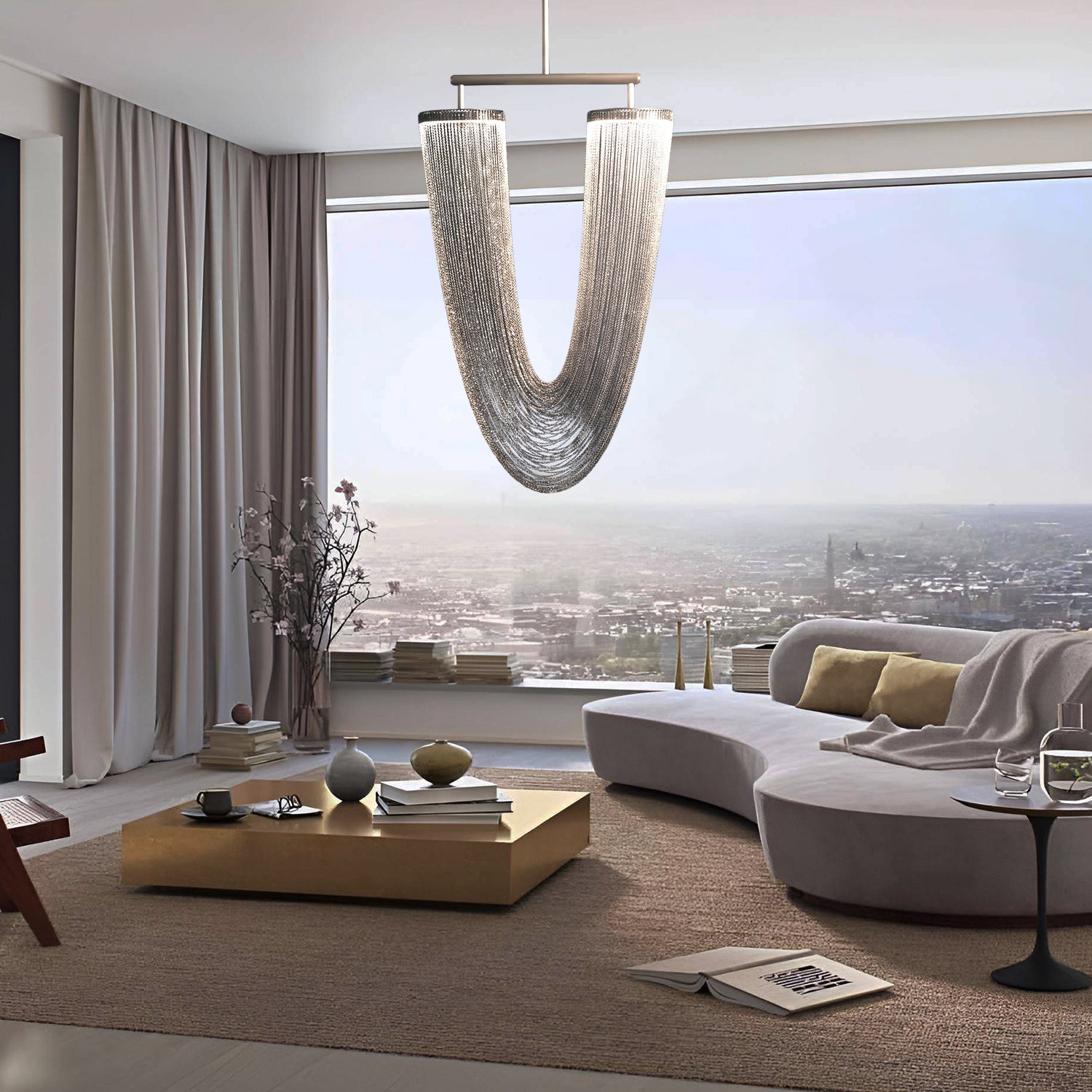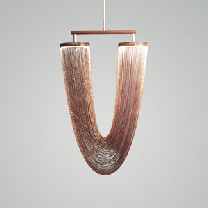 Step into a world of sophistication with the Otero Chandelier, a lighting fixture that embodies luxury and grace. This pendant light features layers of delicate strands that fall in a graceful U-shape, reminiscent of a waterfall's silky streams. The warm, coppery tones of the metal structure add a rich glow, while the multitude of tiny lights create a radiant, shimmering effect. Perfect for elevating the ambiance of a grand foyer, over a dining table, or in a lavish living area, the Cascading Elegance Pendant is a true statement piece. Illuminate your space with this magnificent light fixture and indulge in the opulence it brings to any environment.