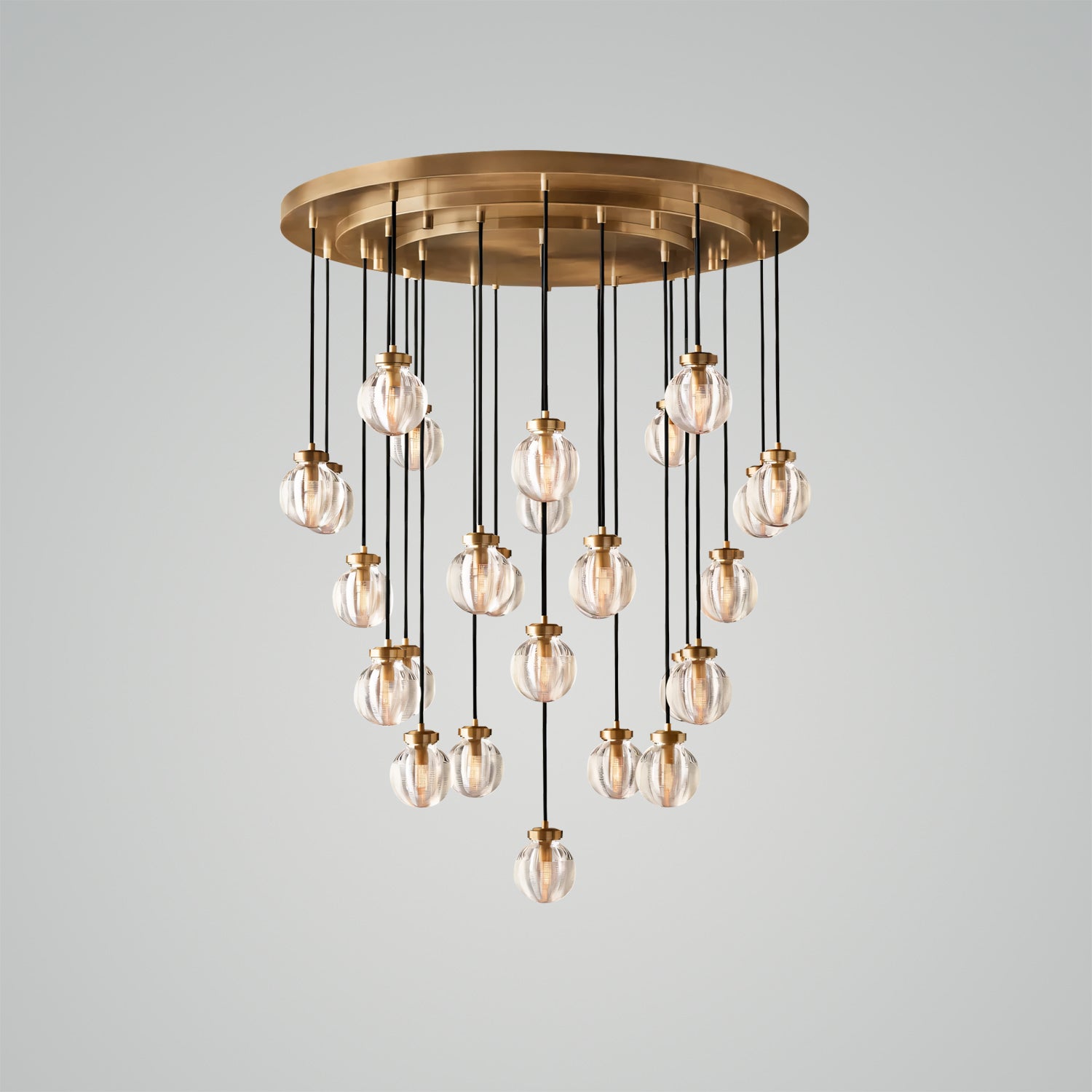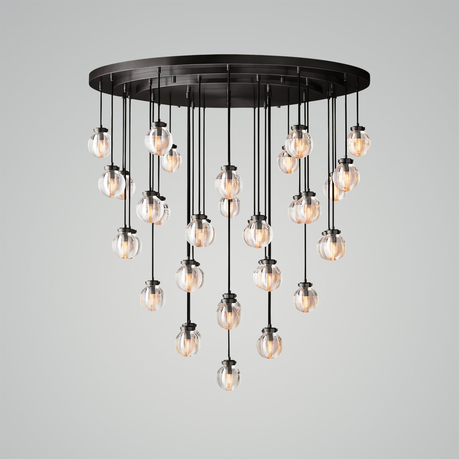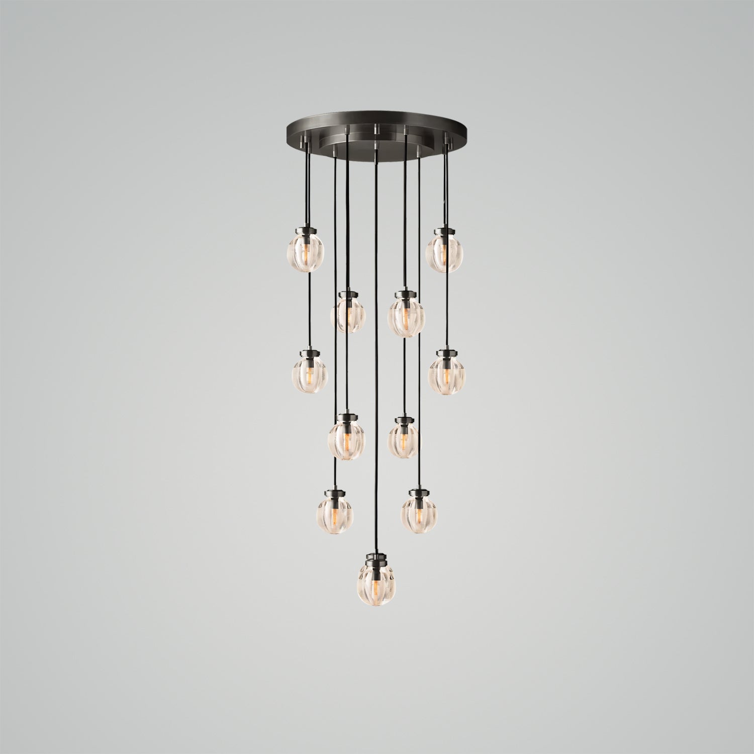 Glass pearls are carved with intricate grooves that create shimmering layers of light, bringing a lustrous, oceanic beauty to this collection. Influenced by the inciso technique developed by glass makers, the texture both filters the illumination and invites contemplation, making these pieces feel simultaneously ethereal and intimate.