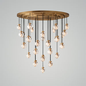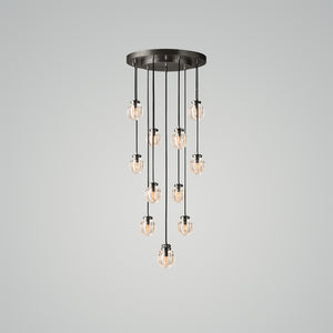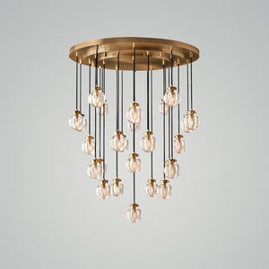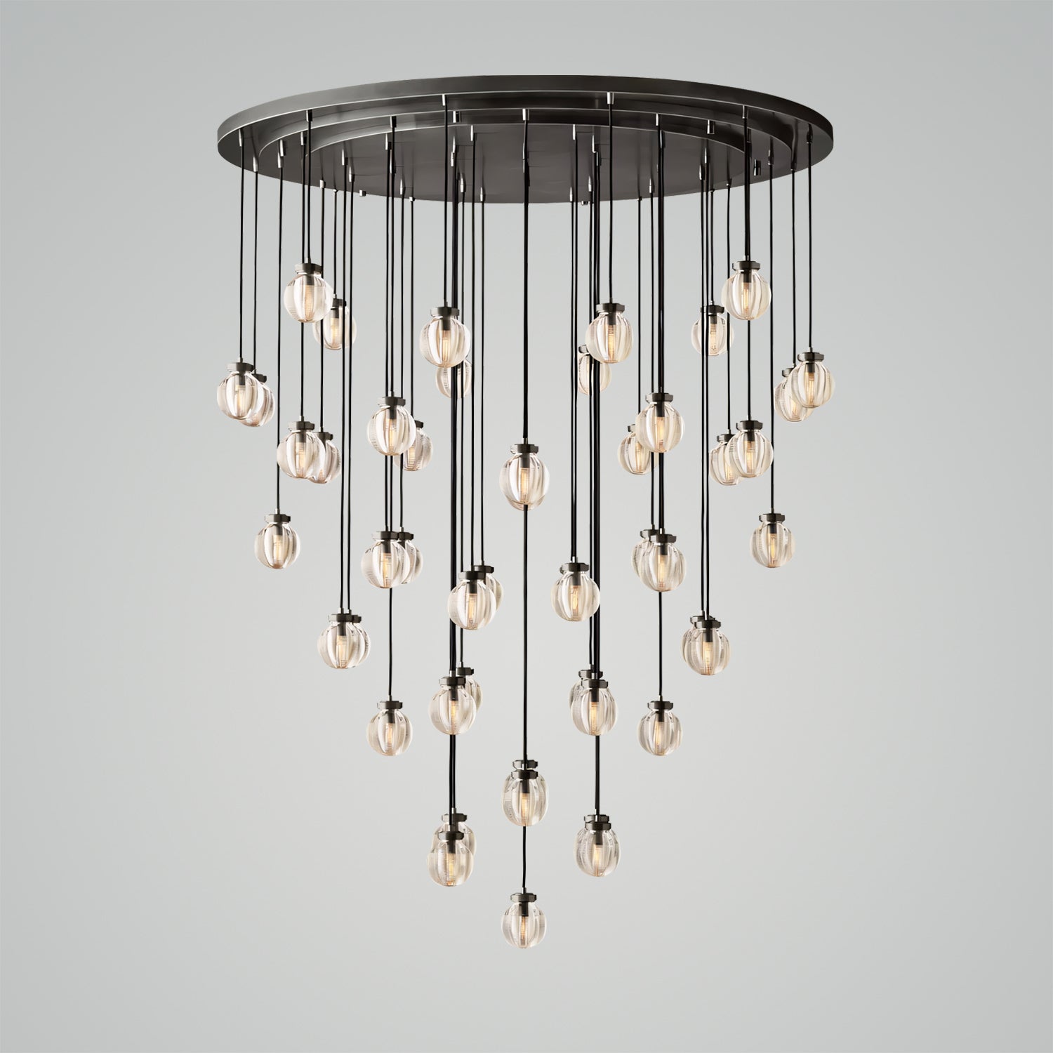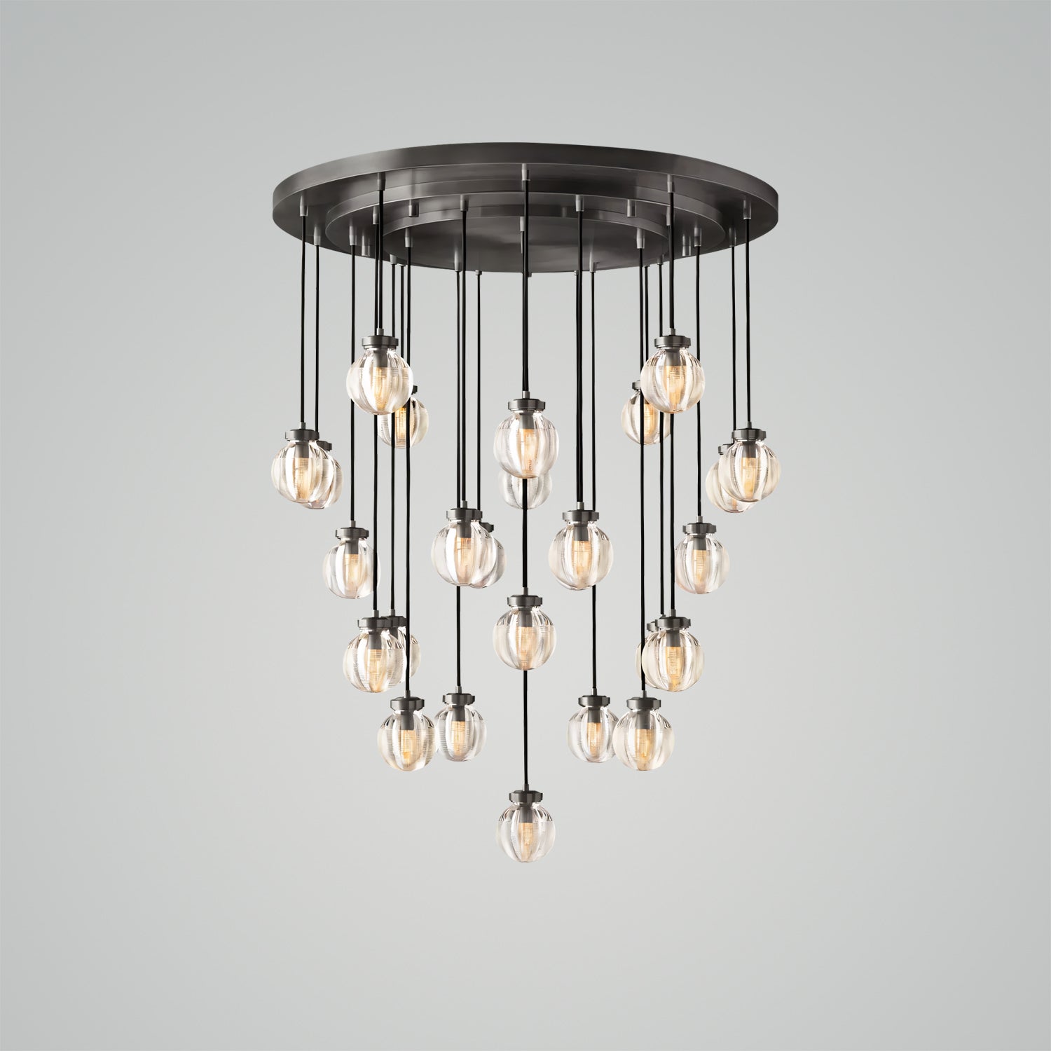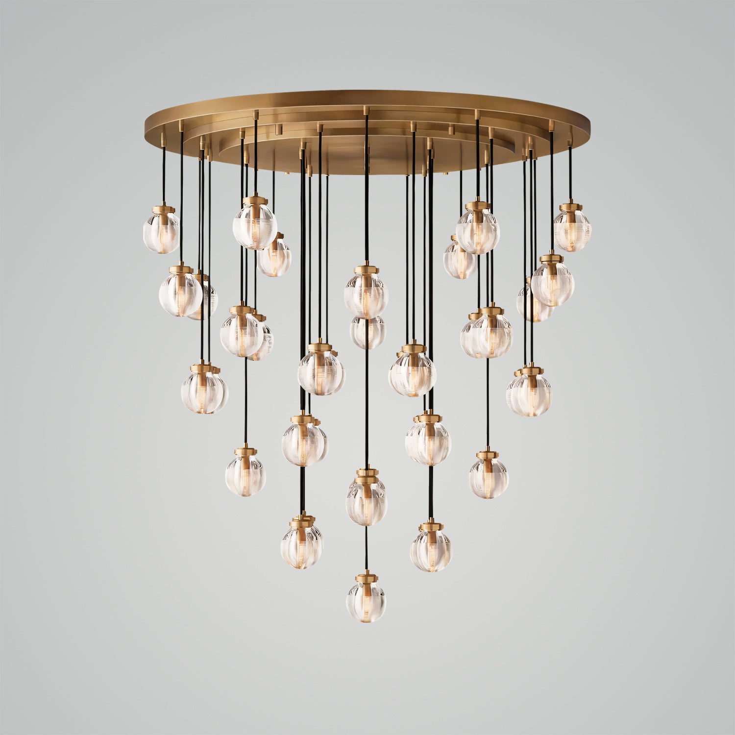 Glass pearls are carved with intricate grooves that create shimmering layers of light, bringing a lustrous, oceanic beauty to this collection. Influenced by the inciso technique developed by glass makers, the texture both filters the illumination and invites contemplation, making these pieces feel simultaneously ethereal and intimate.