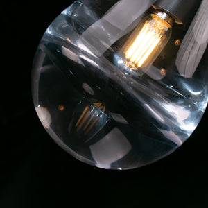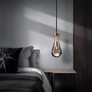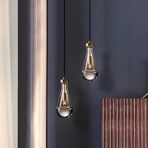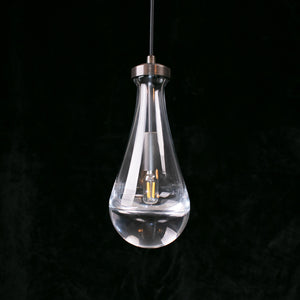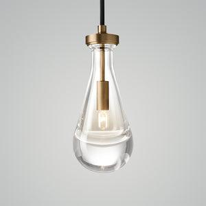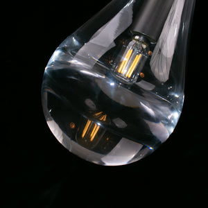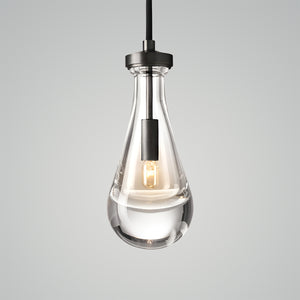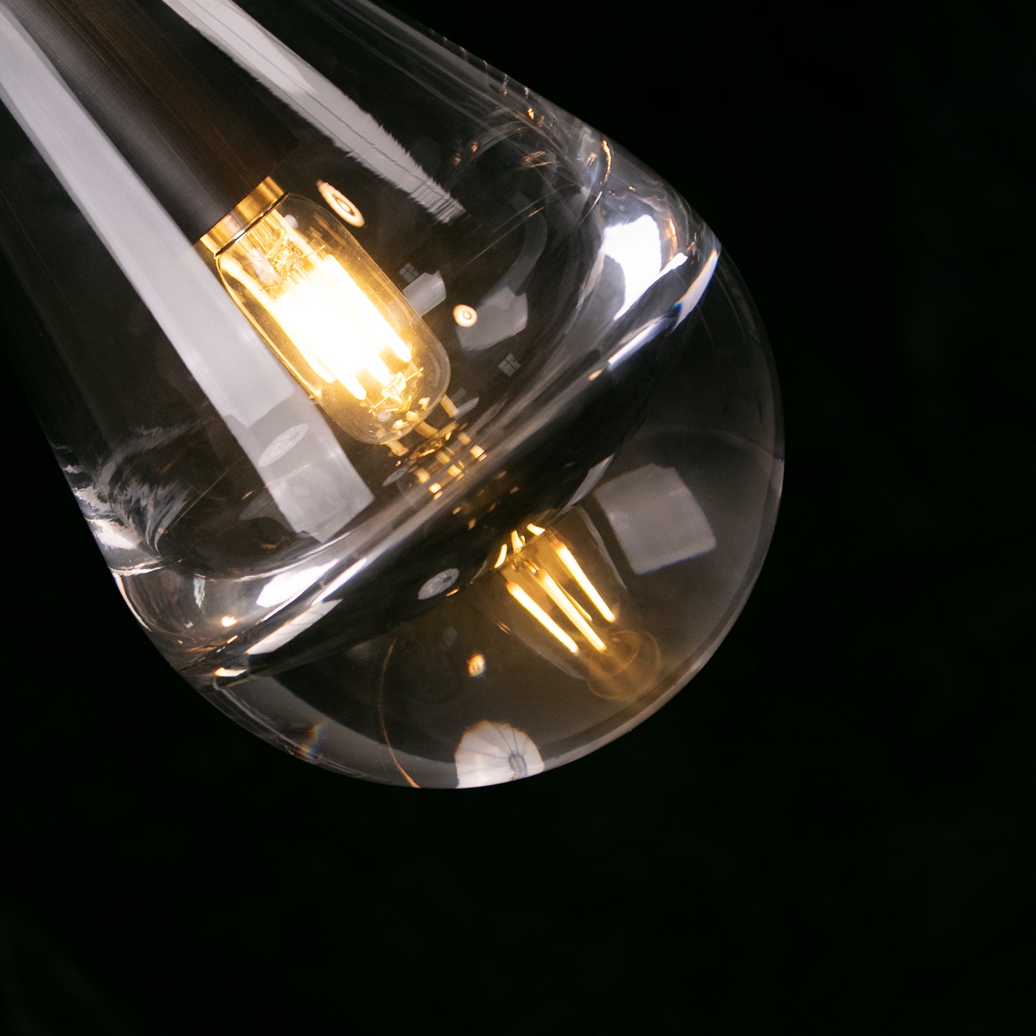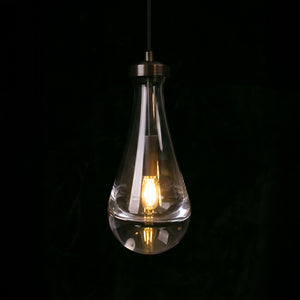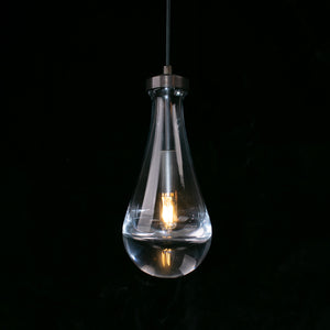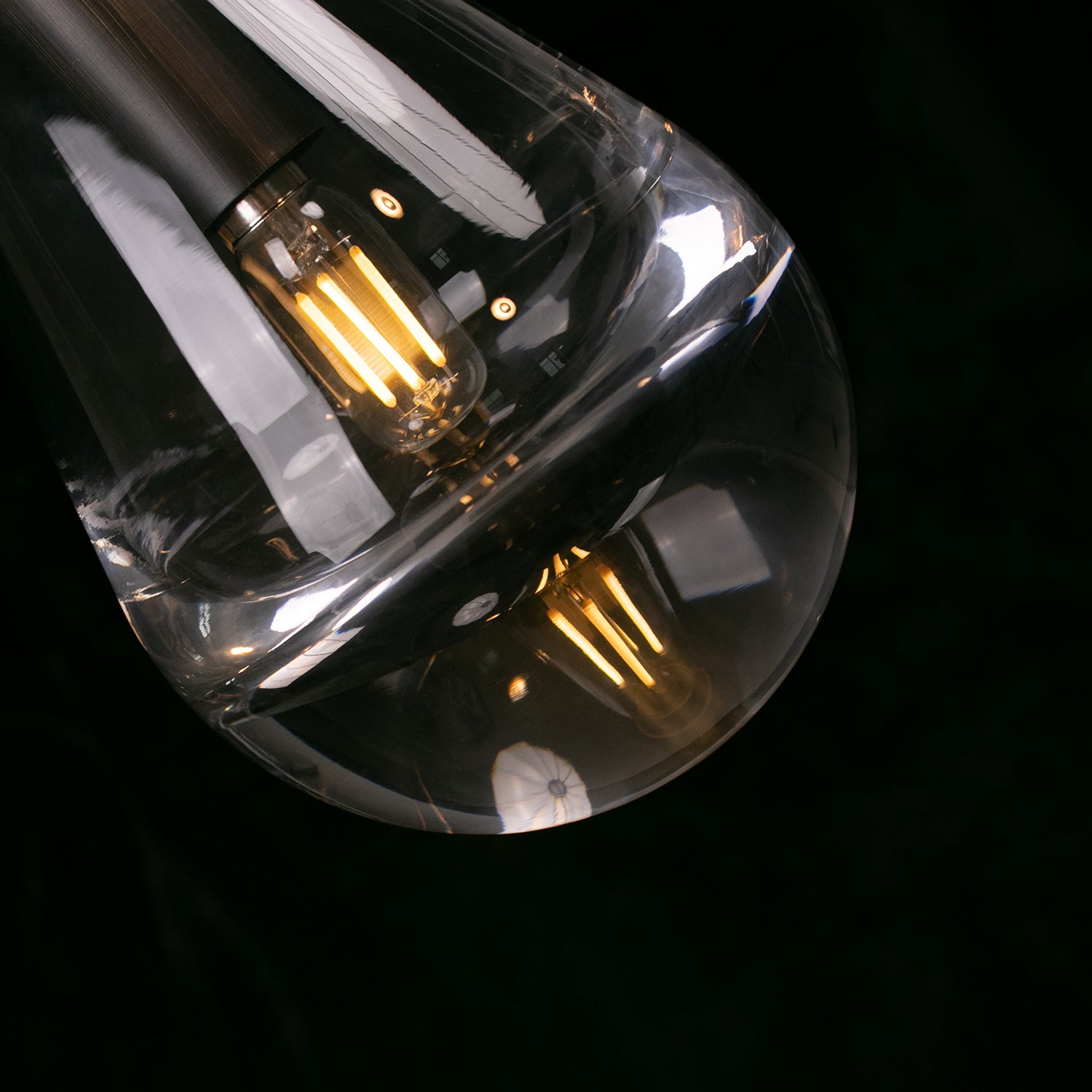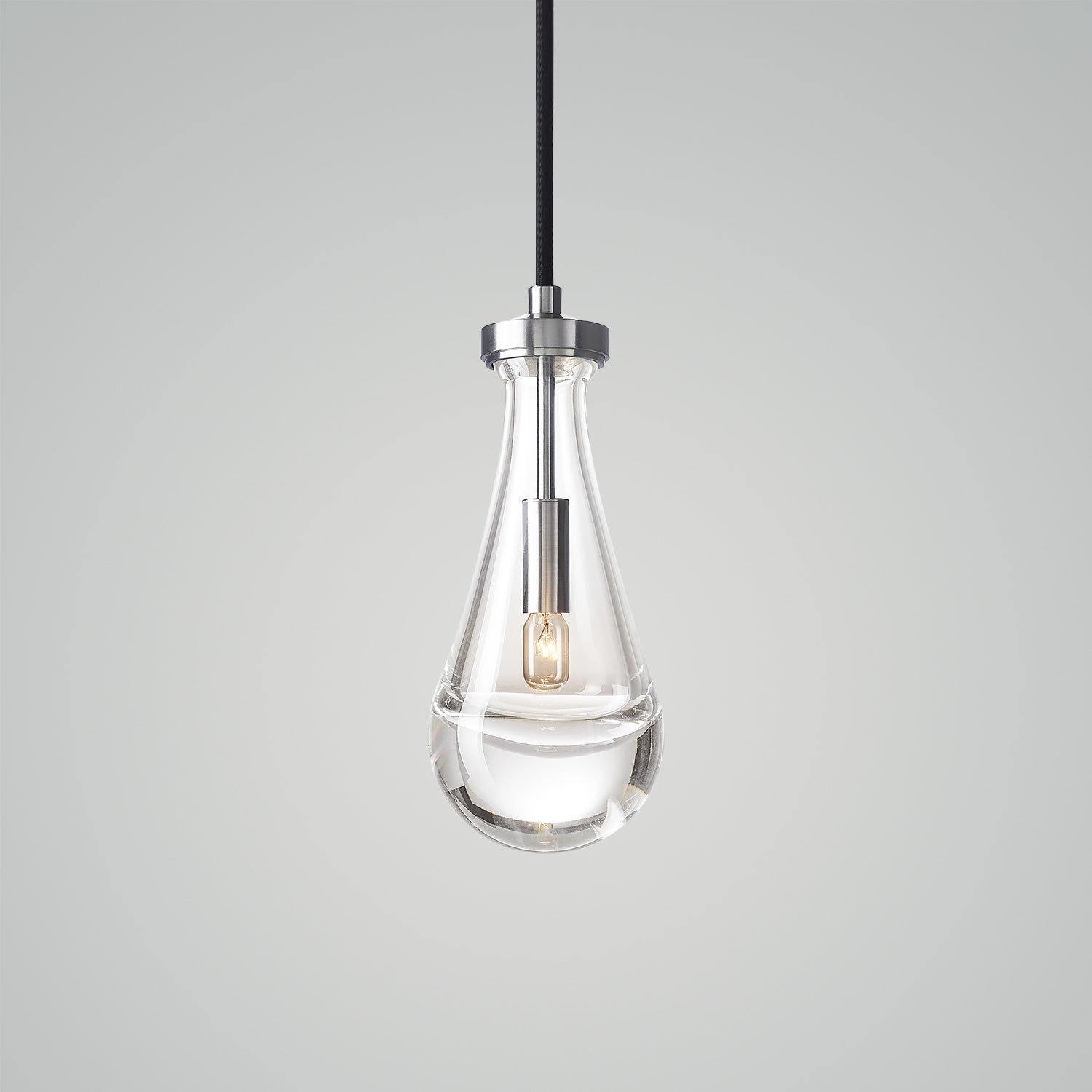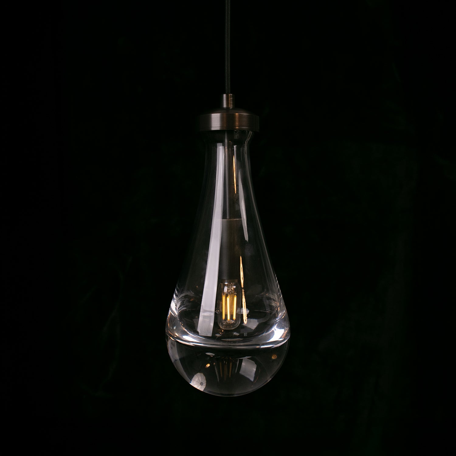 A master glass designer has created a dramatic interpretation of rain in this inspired collection. Suspended from a slim frame, a single drop of blown glass encases the bulb, emitting a soft glow.