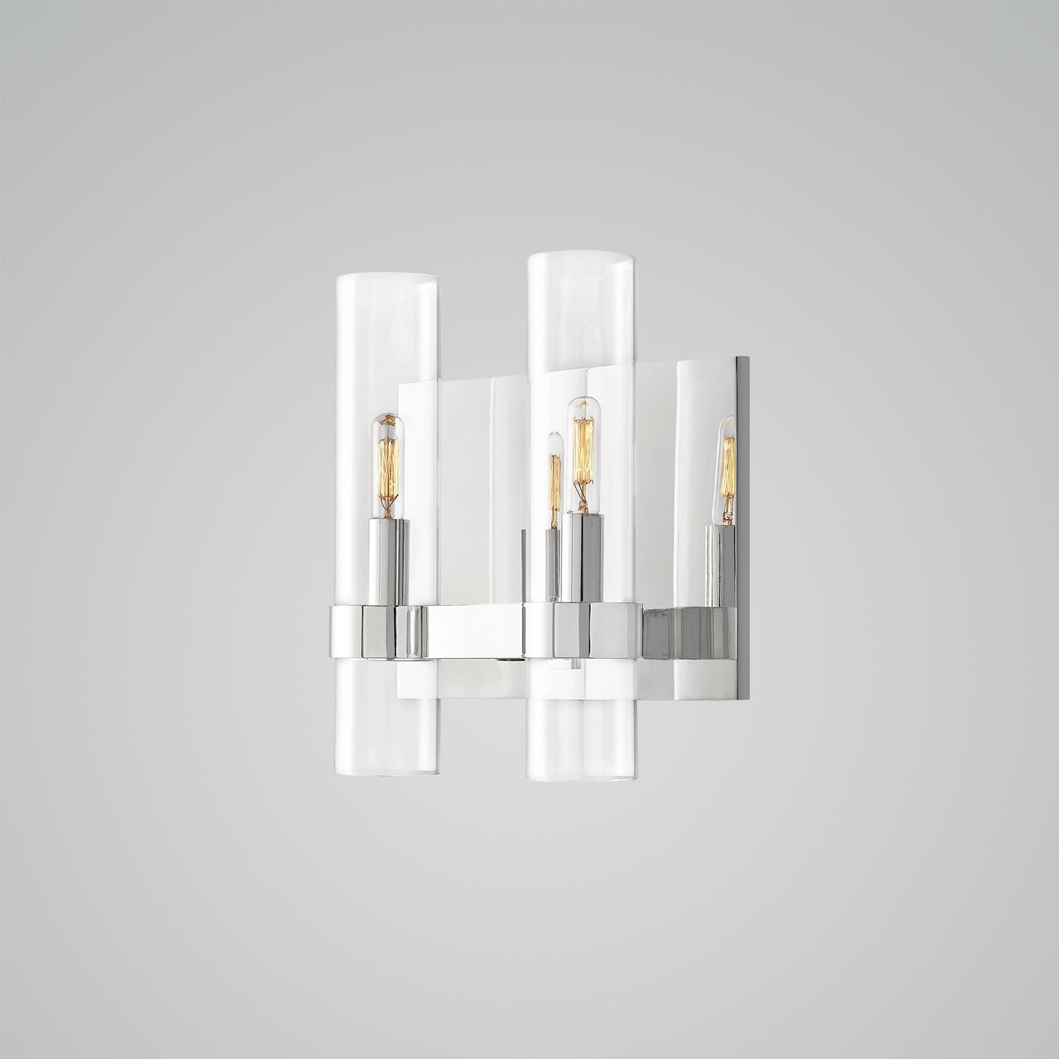 This collection reinterprets Art Deco forms with a modern minimalist sensibility. Crafted from solid steel, sleek metal bands securely hold slender glass cylinders, presenting a perfect sense of balance. Within each cylinder, Edison bulbs flicker like dancing candlelight.