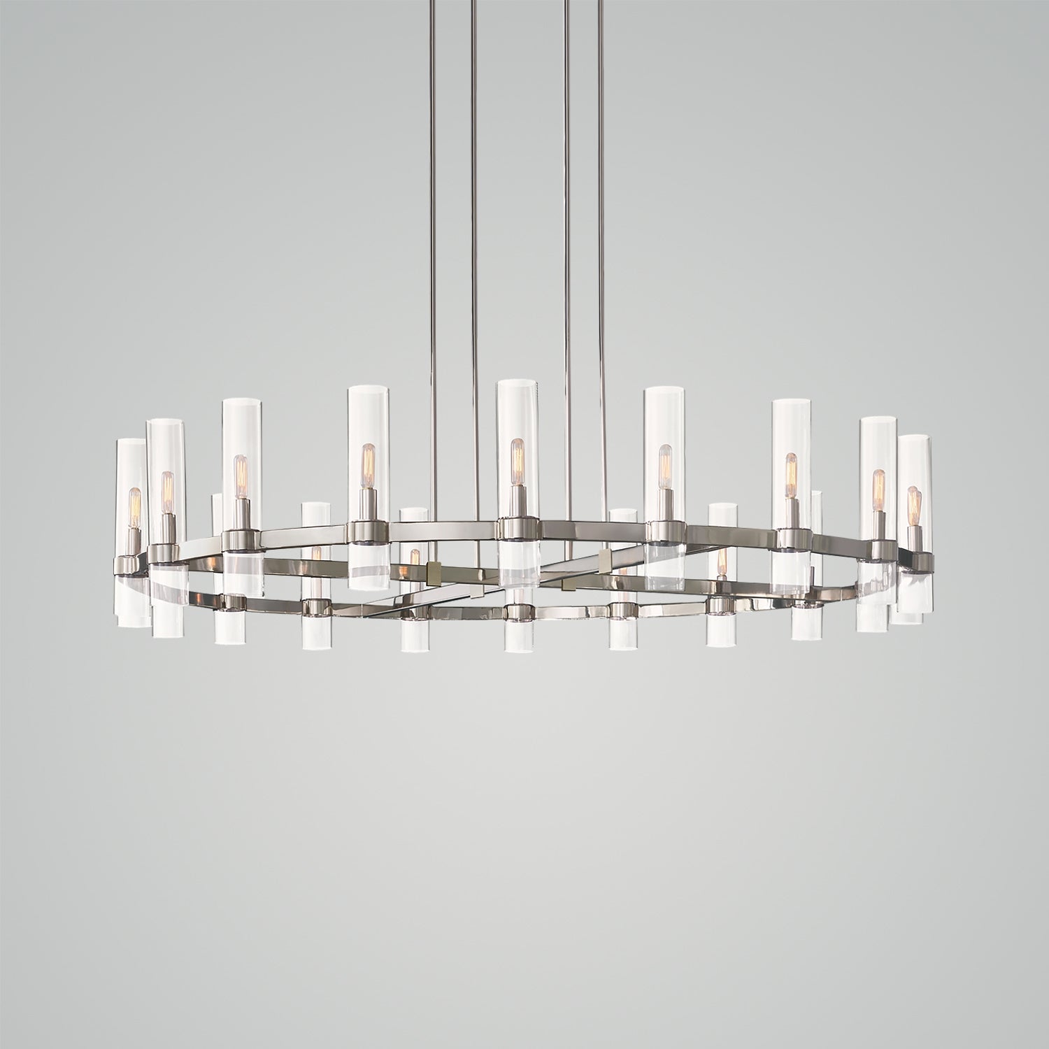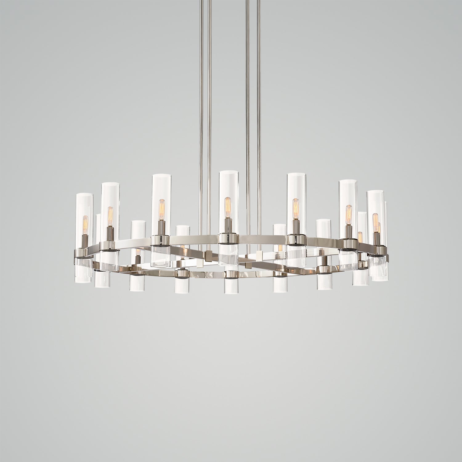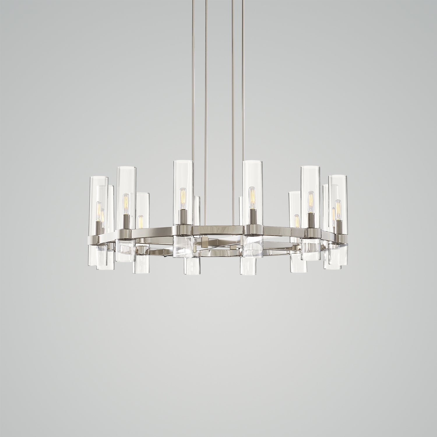 A renowned lighting designer reinterprets Art Deco style with a modern minimalist sensibility in this collection. Crafted from solid steel, unadorned metal bands securely hold the slender glass shades in place, maintaining perfect balance. Inside each shade, Edison bulbs glow softly like flickering candles.