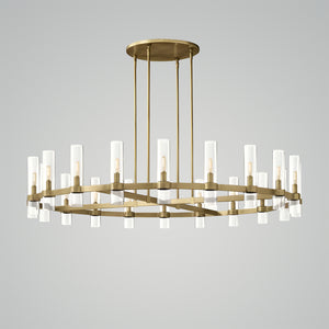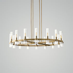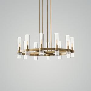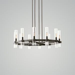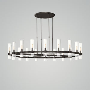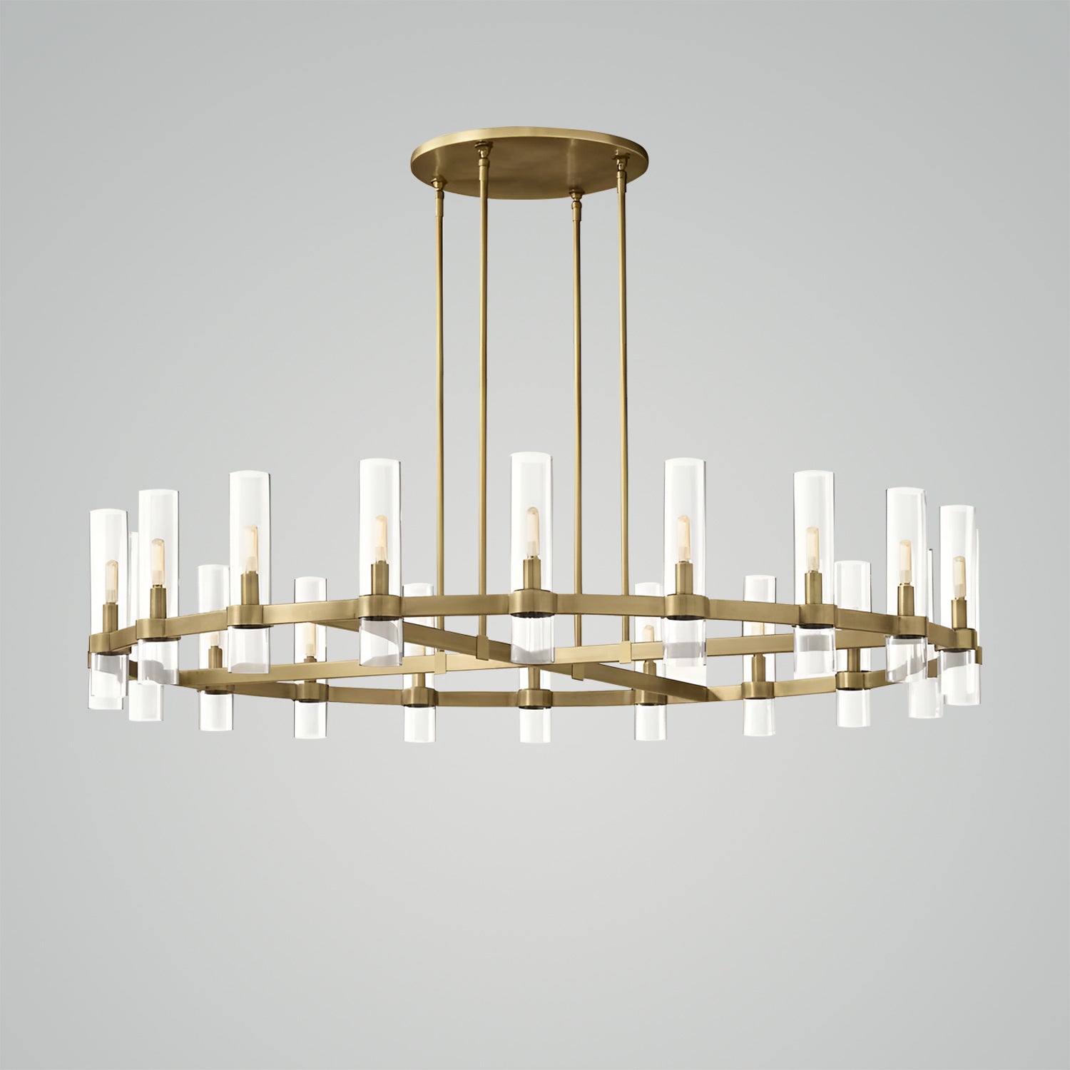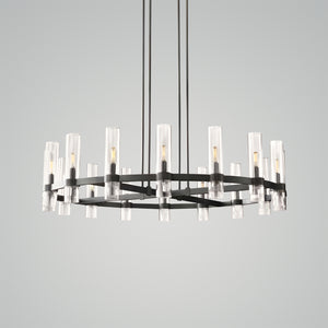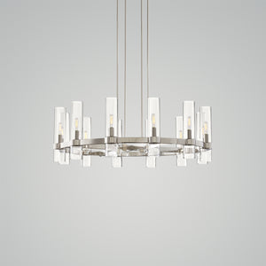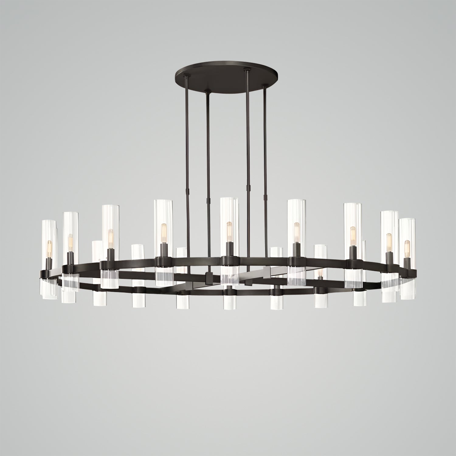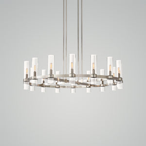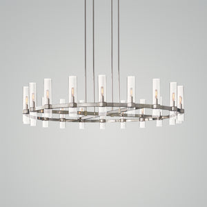A renowned lighting designer reinterprets Art Deco style with a modern minimalist sensibility in this collection. Crafted from solid steel, unadorned metal bands securely hold the slender glass shades in place, maintaining perfect balance. Inside each shade, Edison bulbs glow softly like flickering candles.