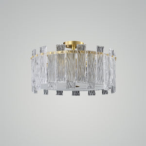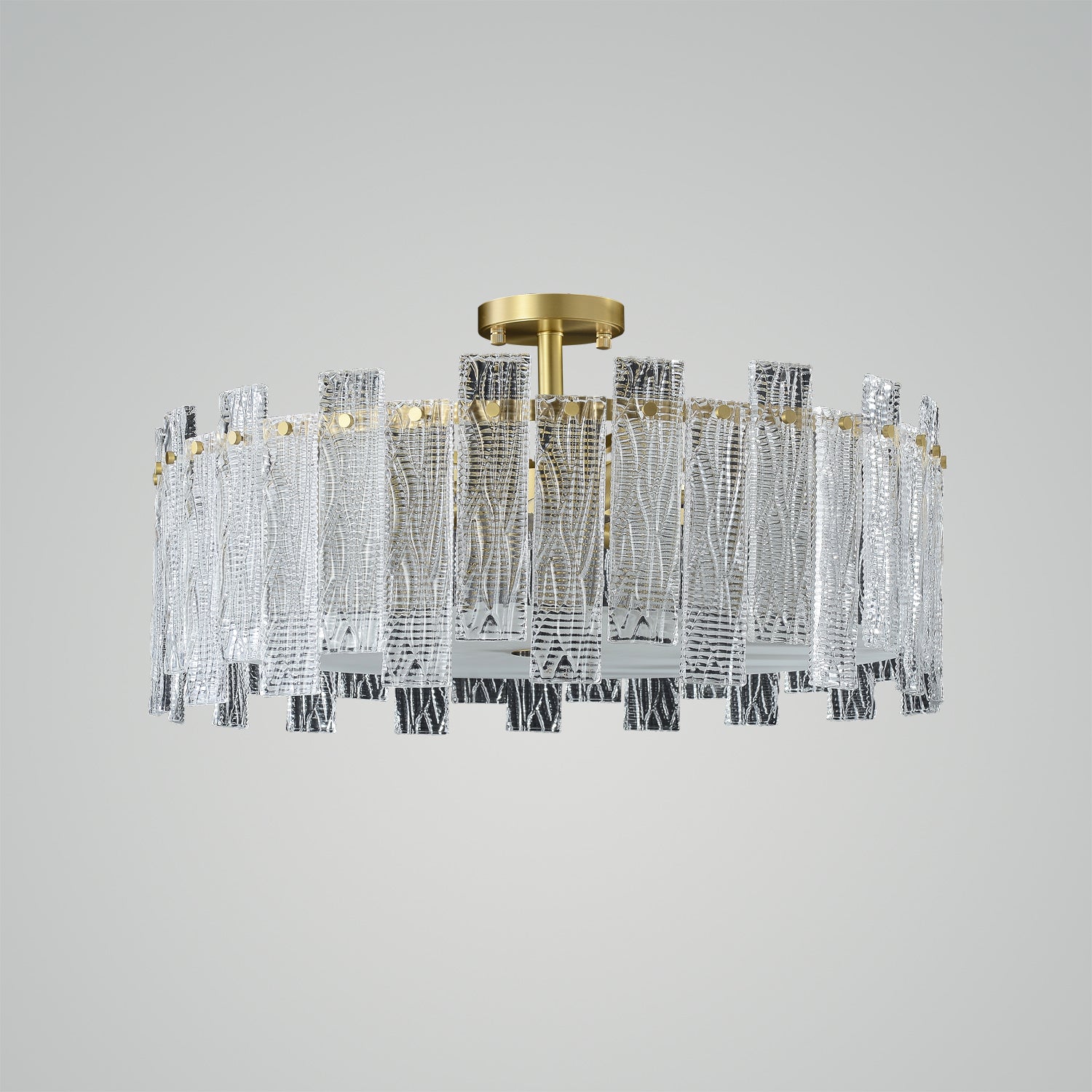 This fixture captures the glamour of 1960s Italian glass lighting. Within a sleek metal frame, dozens of hand-raked glass panes create a fluted texture, producing a dramatic play of light and a softly diffused glow.
