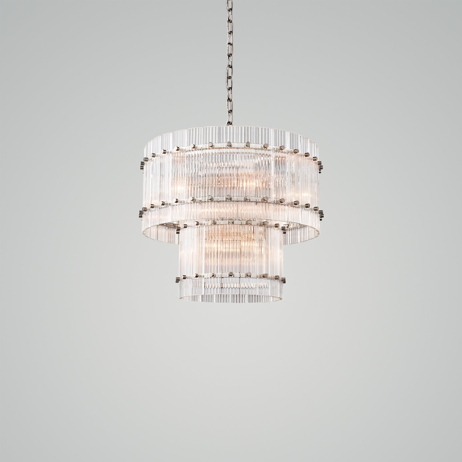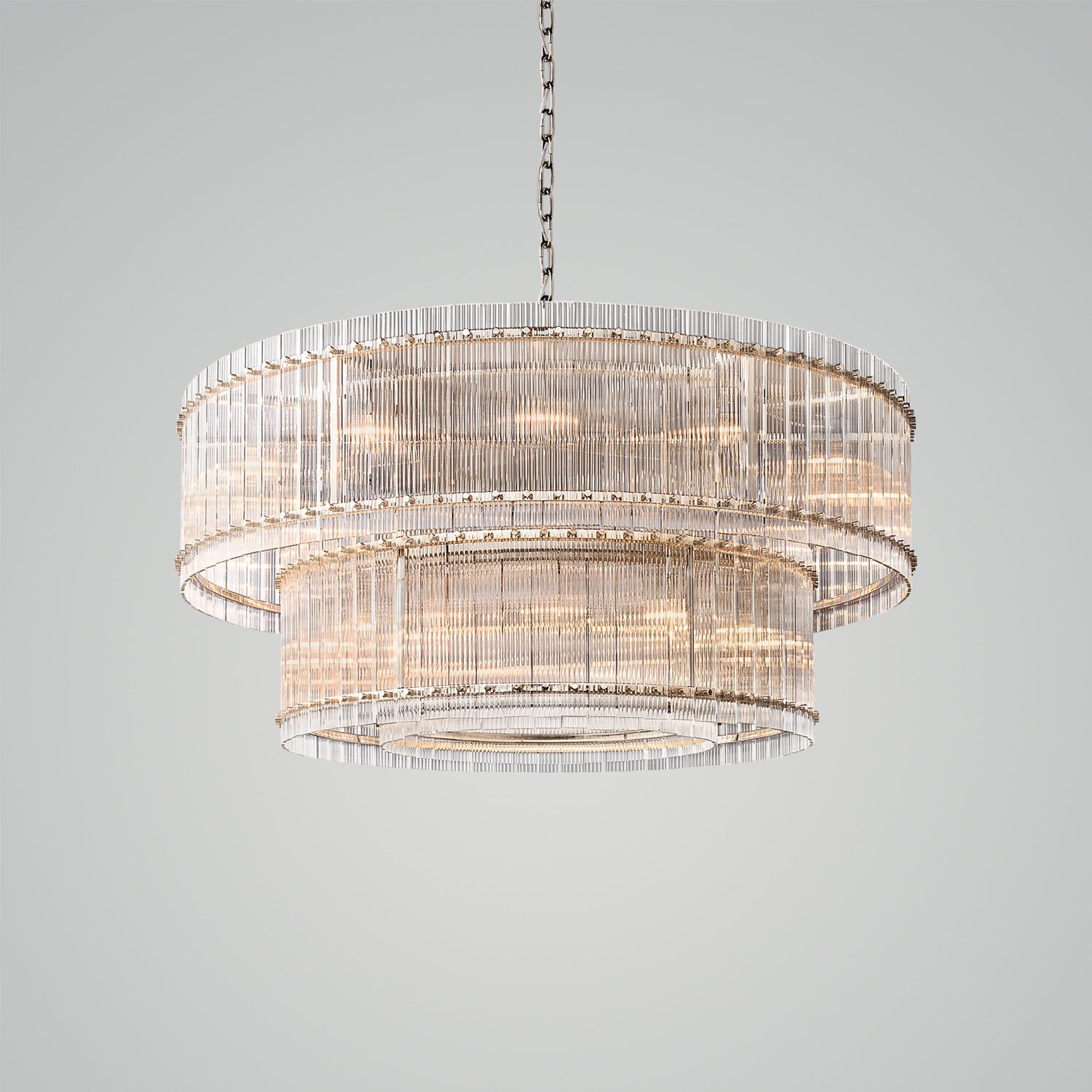 Our fixture, designed by a renowned designer, evokes the glamour of 1960s Italian glass lighting. Dozens of glass panes are arranged within a sleek metal frame, hand-raked to create a fluted texture that produces a dramatic play of light and emits a softly diffused glow.