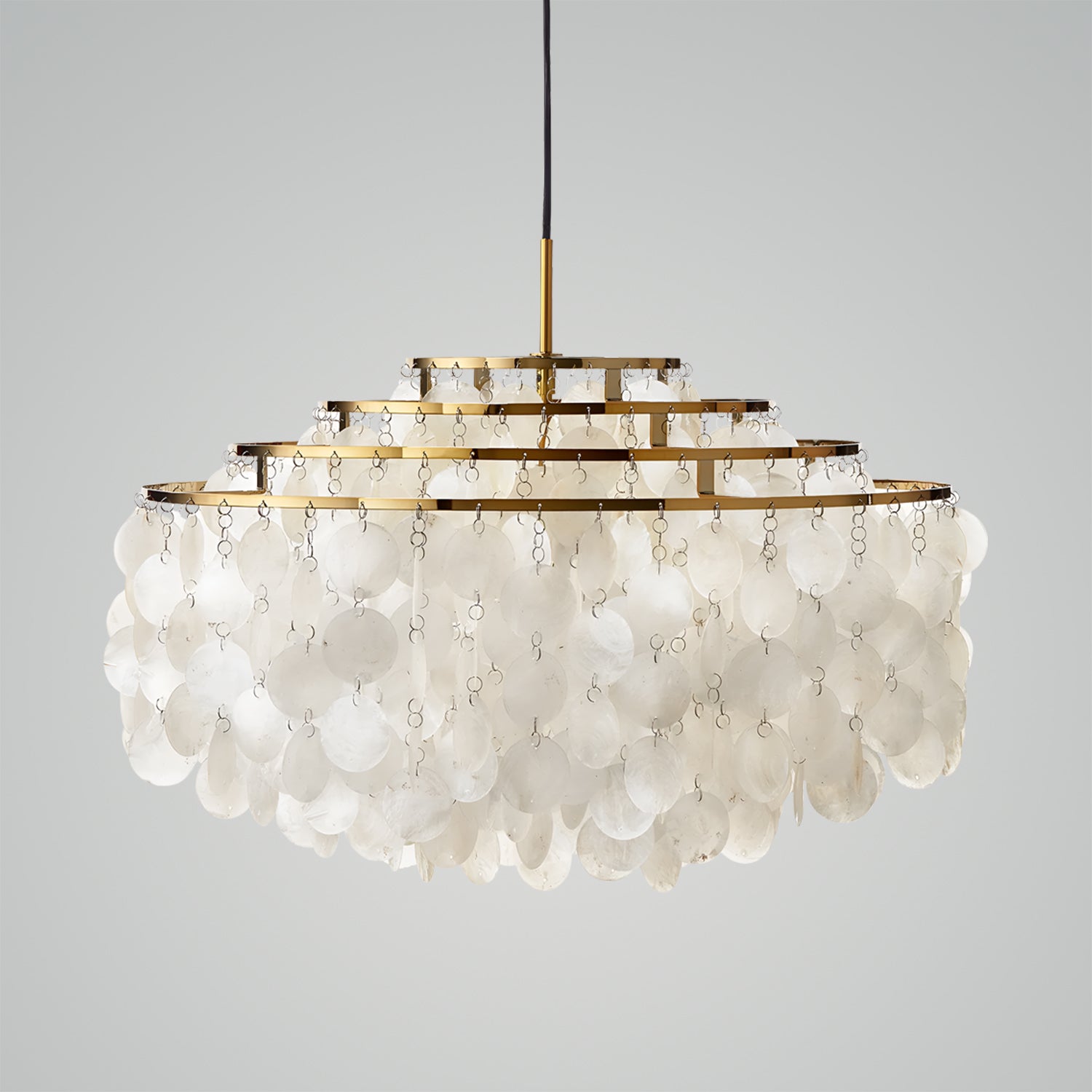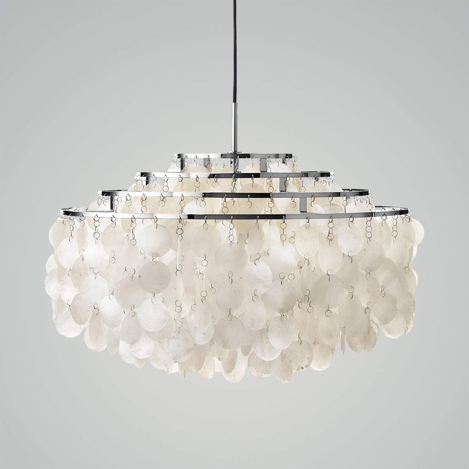 Many regard this collection as one of the greatest masterpieces in the field of lighting design. Since 1964, this pendant lamp has brought joy and given rise to countless stories. The large pendant lamp features a four-ring chrome frame.