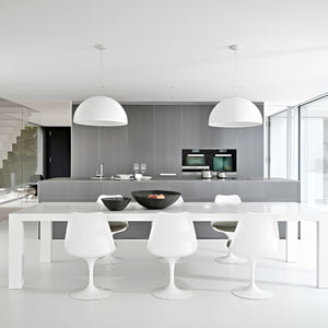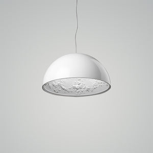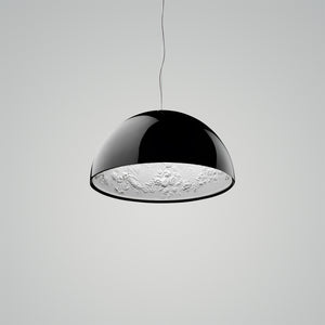 The suspension luminaire provides diffused lighting. It features a hemispherical, mechanically processed cast plaster diffuser, painted white on the inside. The outer finishes are available in rust, glossy black, glossy white, or matte gold. The plaster diffuser support is made of die-cast aluminum alloy with a liquid white paint finish. The upper bushing is made of die-cast polished aluminum alloy, with transparent paint applied to all visible parts. The upper cable gland and locking ring nut are made of black injection-molded polycarbonate (PC). Molded galvanized adjustment screws are included. Transparent, injection-molded upper and lower silicone shock absorbers are present. The lamp holder and fixing support are made of black injection-molded polyphenylene sulfide (PPS). The diffuser is made of flashed and blown opal glass. The molded fixing ring nut is made of die-cast aluminum alloy with Alodine plating. The decorative frieze is made of photo-etched and mechanically drawn AISI 304 stainless steel. The ceiling attachment is made of molded and galvanized steel, with a gray injection-molded nylon (PA6) rose.