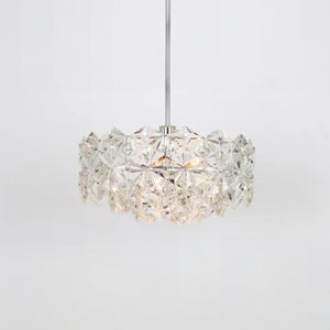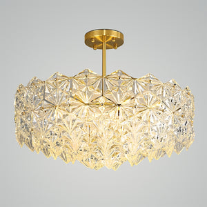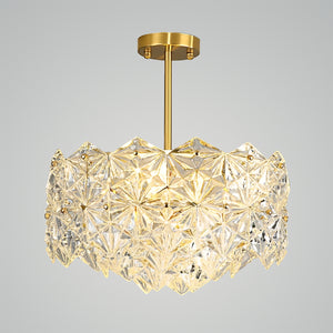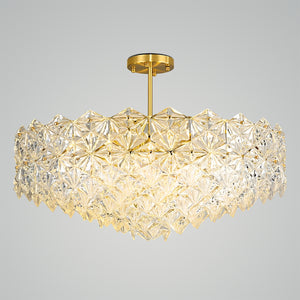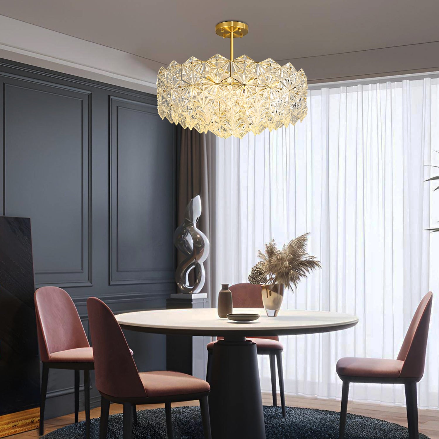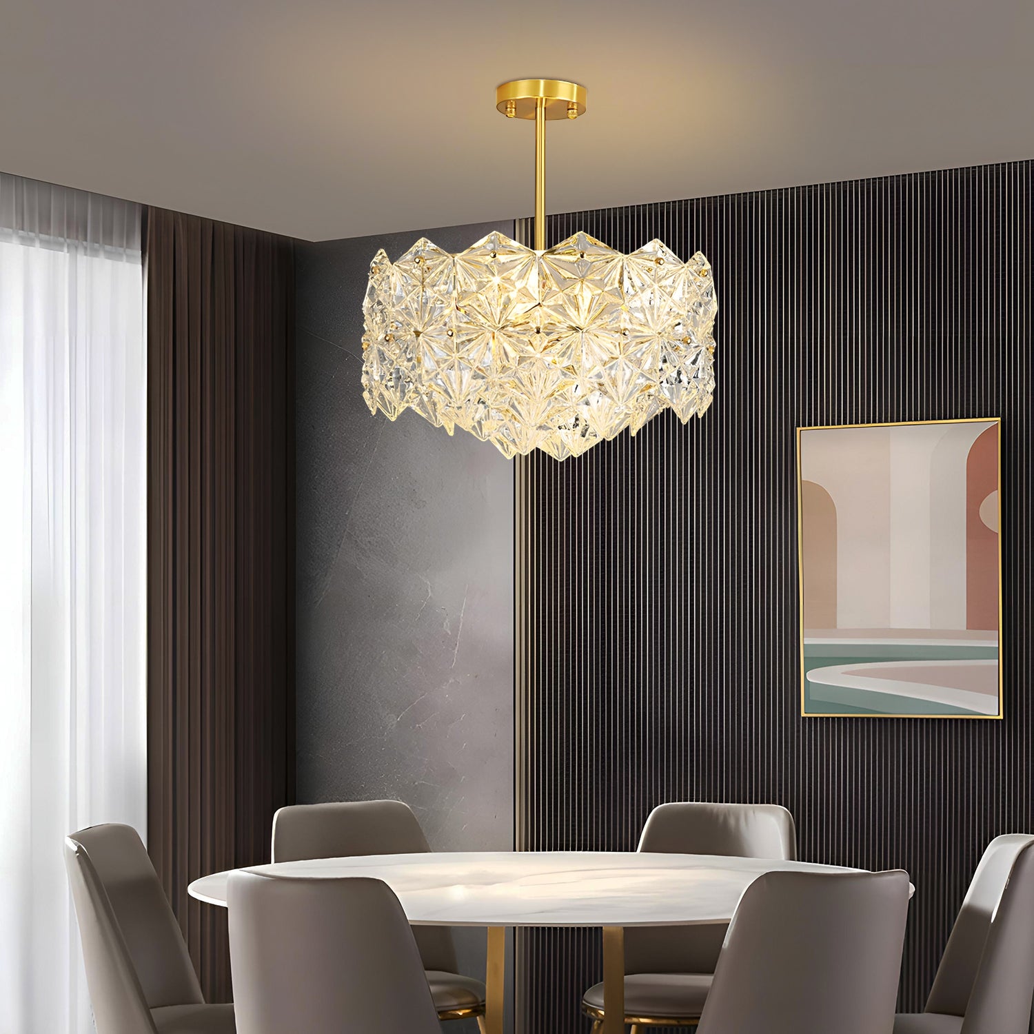 Introducing the Snowflake Glass Chandelier, a masterpiece that transforms any room into a resplendent space. Crafted with precision, this chandelier features a multitude of patterned glass prisms that cascade light into a spectrum of brilliance. Each glass piece is meticulously placed to form a stunning canopy of reflective elegance. The golden hardware adds a touch of luxury, ensuring this lighting fixture will be the centerpiece of admiration in your home. Illuminate your dining room, foyer, or living space with this radiant piece, and bask in the opulent glow of modern sophistication.