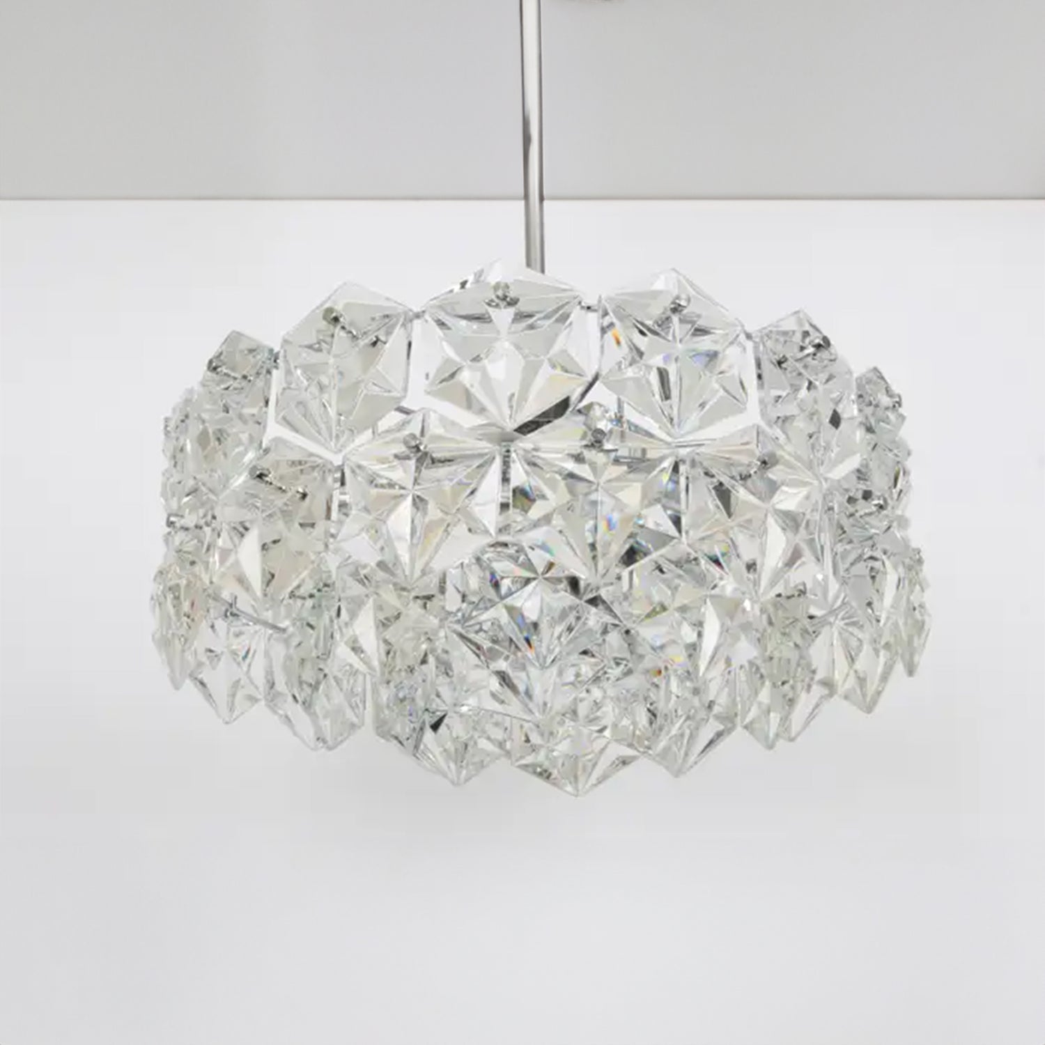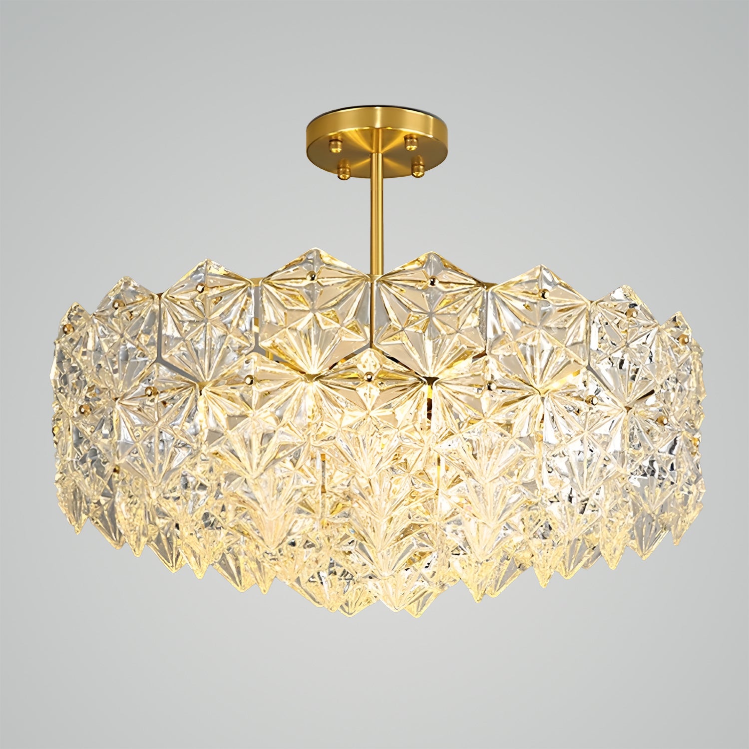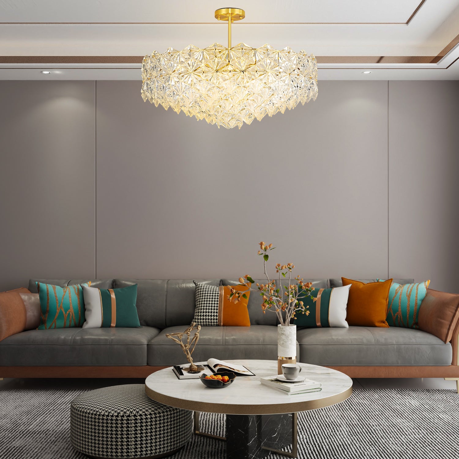 Introducing the Snowflake Glass Chandelier, a masterpiece that transforms any room into a resplendent space. Crafted with precision, this chandelier features a multitude of patterned glass prisms that cascade light into a spectrum of brilliance. Each glass piece is meticulously placed to form a stunning canopy of reflective elegance. The golden hardware adds a touch of luxury, ensuring this lighting fixture will be the centerpiece of admiration in your home. Illuminate your dining room, foyer, or living space with this radiant piece, and bask in the opulent glow of modern sophistication.