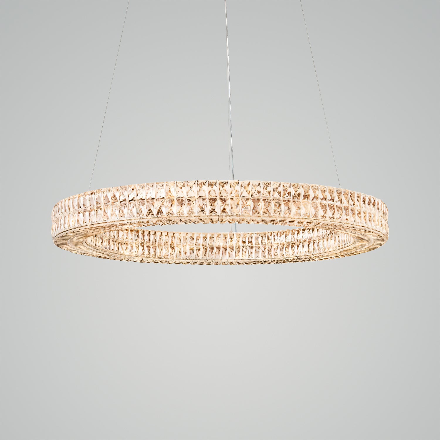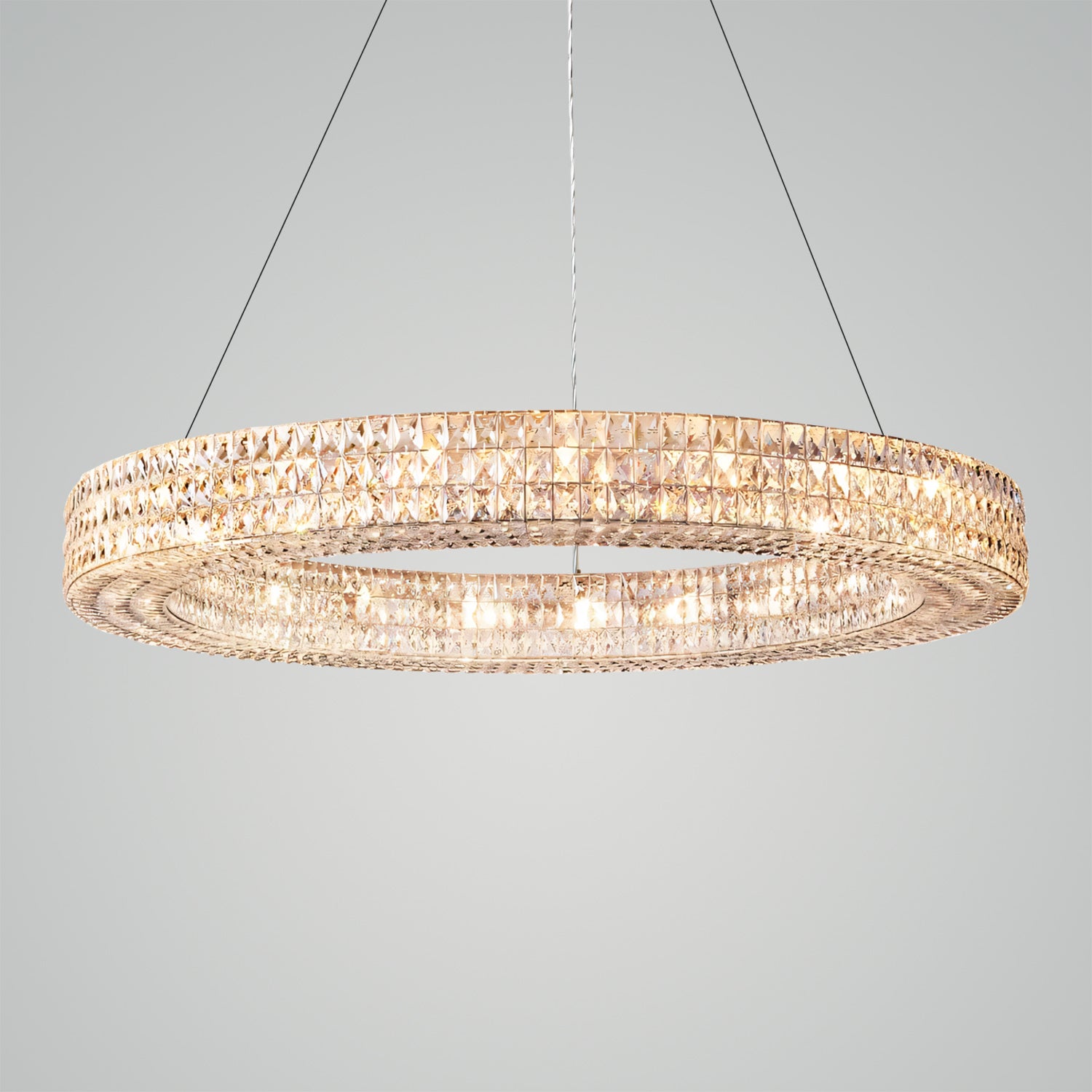 This fixture echoes the luxurious design style of 1960s Austrian lighting, with faceted crystals hand-set within a matte iron frame and suspended by slender wires, creating a sparkling focal point.