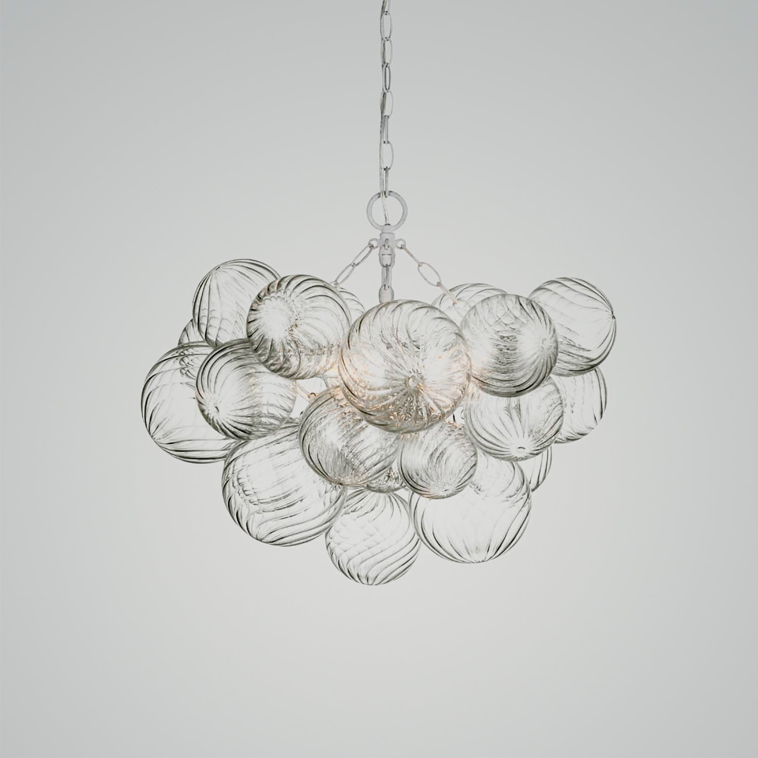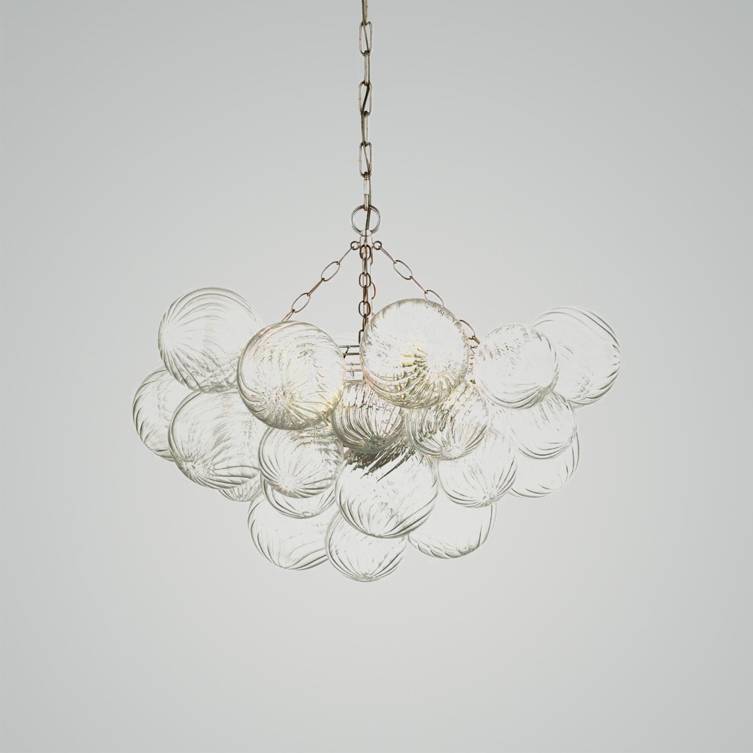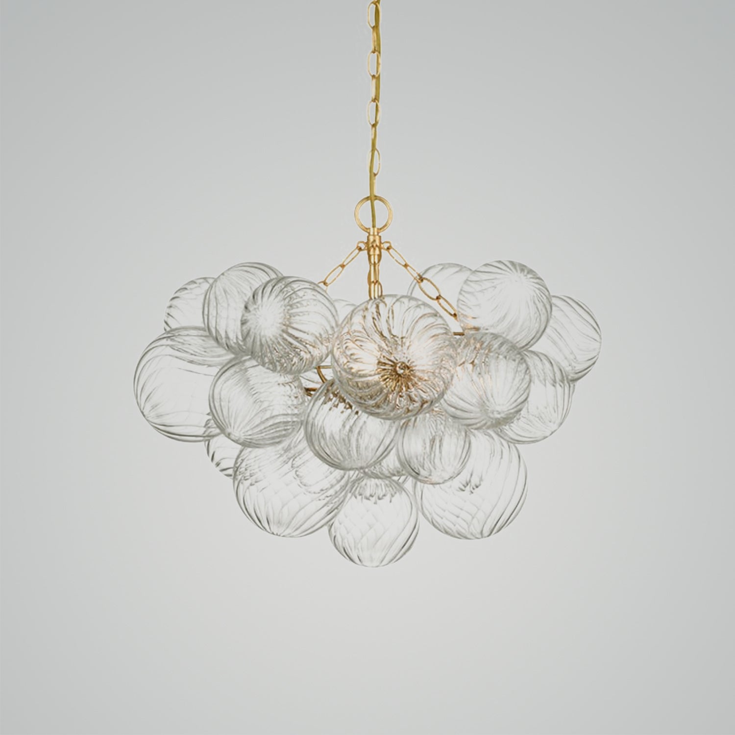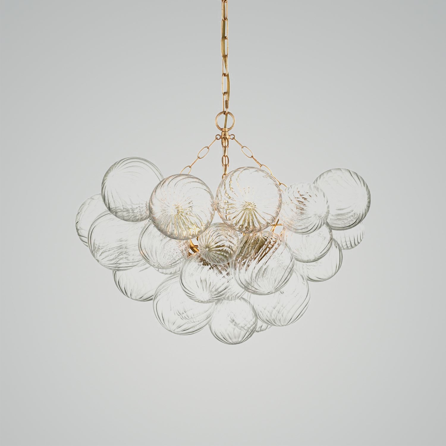 Handcrafted glass elevates a series of designs, giving new life to simple glass ball fixtures. Light flickers through multiple swirling glass orbs fixed in a metal basket, creating a whimsical atmosphere. The series offers various sizes and configurations, adding a dynamic combination of sparkling glass, round shapes, and bright metal to any interior space. Choose pendant lights for entryways and dining areas, or opt for recessed or wall lights for living spaces or bedrooms, adding a playful, feminine touch to any environment.