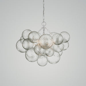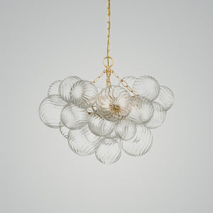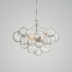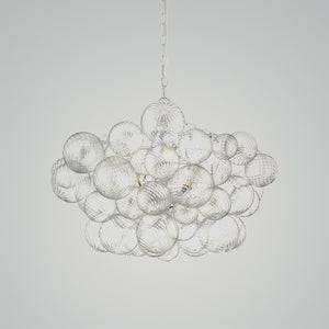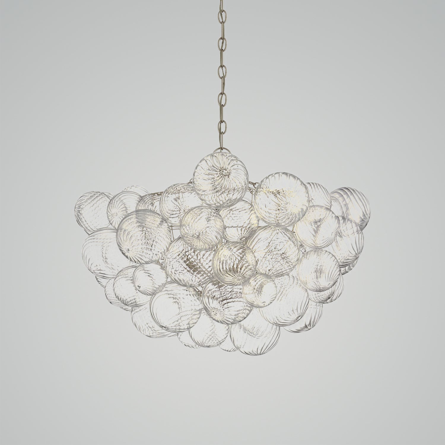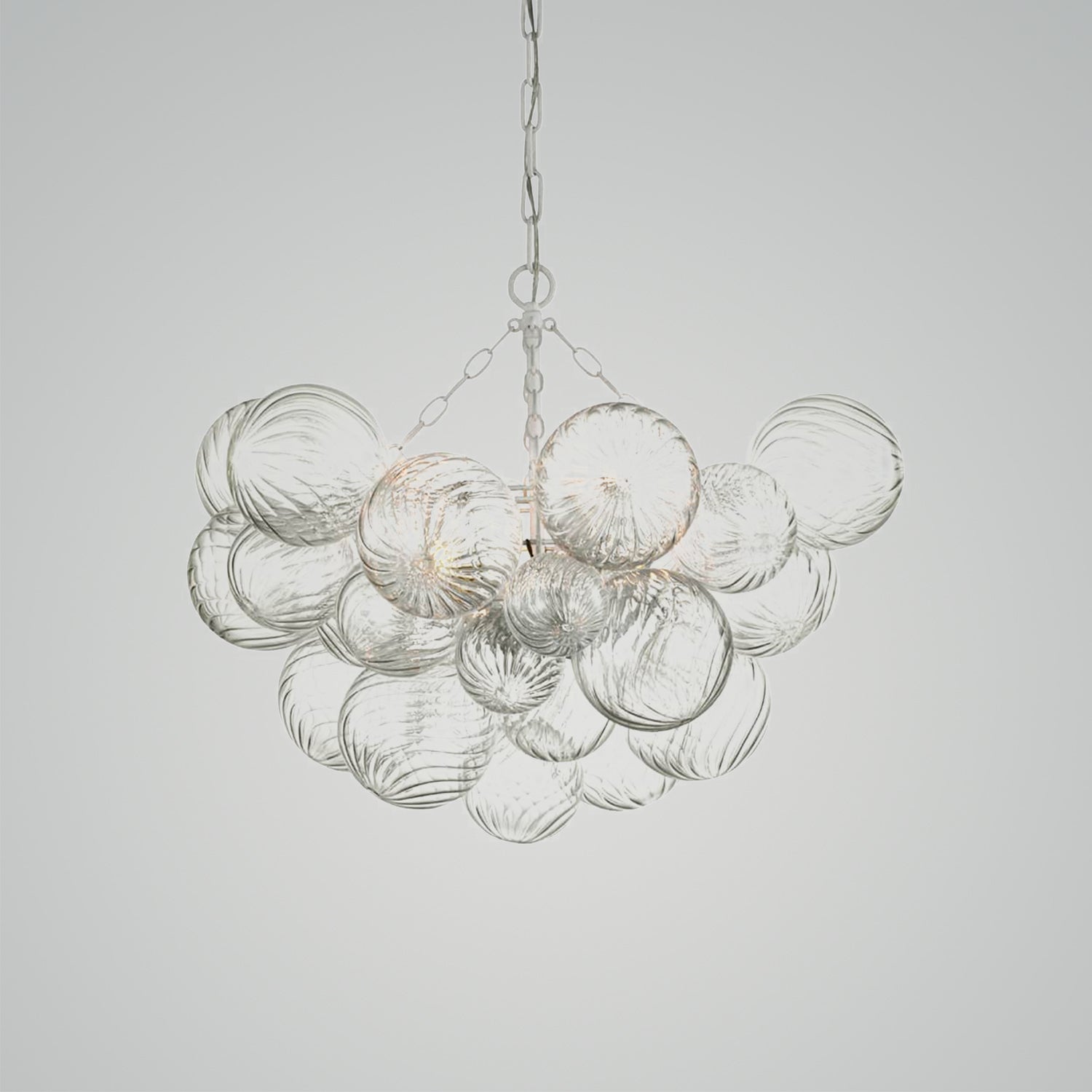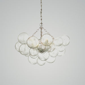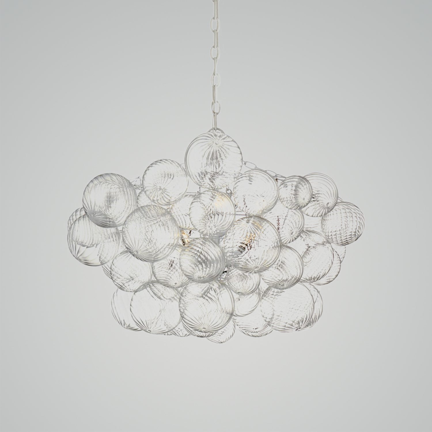 Handcrafted glass elevates a series of designs, giving new life to simple glass ball fixtures. Light flickers through multiple swirling glass orbs fixed in a metal basket, creating a whimsical atmosphere. The series offers various sizes and configurations, adding a dynamic combination of sparkling glass, round shapes, and bright metal to any interior space. Choose pendant lights for entryways and dining areas, or opt for recessed or wall lights for living spaces or bedrooms, adding a playful, feminine touch to any environment.