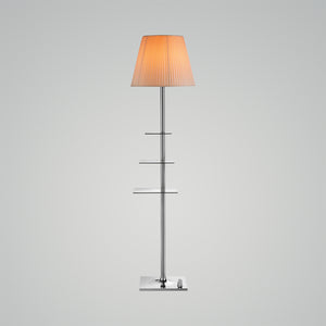 The floor lamp provides diffused light. The base, rod stand, and diffuser stand are made of chrome-plated die-cast zinc. The base cover is made of galvanized P04 steel sheet. The internal diffuser and lamp holder stand are made of opal-colored injection die-stamped PC. The external diffusers are available in matching PVC fabric, injection die-stamped clear or smoke-grey methacrylate, or in silver or bronze on the inner surface through vacuum aluminum coating. The upper ring is made of clear injection die-stamped PC. The brackets are made of polished stainless steel. A USB outlet on the base enables the charging of common smartphones and tablets (max 2A).