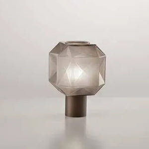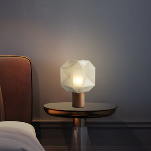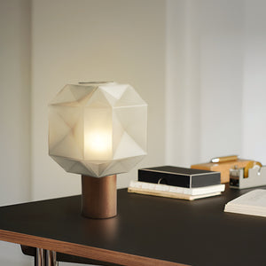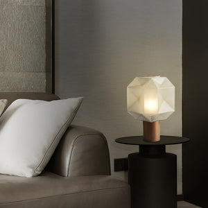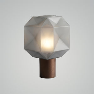 The Cubo Table Lamp is a modern marvel of interior lighting design. Its diamond-cut, faceted shade captivates with a dynamic display of light and shadow, casting an array of intricate patterns across your room. Resting on a sturdy, dark wood base, this lamp combines the earthy warmth of natural materials with the cool sophistication of contemporary style. The glow from within highlights the geometric precision of the lampshade, making it a perfect statement piece for any desk, nightstand, or reading area. Ideal for those who appreciate the art of design and the subtleties of light, the Geometric Brilliance Table Lamp brings a touch of avant-garde elegance to your home.