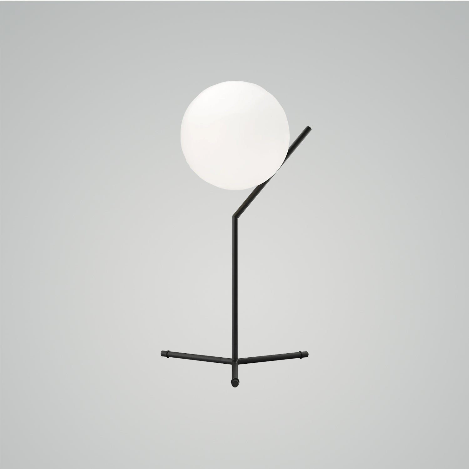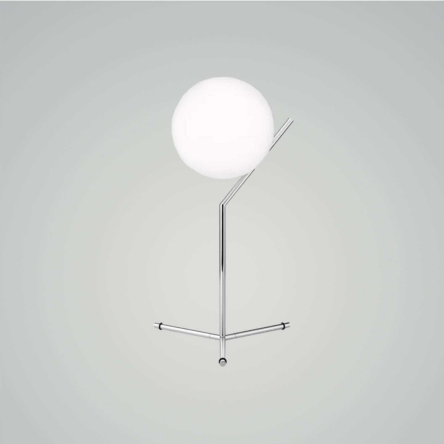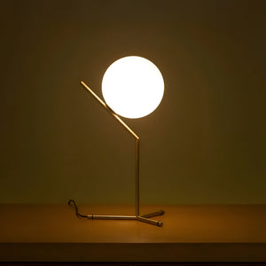 This is a table lamp that provides diffused light. The frame is made of brass, with a brushed finish and transparent varnish, or chrome steel and black. It features a blown opal glass diffuser. There is a dimmer on the power cord.