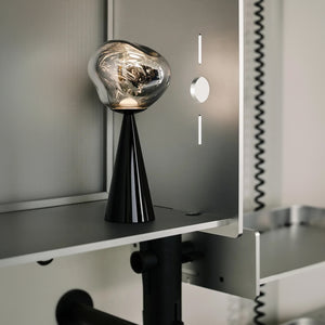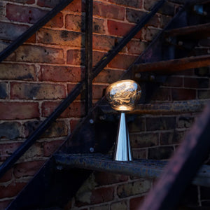 The portable LED expands the collection, offering the same captivating hot-blown glass effect in a portable design. It is inspired by molten glass, the core of a melting glacier, and deep space. The portable LED is available in a variety of finishes.