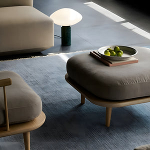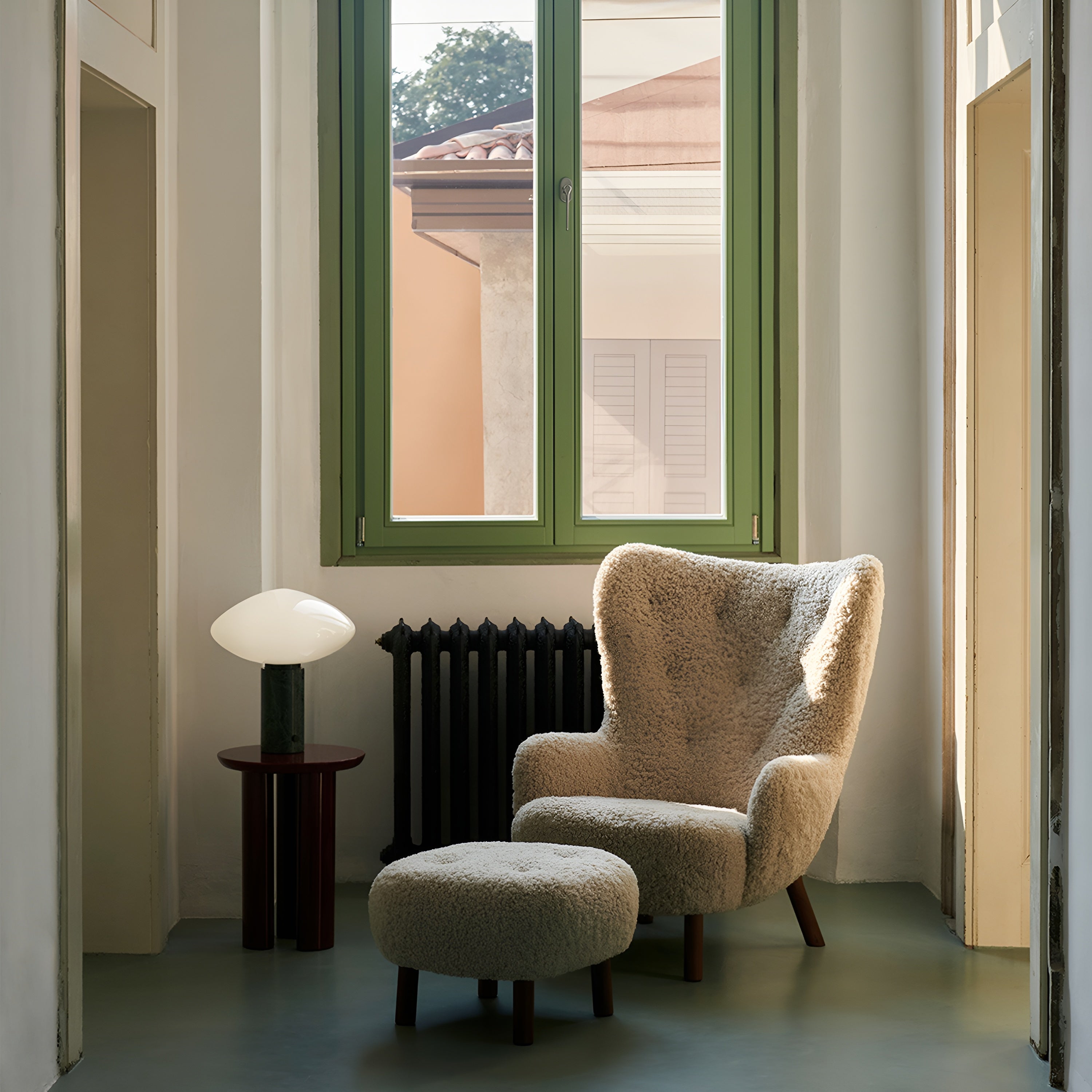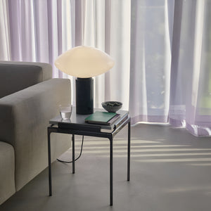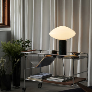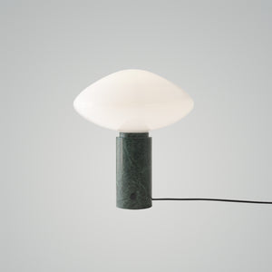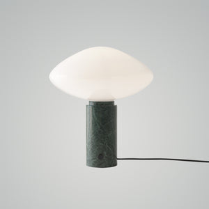 The Mist table lamp is made of hand-blown opal glass, featuring a thick marble column and a small dimmer switch. The lightweight shape of the glass contrasts sharply with the solidity of the marble, creating an elegant design rich in texture and character.