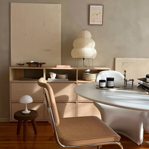 The "Akari Series" is regarded as a classic of modern design, handcrafted by Japanese washi artisans. These paper lanterns skillfully blend traditional Japanese craftsmanship with modernist aesthetics, utilizing handmade washi and bamboo ribbing, complemented by a metal frame to showcase a simple and elegant design.