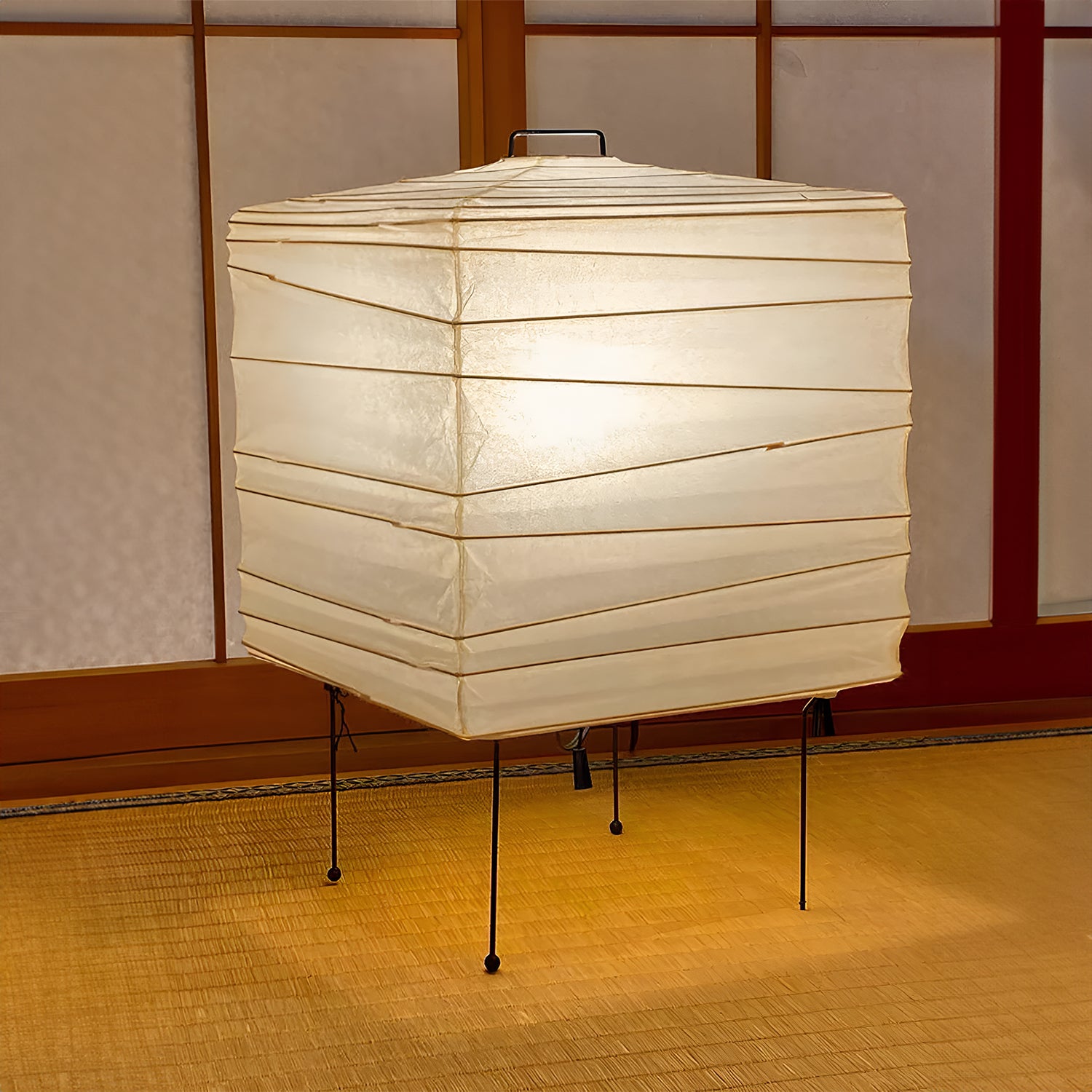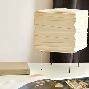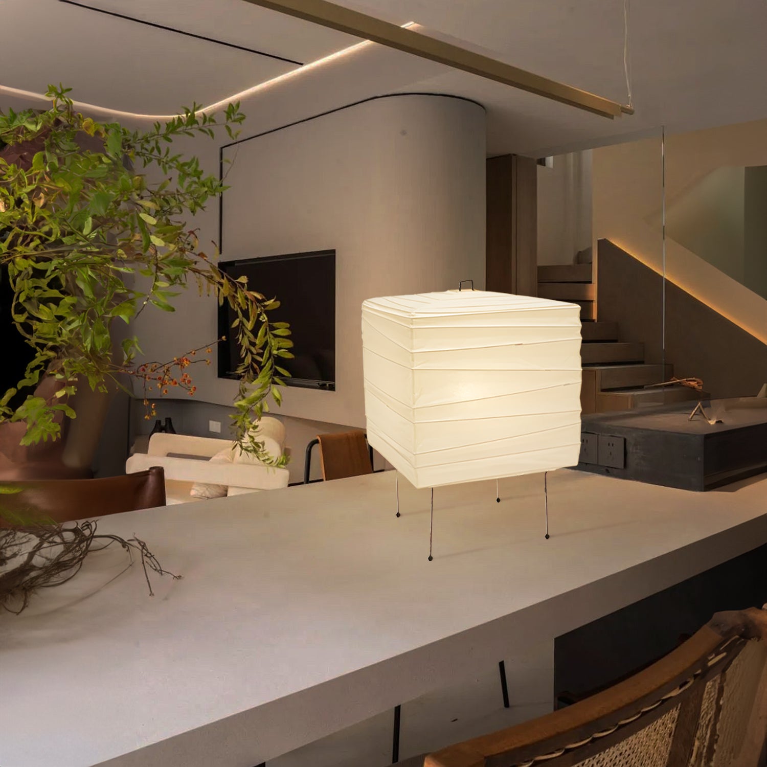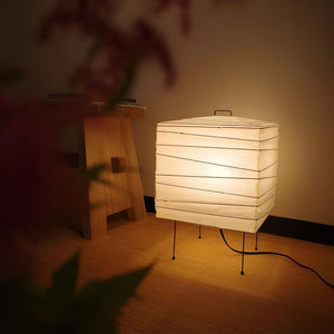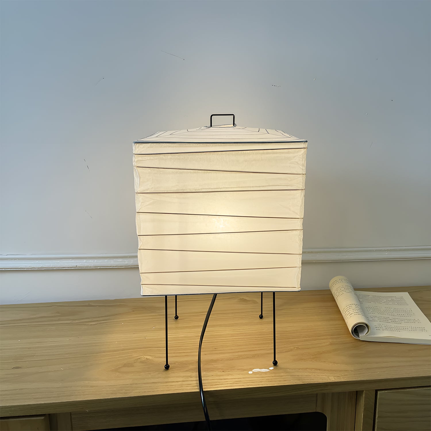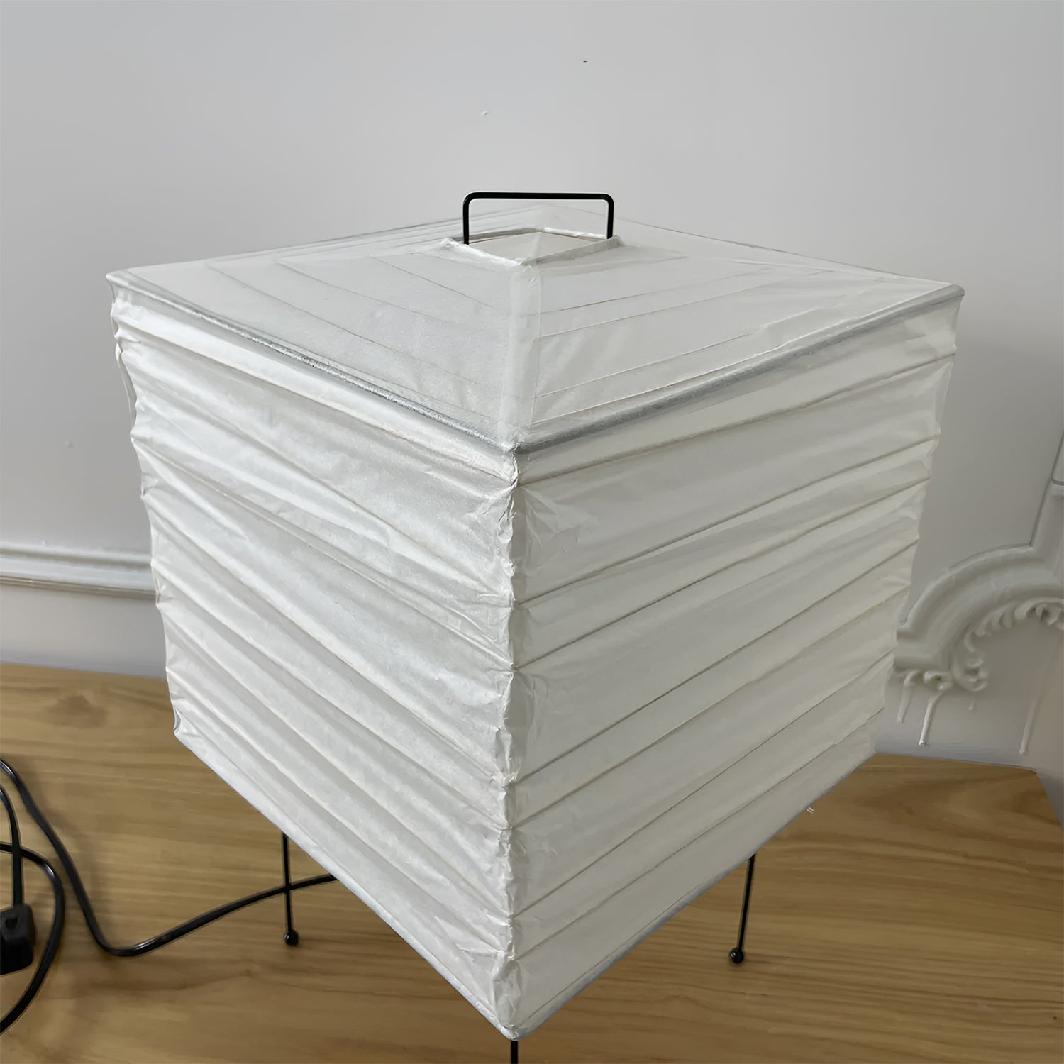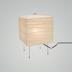 Embrace minimalist chic with the Akari 3X Table Lamp, where functionality meets sculptural design. This lamp's cubic form offers a modern twist on classic paper lanterns, with each crease and fold in the shade adding depth and character to its light. Its delicate yet sturdy black wire legs create a lightweight appearance, making the cube of light seem as if it's floating. Topped with a small, practical handle, this lamp hints at both its portability and thoughtful design.