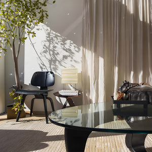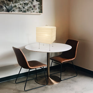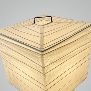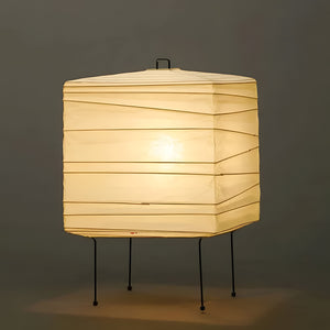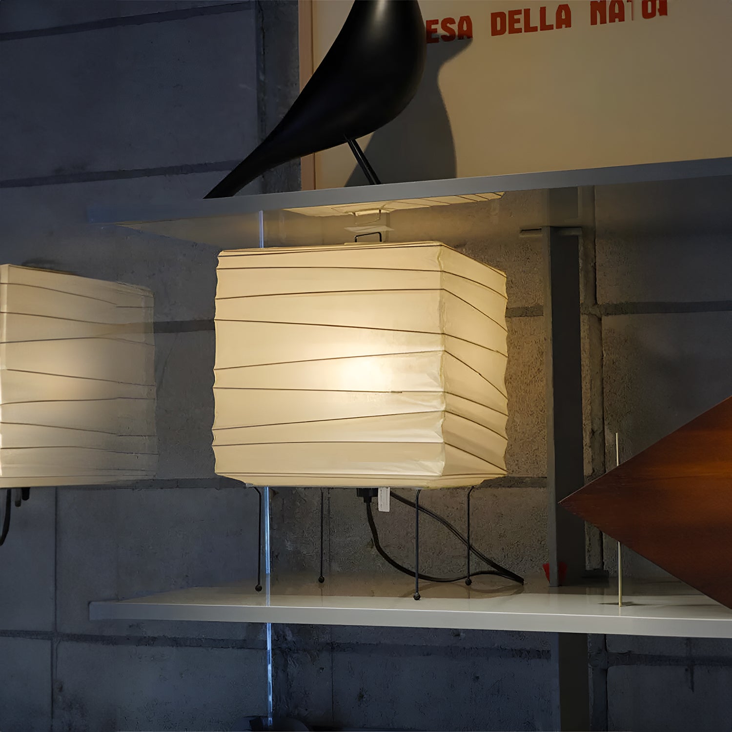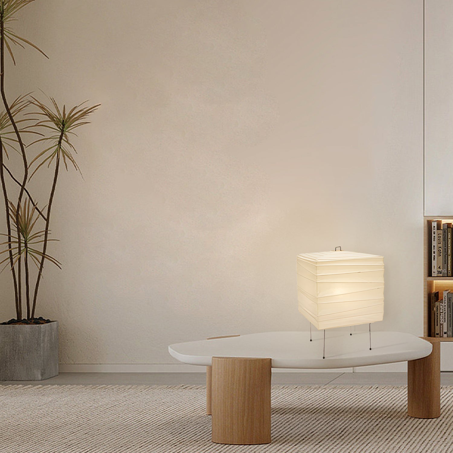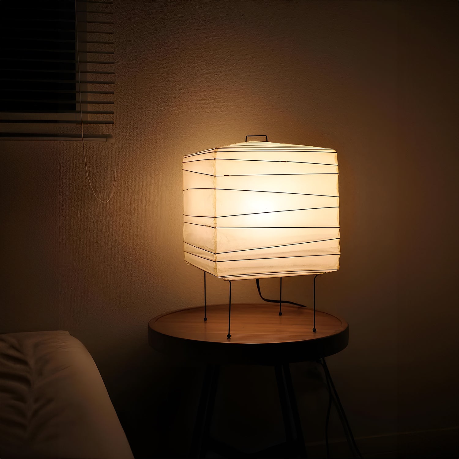 Embrace minimalist chic with the Akari 3X Table Lamp, where functionality meets sculptural design. This lamp's cubic form offers a modern twist on classic paper lanterns, with each crease and fold in the shade adding depth and character to its light. Its delicate yet sturdy black wire legs create a lightweight appearance, making the cube of light seem as if it's floating. Topped with a small, practical handle, this lamp hints at both its portability and thoughtful design.