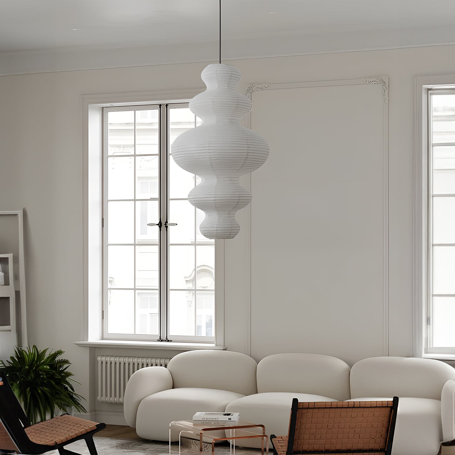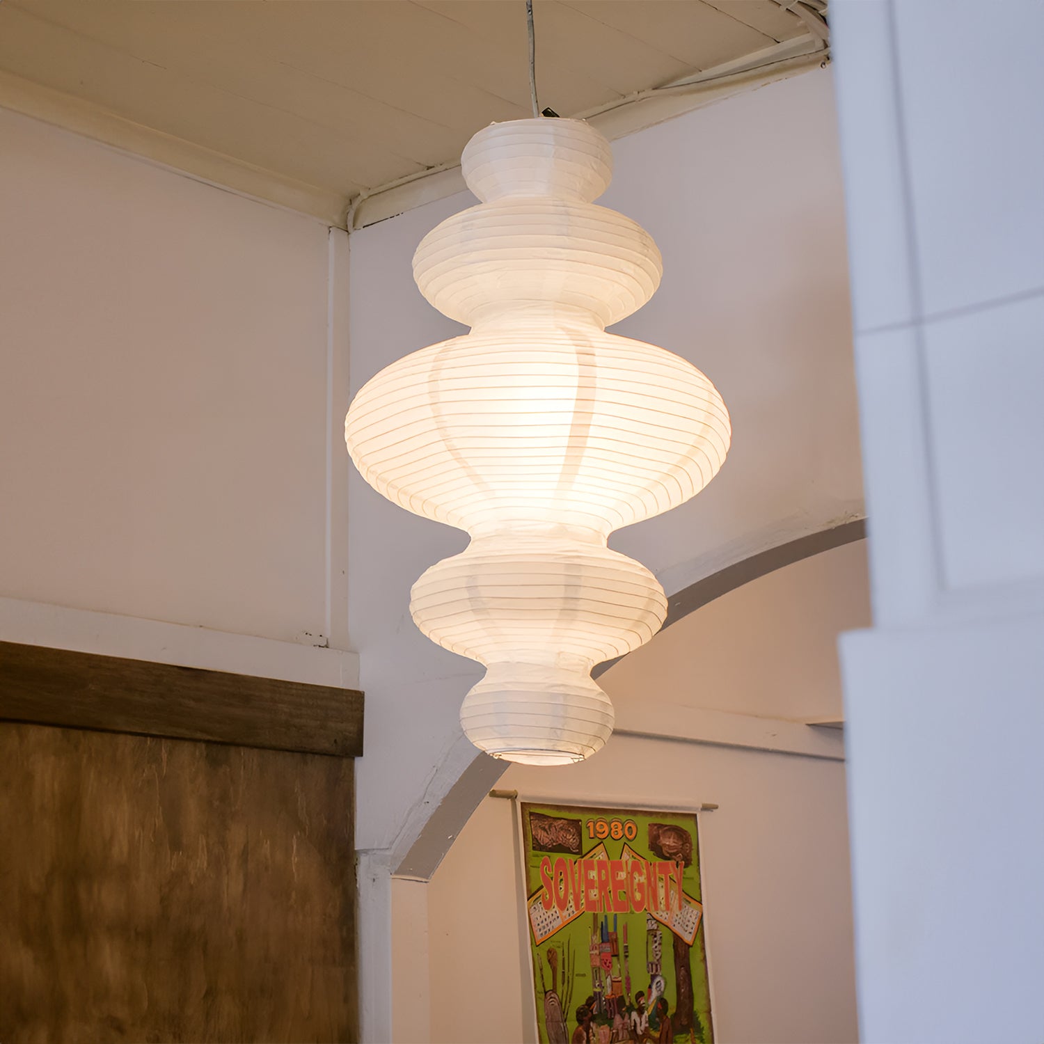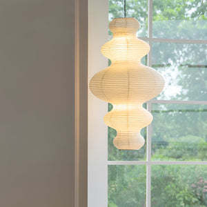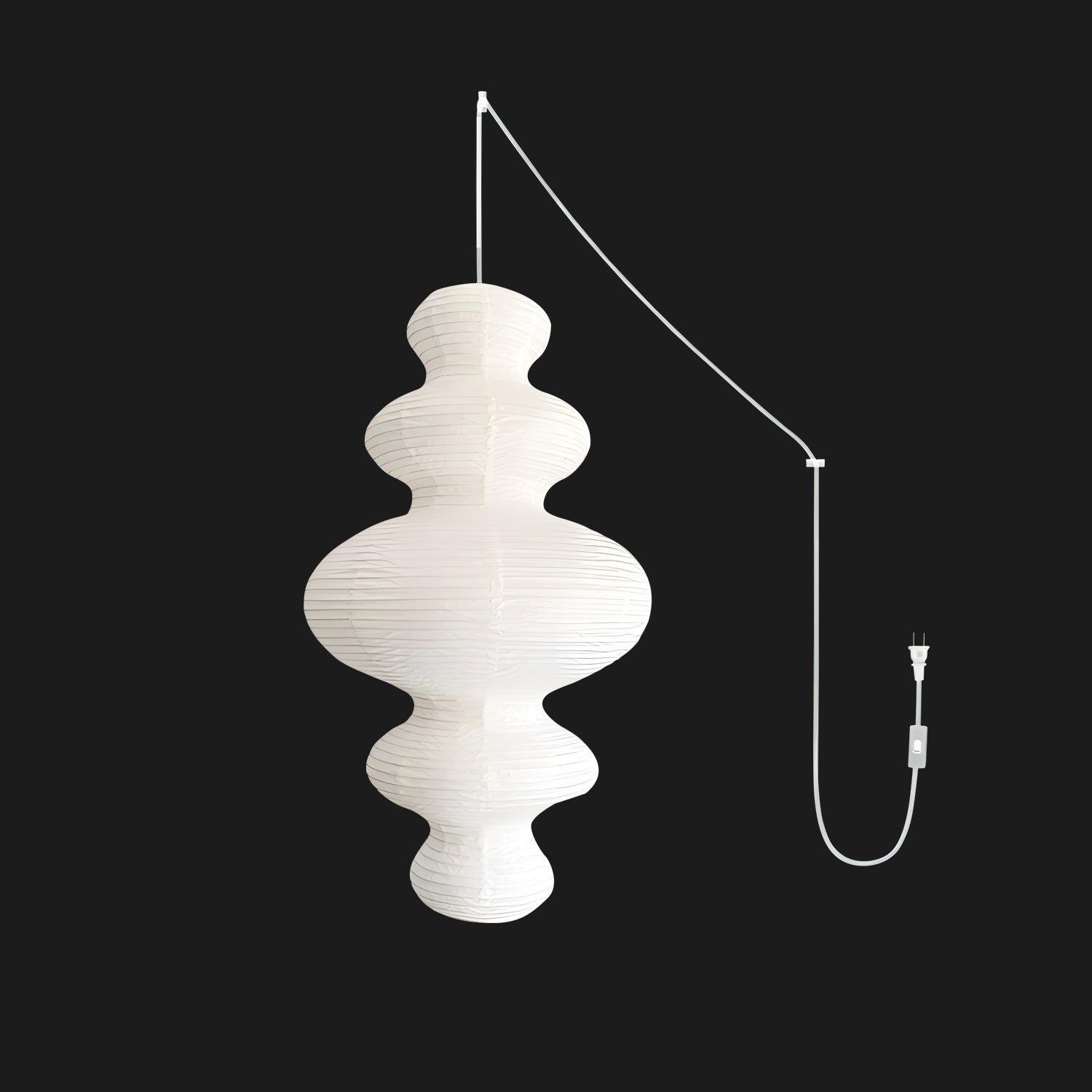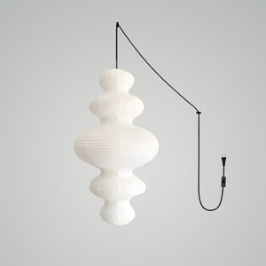Elevate your interior with the Akari Juni Plug In Pendant Lamp, a stunning statement piece that combines modern sophistication with a touch of celestial beauty. This unique hanging lamp features an intricate, sculptural white paper shade that diffuses light beautifully, creating a soft, ethereal glow. The elegant black suspension arm adds a contemporary flair, making it perfect for dining areas, living rooms, or entryways. With its eye-catching design and ambient illumination, the Akari Juni Plug In Pendant Lamp transforms any space into a serene and stylish haven. Illuminate your home with the celestial charm of this extraordinary pendant light.