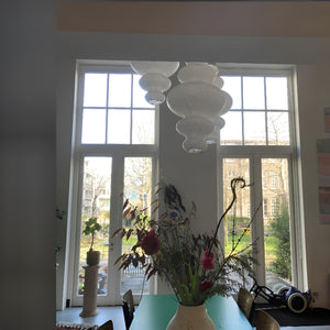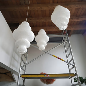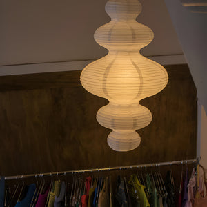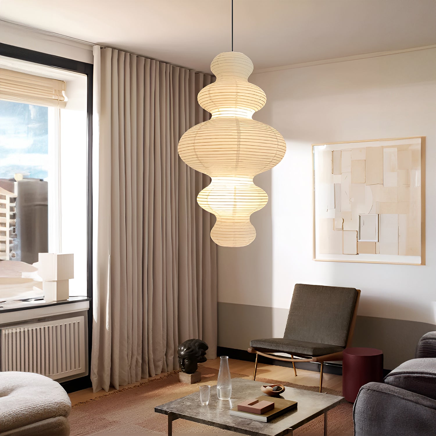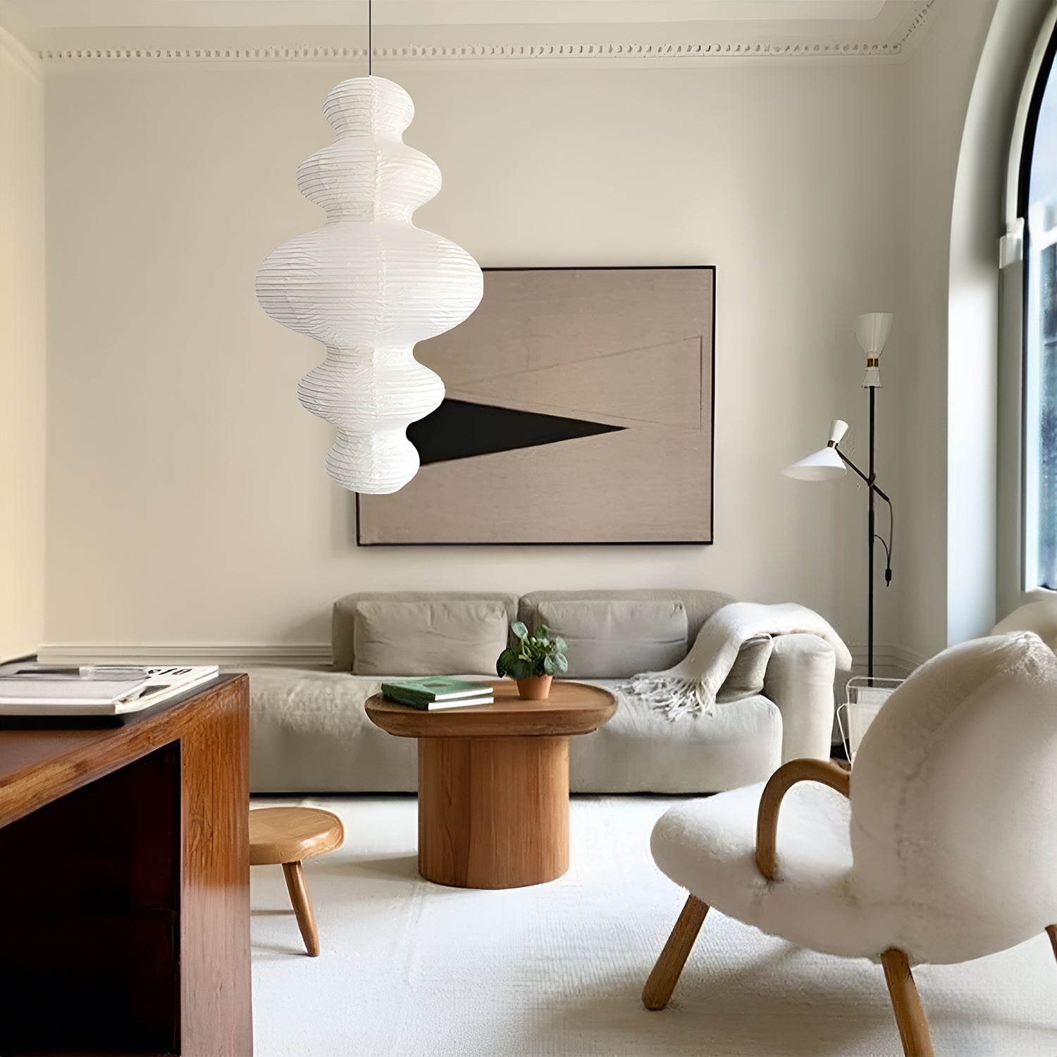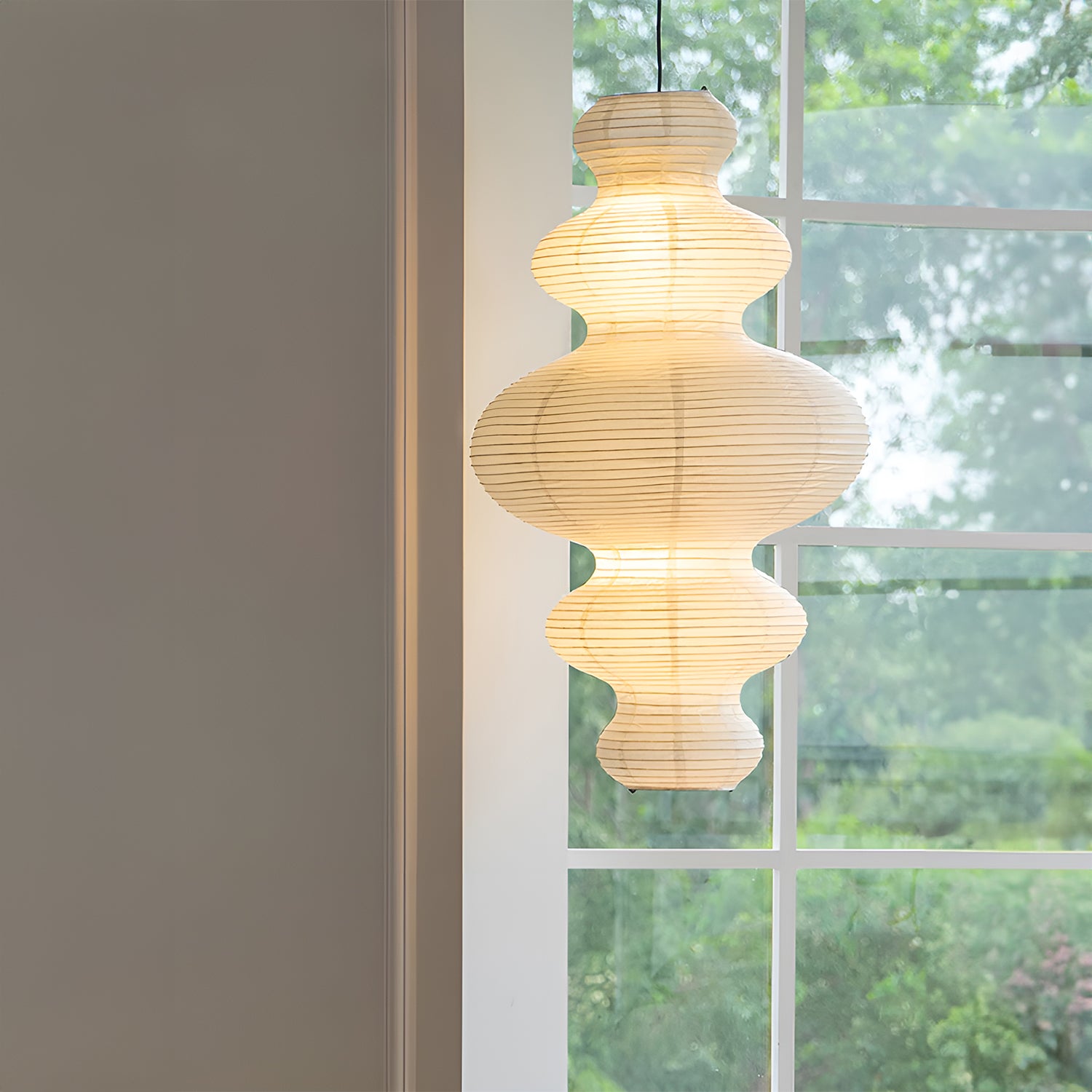 Elevate your interior with the Akari Juni Plug In Pendant Lamp, a stunning statement piece that combines modern sophistication with a touch of celestial beauty. This unique hanging lamp features an intricate, sculptural white paper shade that diffuses light beautifully, creating a soft, ethereal glow. The elegant black suspension arm adds a contemporary flair, making it perfect for dining areas, living rooms, or entryways. With its eye-catching design and ambient illumination, the Akari Juni Plug In Pendant Lamp transforms any space into a serene and stylish haven. Illuminate your home with the celestial charm of this extraordinary pendant light.