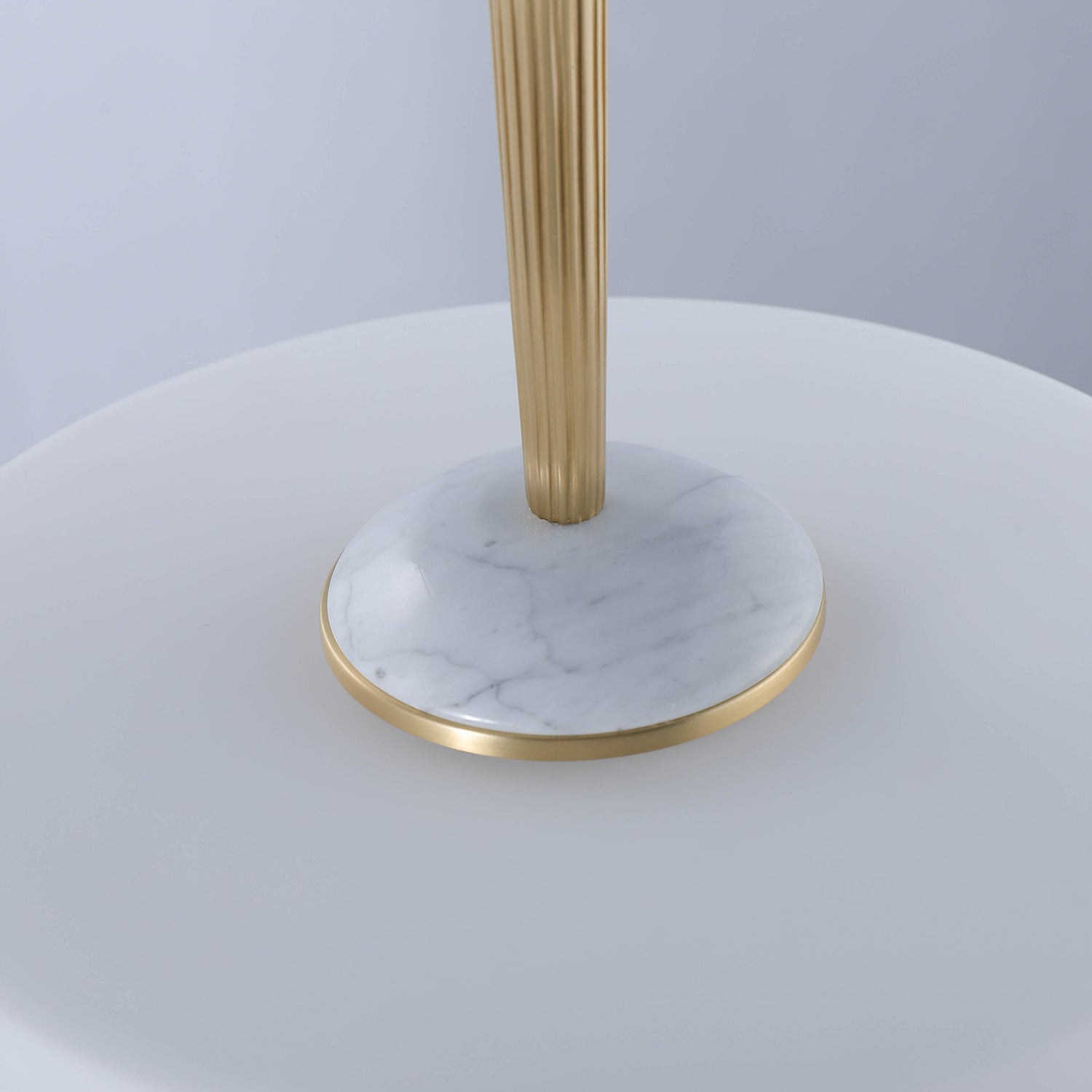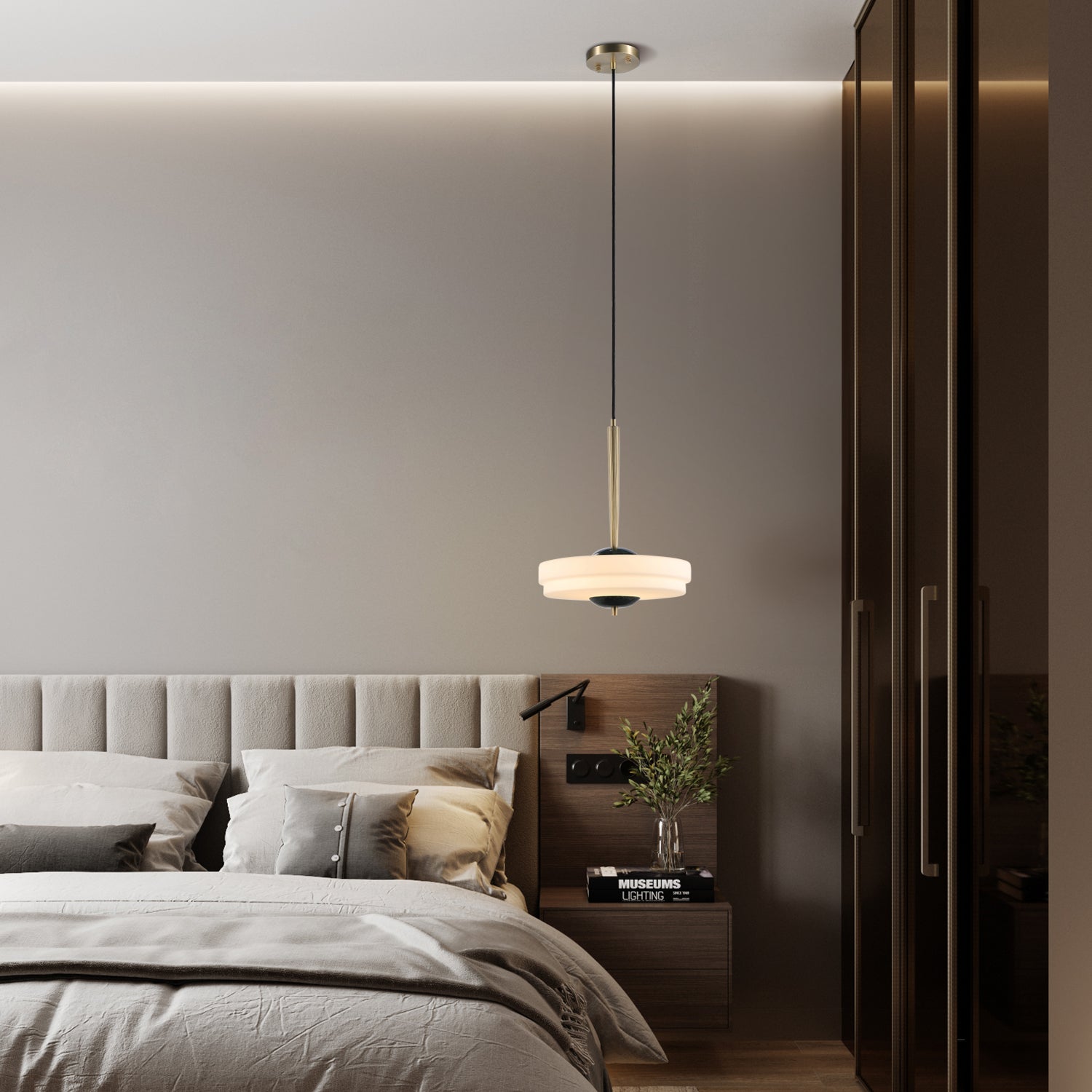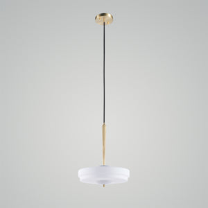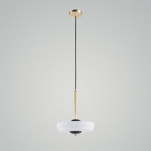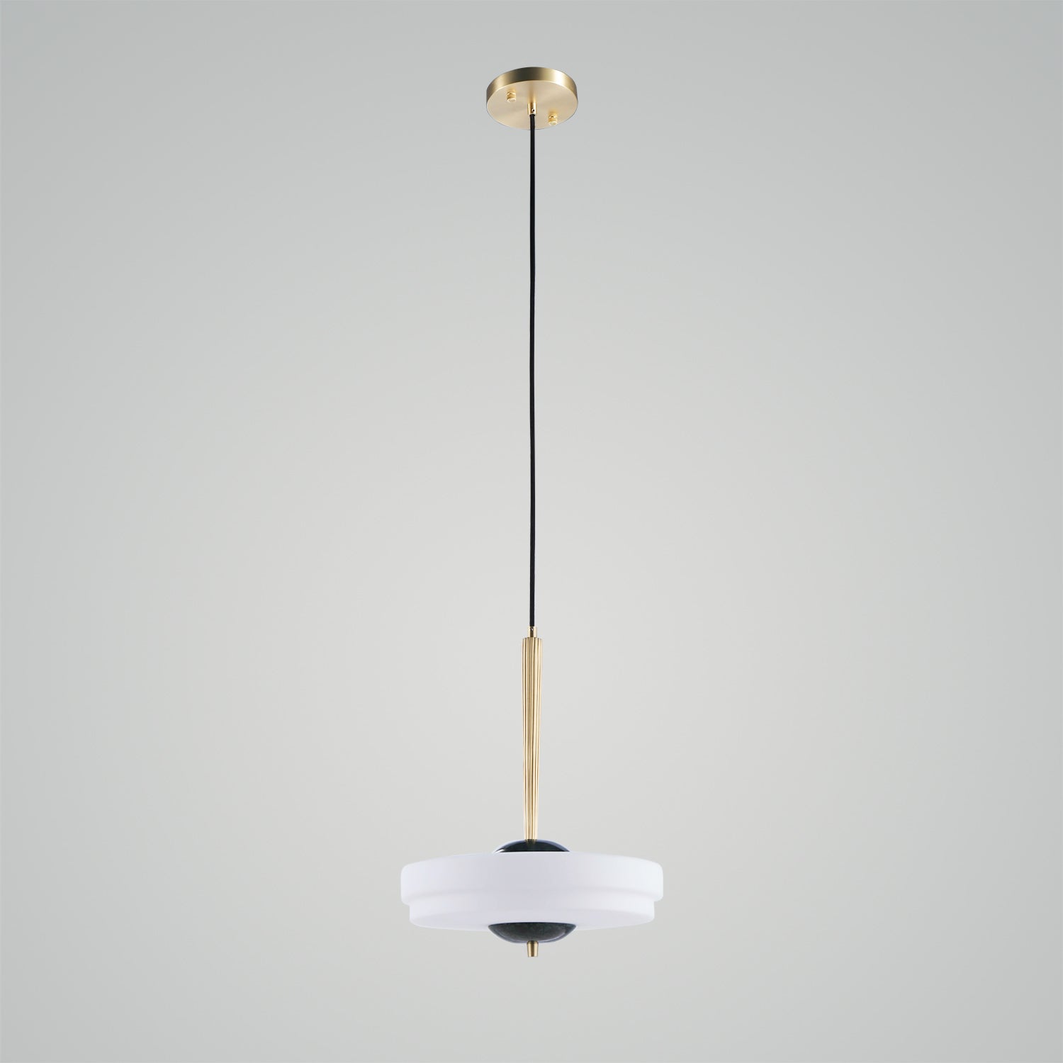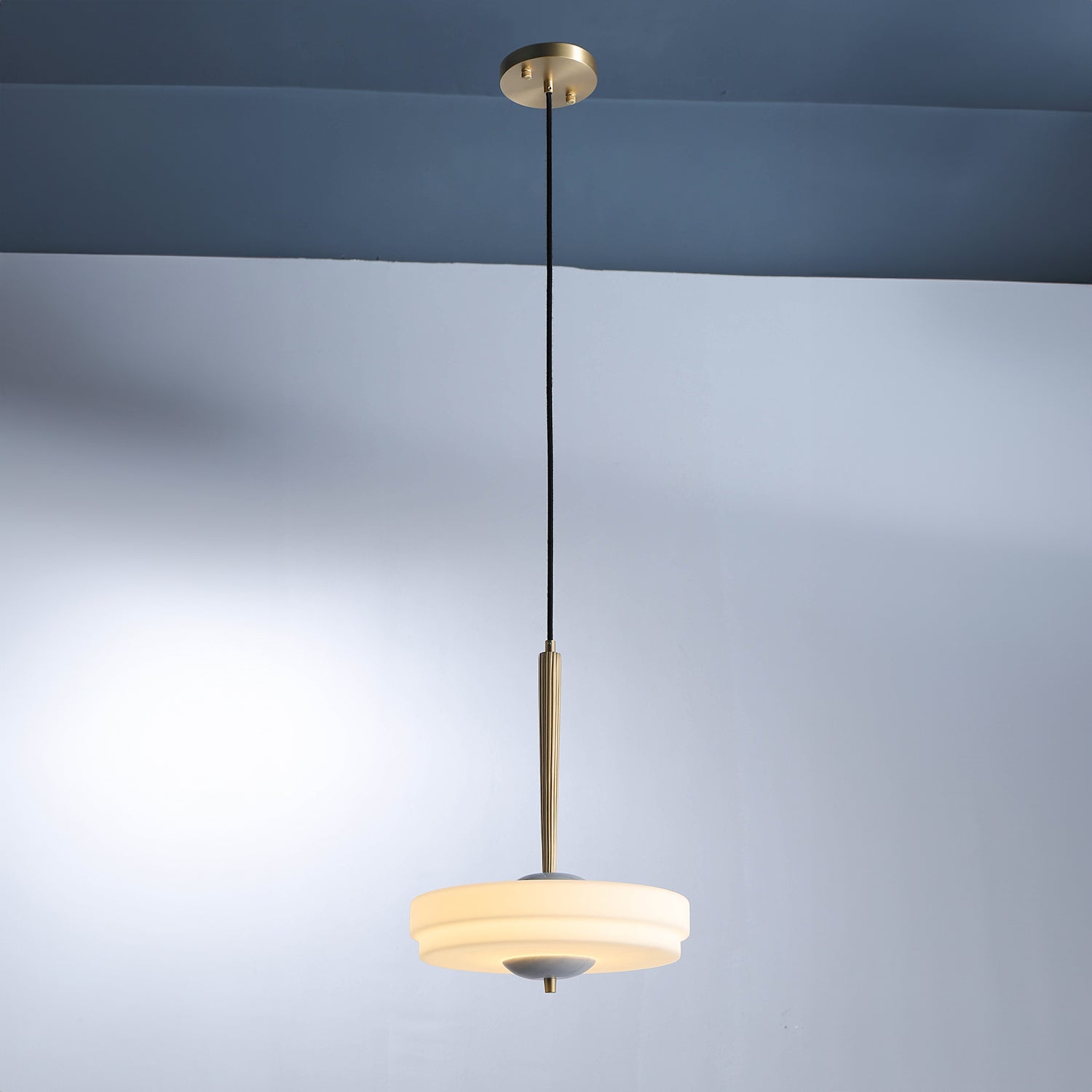 The pendant light emits a soft, ambient glow through its two-tiered opal glass shade, which surrounds a marble sphere. A fluted brass stem with ridged detailing extends from the top, concealing the cord while adding an elegant touch. The luxurious design is inspired by the opulent geometric motifs of the Art Deco era. The light comes with a canopy to cover a standard US junction box.