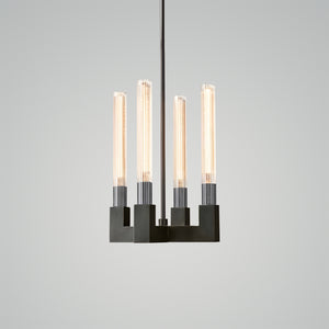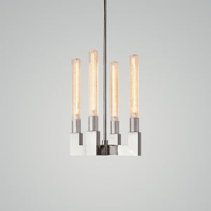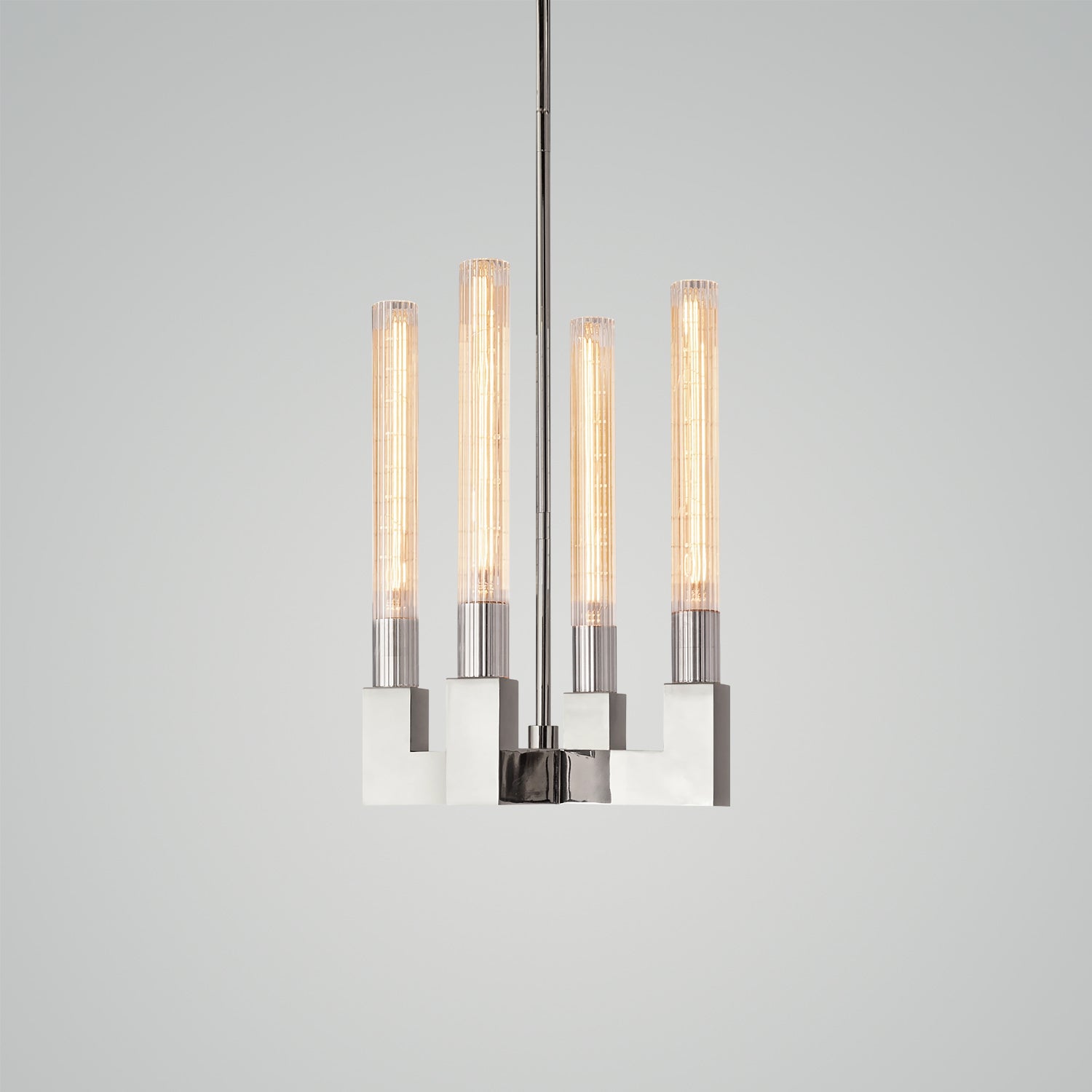 A renowned lighting designer has reinterpreted this Beaux Arts chandelier, crafted from solid brass. The fixture is characterized by clean lines and sharp angles, with elegant ribbed-glass shades that showcase Edison filament bulbs, shimmering like candlelight.