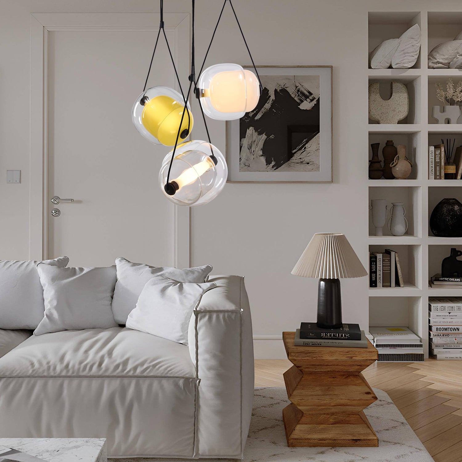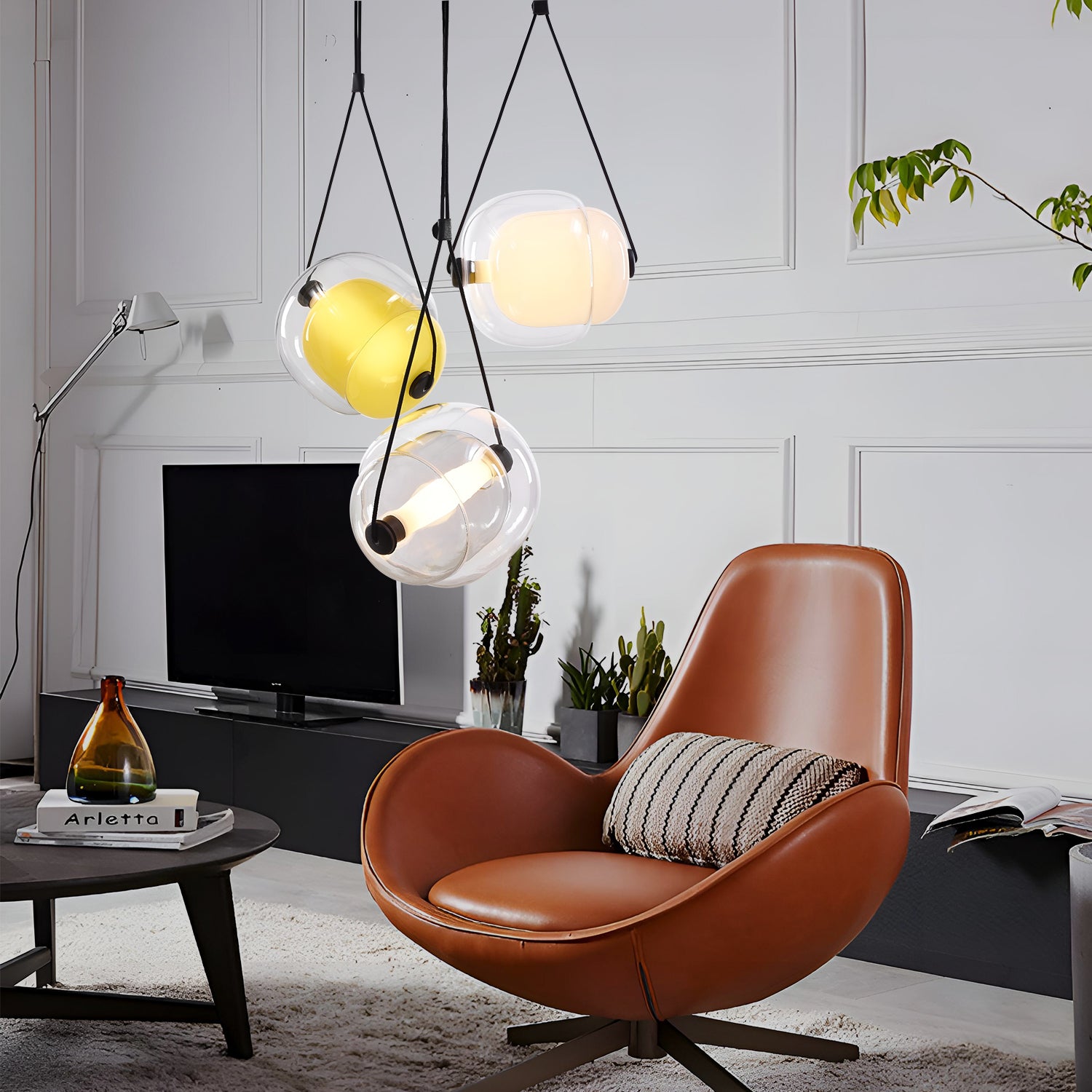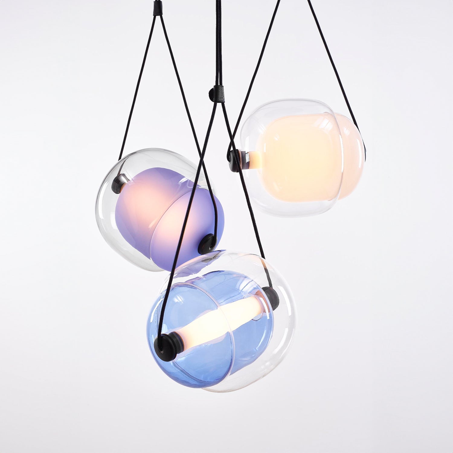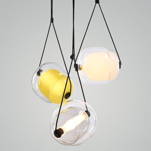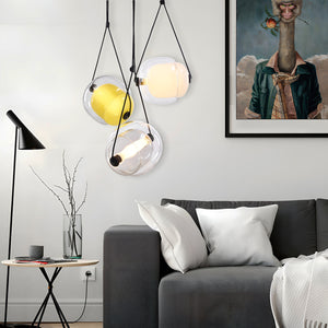 Introducing the "Capsula Pendant Light," an exquisite lighting ensemble that captures the essence of celestial beauty. This trio of glass orbs, each with a unique tint ranging from a golden sunrise to a deep sunset, casts a gentle, diffused light, reminiscent of the sky's natural gradients. These pendants hang gracefully at staggered heights, creating a dynamic and engaging display that will become the centerpiece of any room. The subtle glow from these lamps provides a warm and inviting atmosphere, perfect for intimate gatherings or quiet evenings at home. Let the Aurora Orb Trio Pendant illuminate your space with its enchanting and ethereal presence.