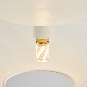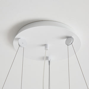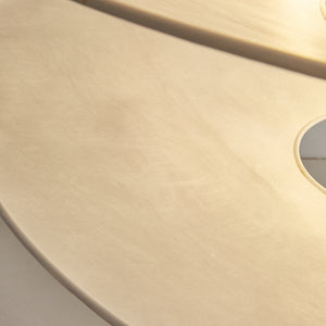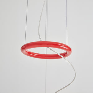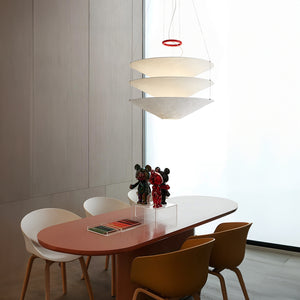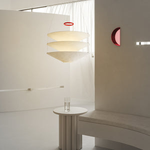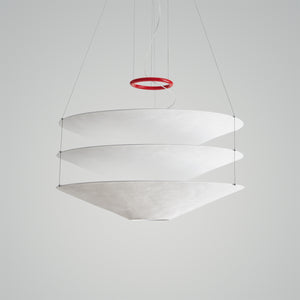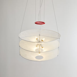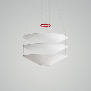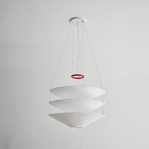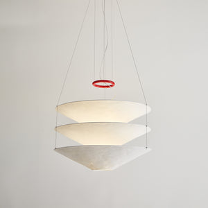 Designed in 1980, this suspension lamp features Japanese paper shades that create a warm, ambient glow. Three handcrafted shades are delicately suspended by thin metal cables, while a red iron ring serves as both a decorative element and a counterweight for height adjustment. The shades are intentionally crinkled, allowing the paper to respond to changes in humidity, which can affect their rigidity.