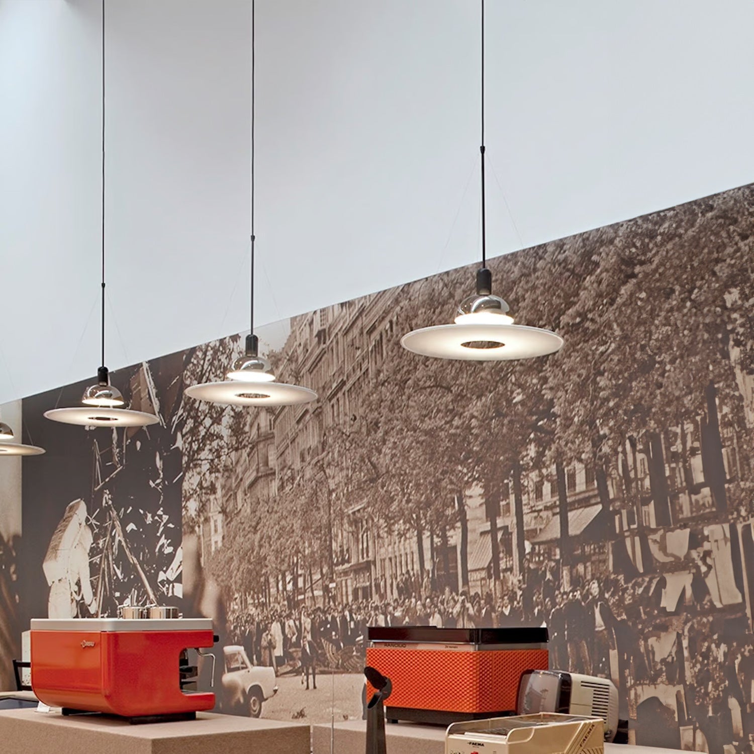 Frisbi is a suspension lamp that provides direct, diffused, and reflected light. Its opaline polymethyl methacrylate (PMMA) injection-molded diffuser plate is suspended by three fine steel cables. The stamped metal reflector is polished, nickel-plated, and coated with a protective varnish, with a glossy white finish on the inside. The ceiling fitting and canopy are made of black-painted, injection-molded ABS material.