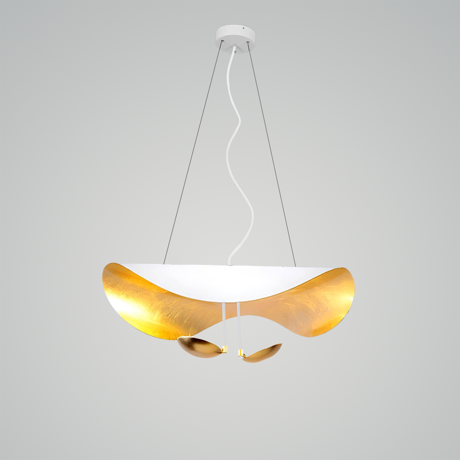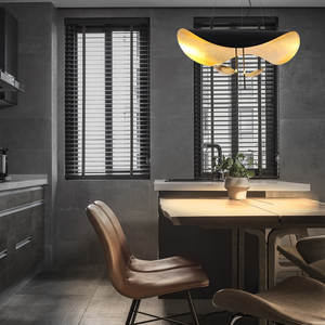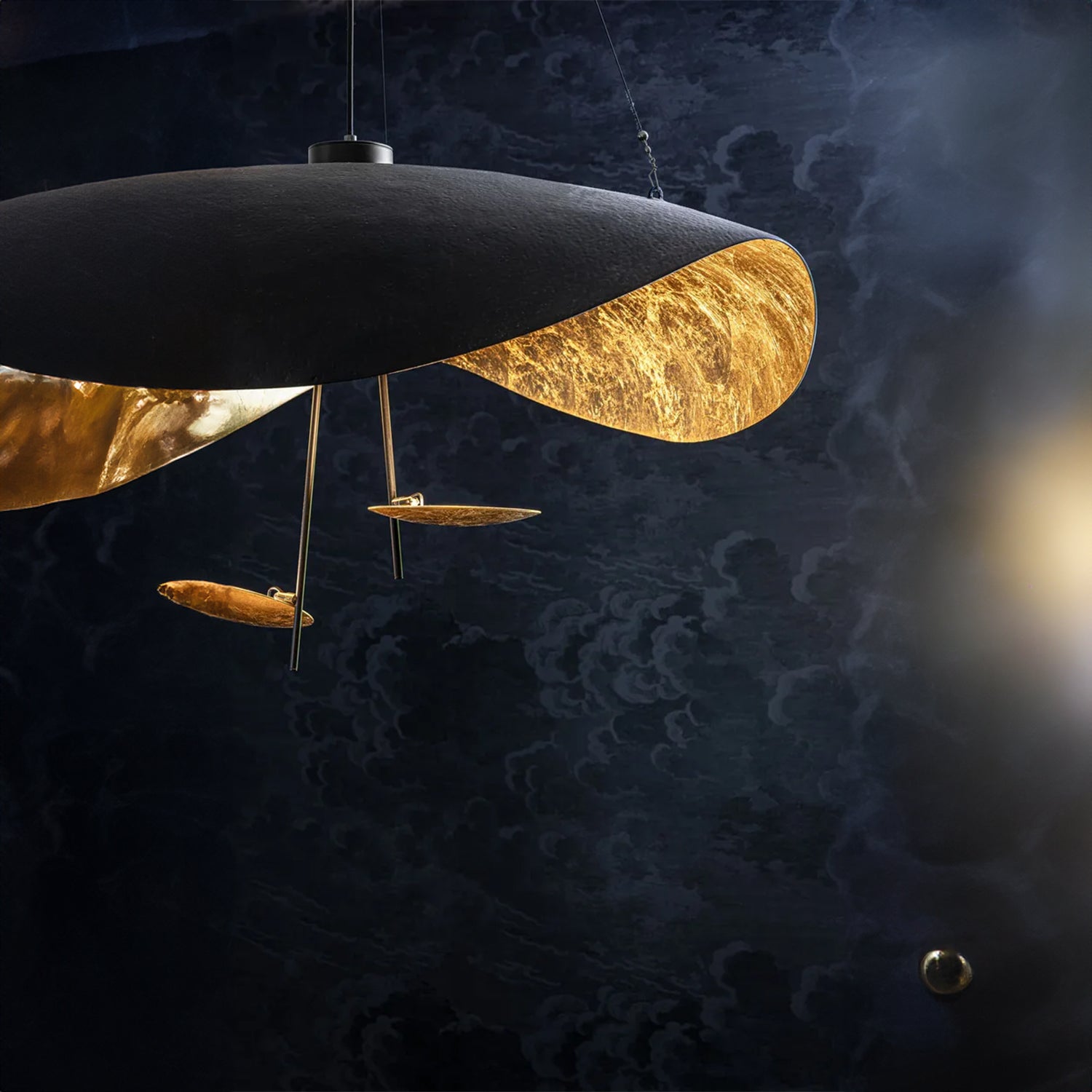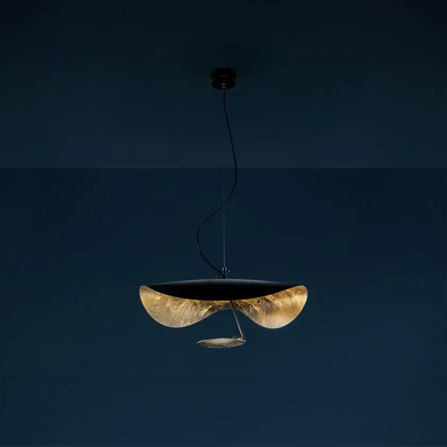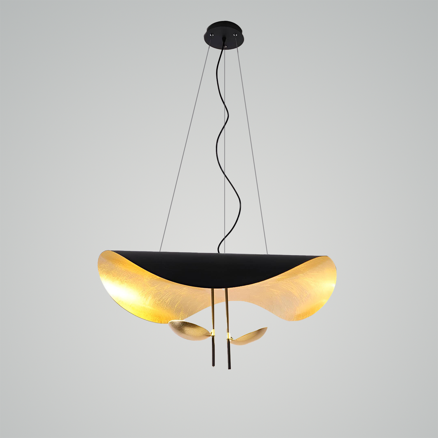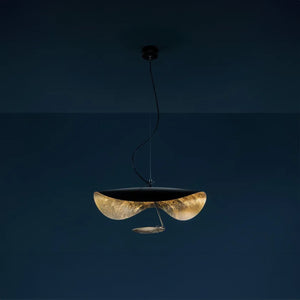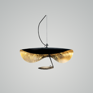 Introducing the "Giorgio Pendant Light," a masterpiece that captures the essence of modern elegance with a touch of celestial wonder. The sleek, black exterior of this pendant light is perfectly contoured to resemble the majestic manta ray, while its interior boasts a radiant golden finish that casts a warm, upward glow, reminiscent of the natural phenomenon of an aurora. This sophisticated light fixture is ideal for those who appreciate art in their lighting. It's not just a source of illumination; it's a conversation piece that adds a dramatic flair to any contemporary space. Illuminate your home with the luxurious warmth of the Aurora Crescent Pendant, where design meets the art of light.