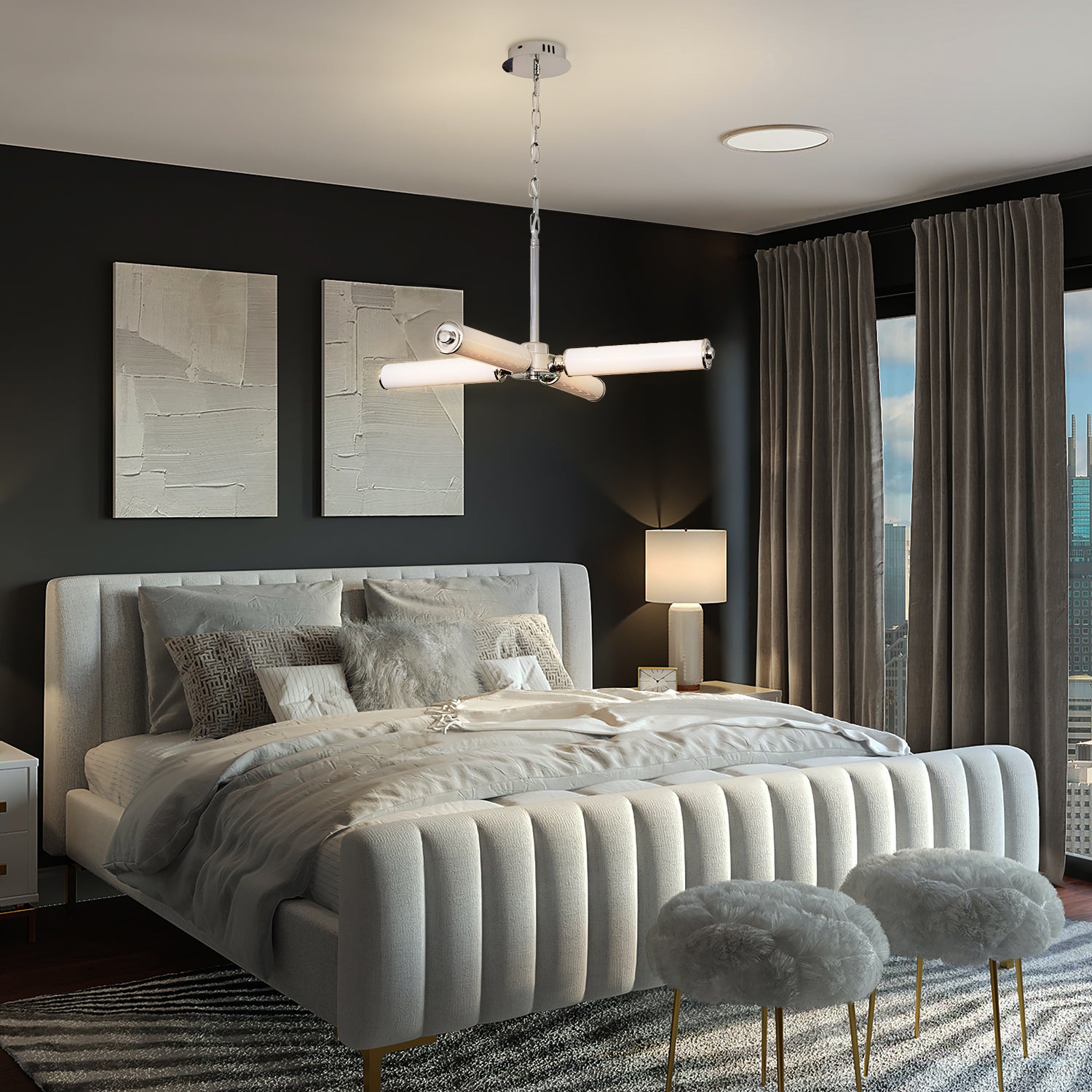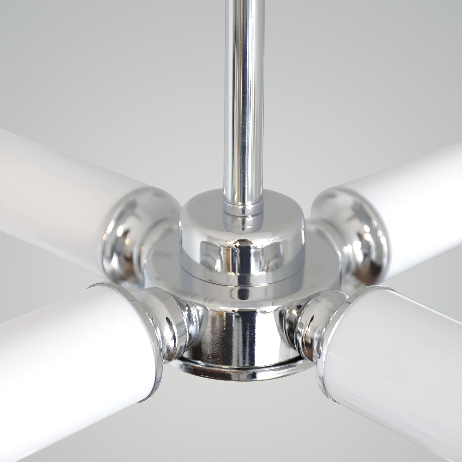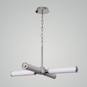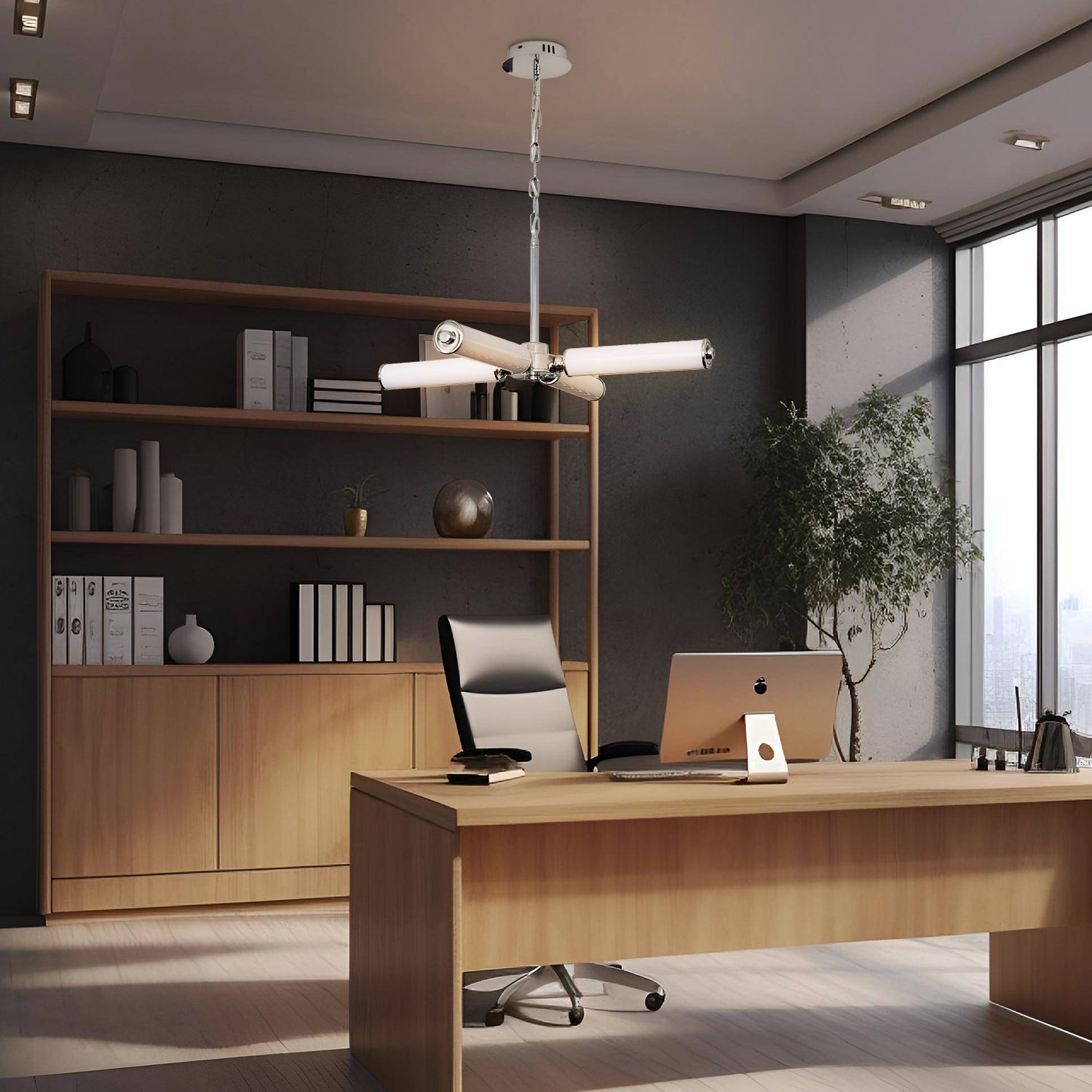 Introducing the "Huntington LED Chandelier," a sleek and modern solution for your lighting needs. This chandelier features a striking cross-shaped design, combining form and function in a unique, linear configuration. Each arm is equipped with energy-efficient LED tubes that provide a bright yet soft light, perfect for contemporary office spaces, dining rooms, or modern kitchens. The clean lines and polished chrome finish make it an easy addition to any space seeking a touch of modern elegance. With its adjustable chain, the Axis Lumina Pendant Light offers versatility and style, illuminating your space with a cool, understated glow.